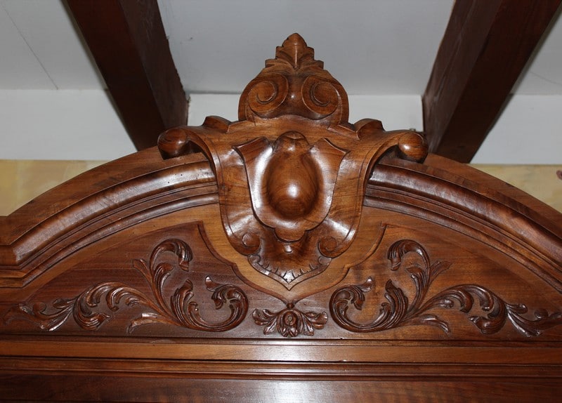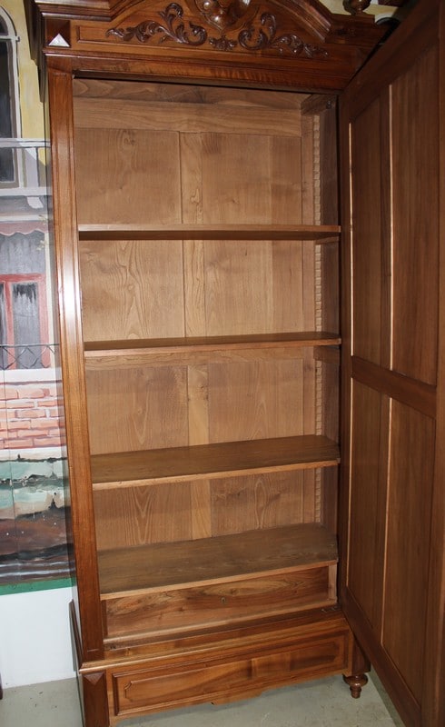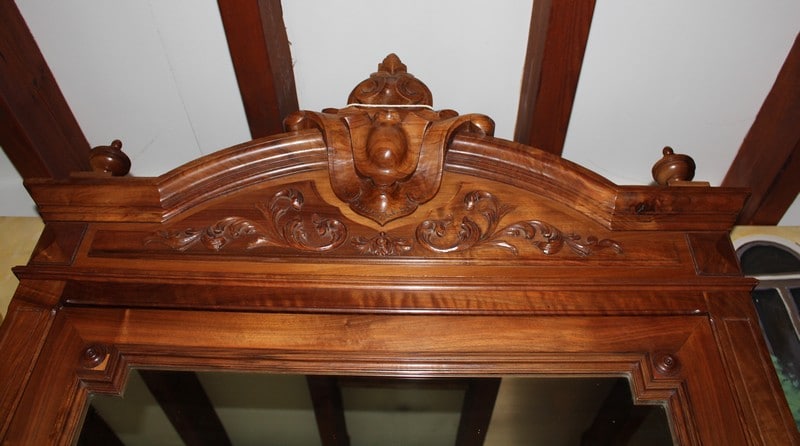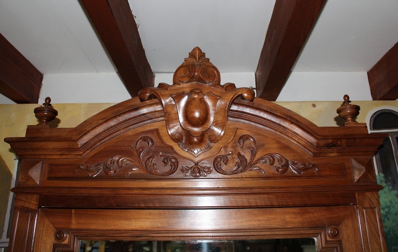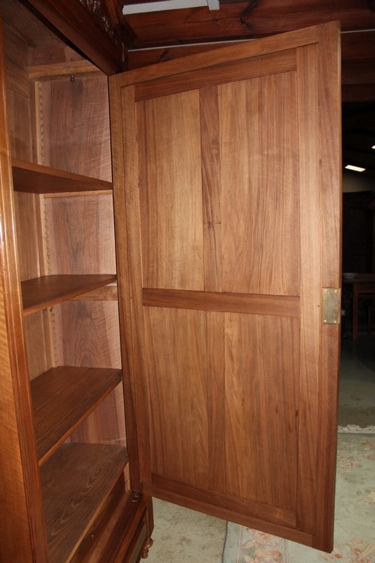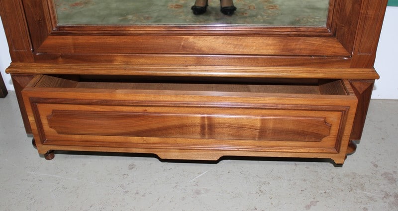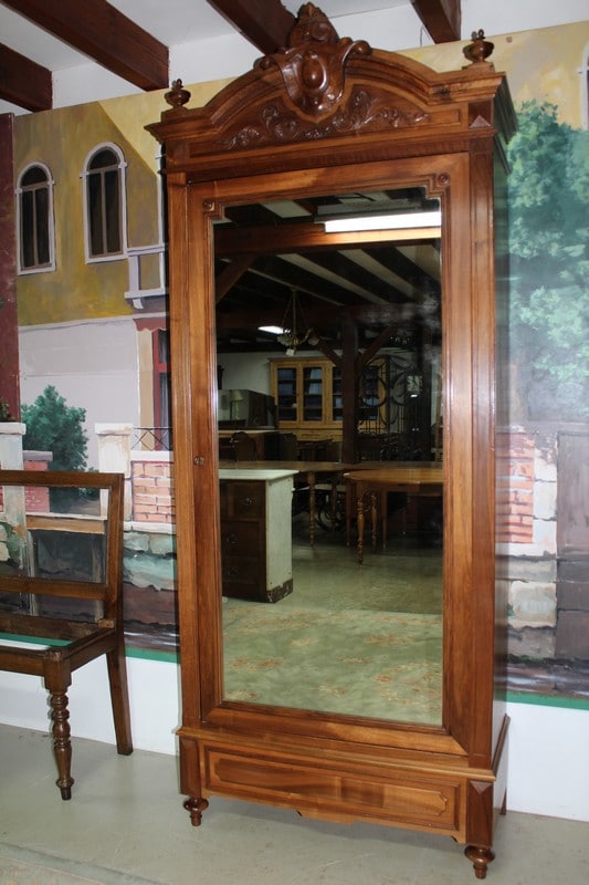 Armoire en noyer massif ouvrant par une porte à glace et un tiroir en partie basse. Fronton sculpté. Intérieur garni de 4 étagères et d’un tiroir. Époque 1920. Finition cirée.