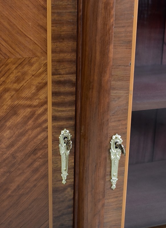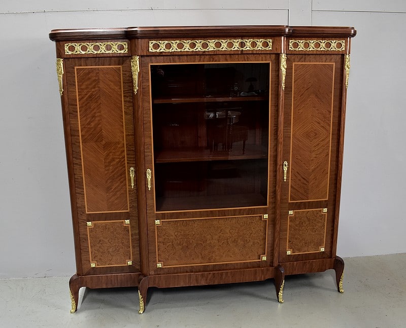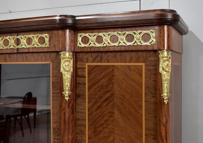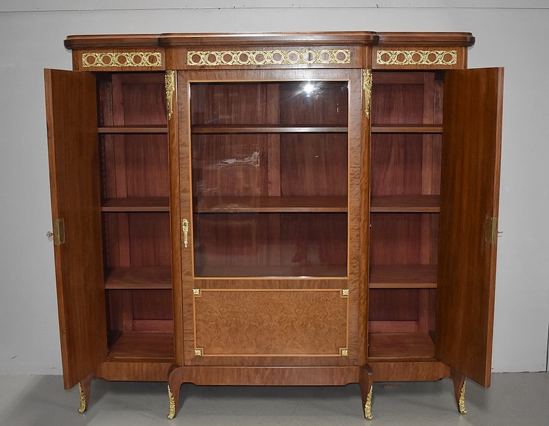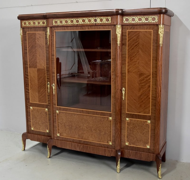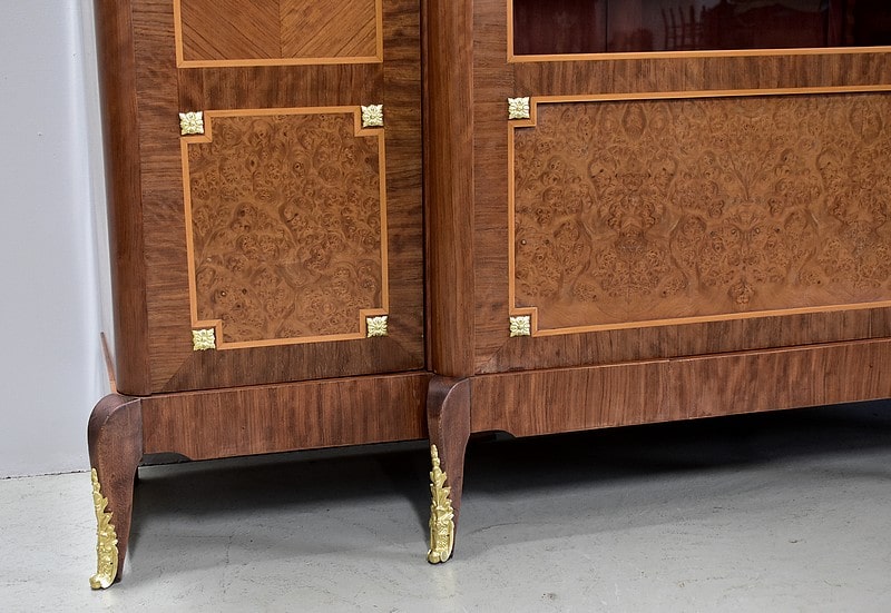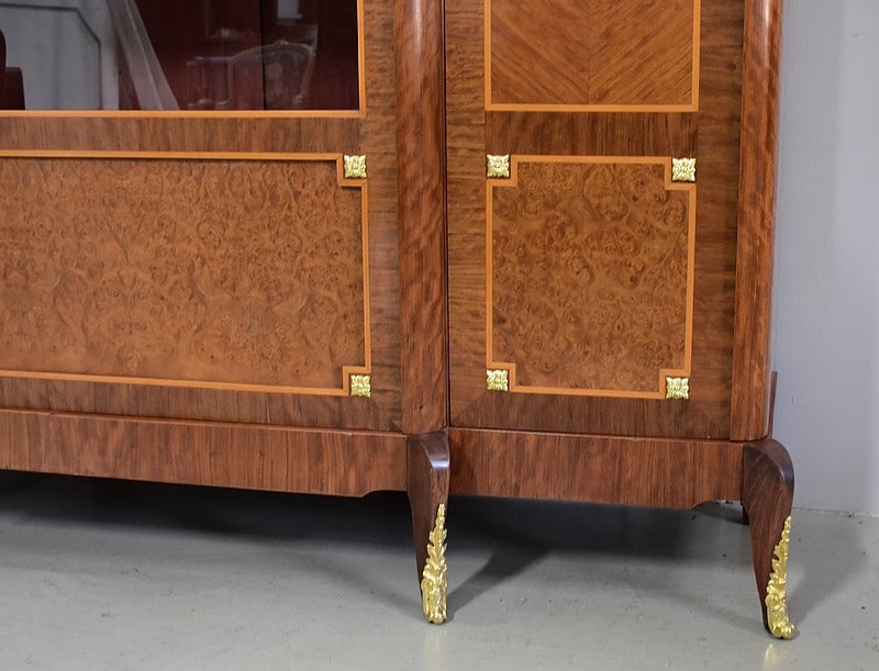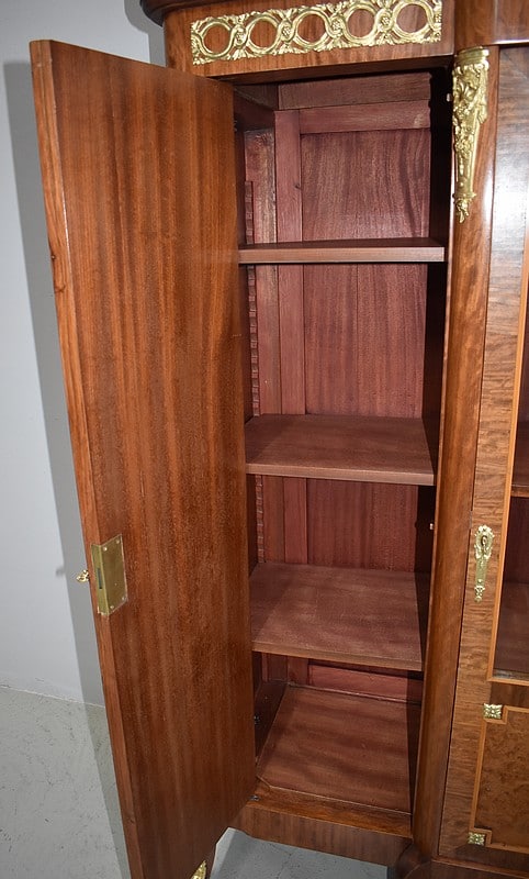 Armoire-Bibliothèque dans le goût Louis XV / Louis XVI en marqueterie d’acajou et de bois de rose avec filets de citronnier. Découpes à la ‘grecque’ en partie basse, entourant des panneaux en loupe de thuya.