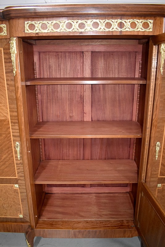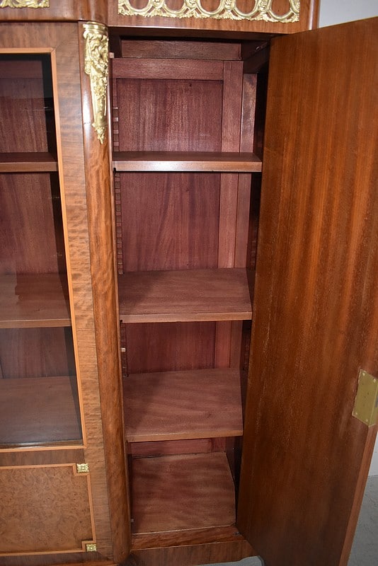 Son intérieur est garni de 3 étagères en placage d’acajou sur crémaillères. Le fond est également en acajou.