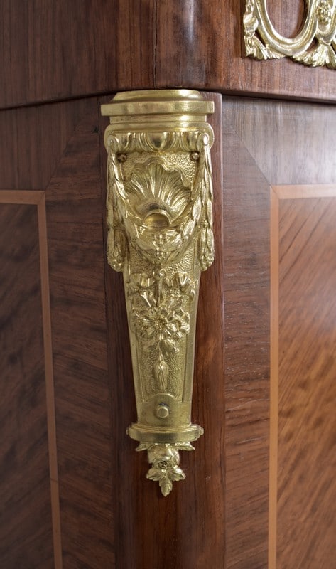 Elle est ornée de nombreux bronzes : frise sur la corniche, chutes sur les 4 montants, entrées de serrures, mascarons dans les découpes et sabots sur les 4 pieds avants galbés. Les 4 pieds arrières sont droits.