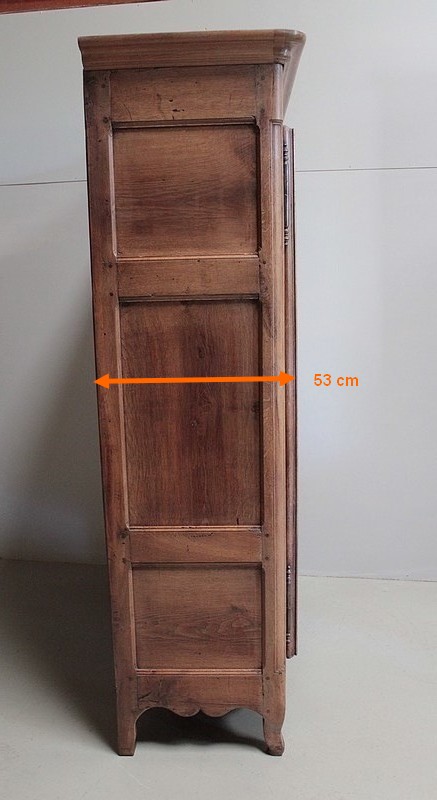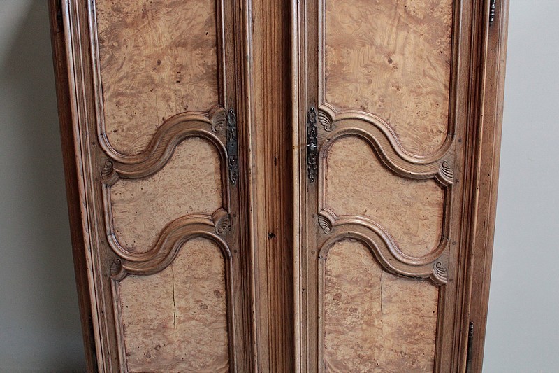 Armoire de style Louis XV en chêne naturel ouvrant par 2 portes à panneaux chantournés en loupe de frêne.