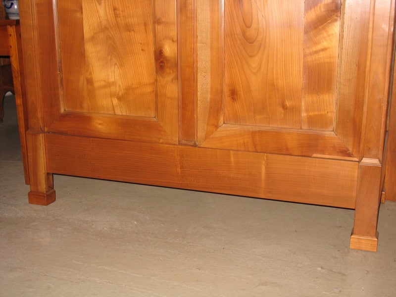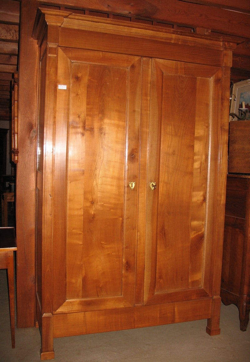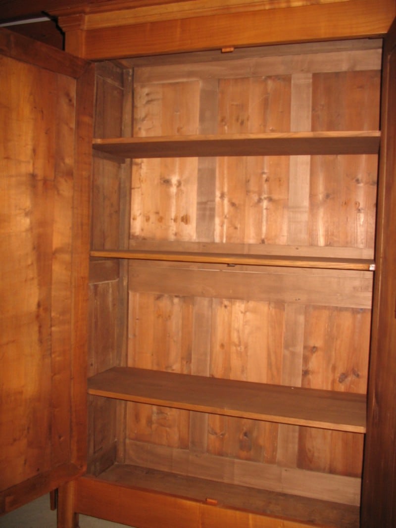 Armoire très sobre en merisier dans l’esprit Directoire ouvrant par 2 portes et garnie de 3 étagères intérieures.