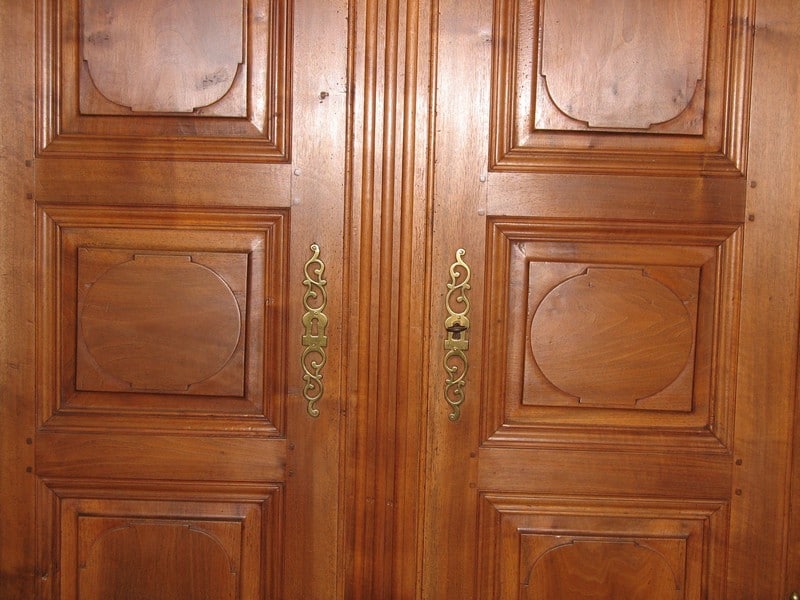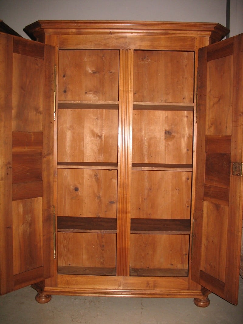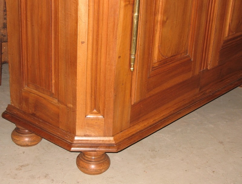 Armoire Louis XIV de boiserie en noyer blond, à pans coupés. Elle ouvre à 2 portes , son pilastre est fixe et l’intérieur est garni de 3 étagères. Époque : début XIXe