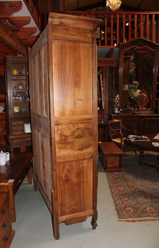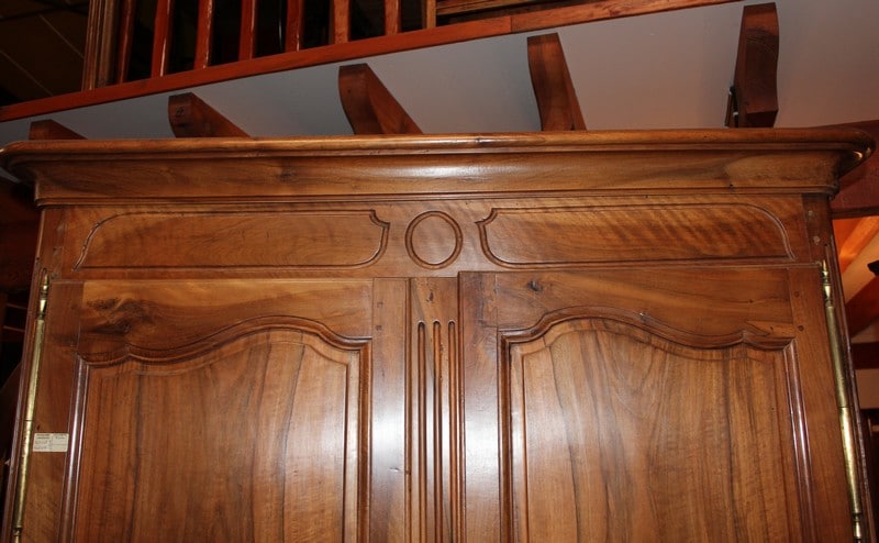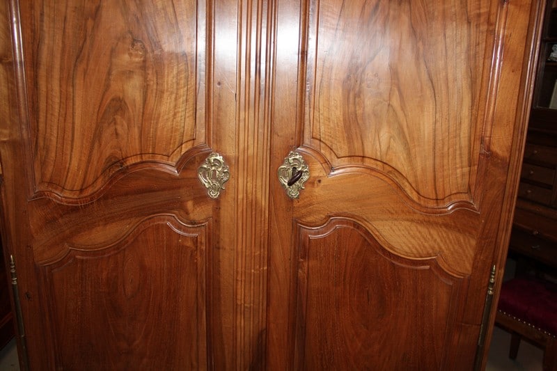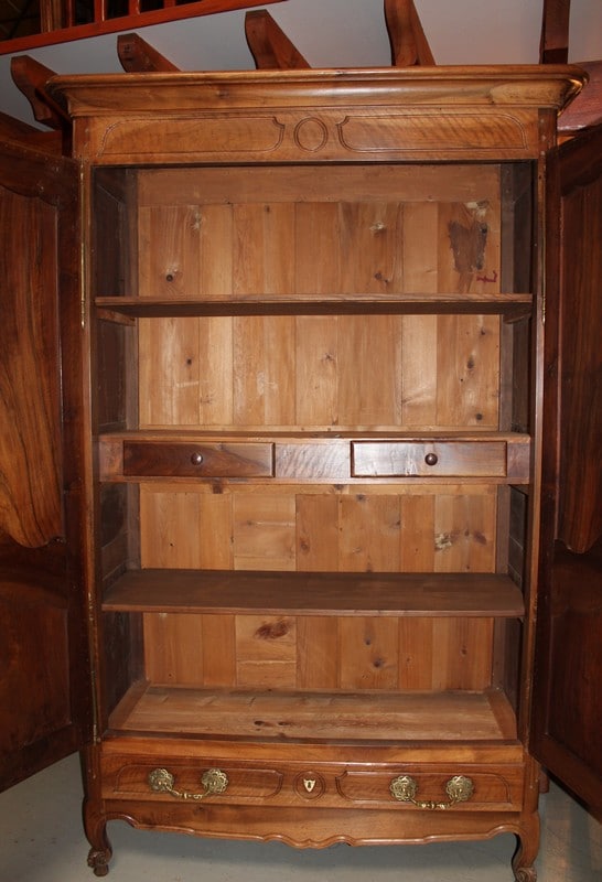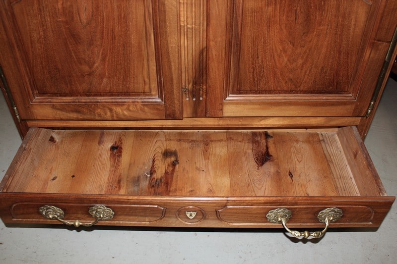 Elegante armoire Louis XV en noyer blond ouvrant par 2 portes et un grand tiroir en partie basse. Pieds à enroulement, portes à traverse. Ses fiches, entrées et poignées sont en cuivre, L’intérieur est garni de 3 étagères et 2 tiroirs.Région du Sud-Ouest. Epoque XVIIIe.