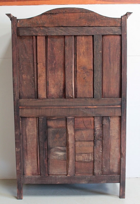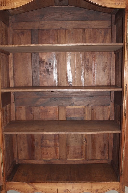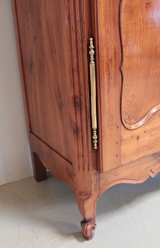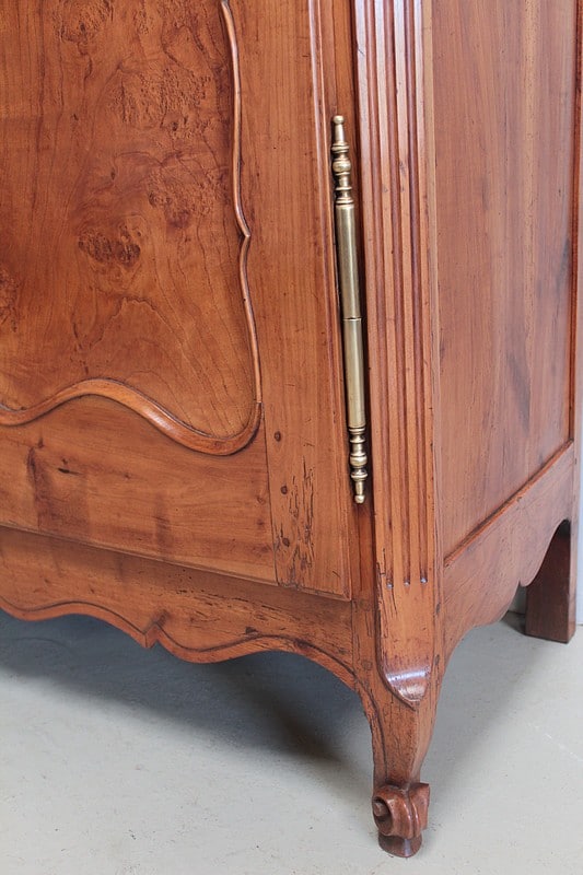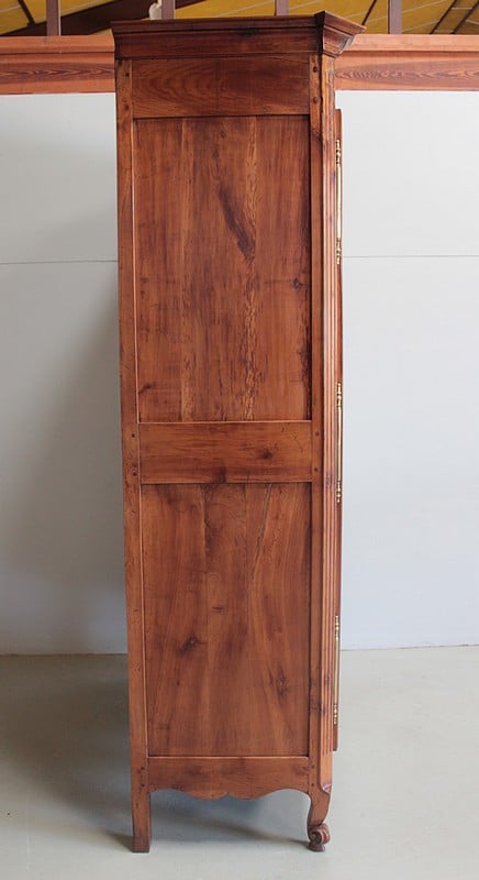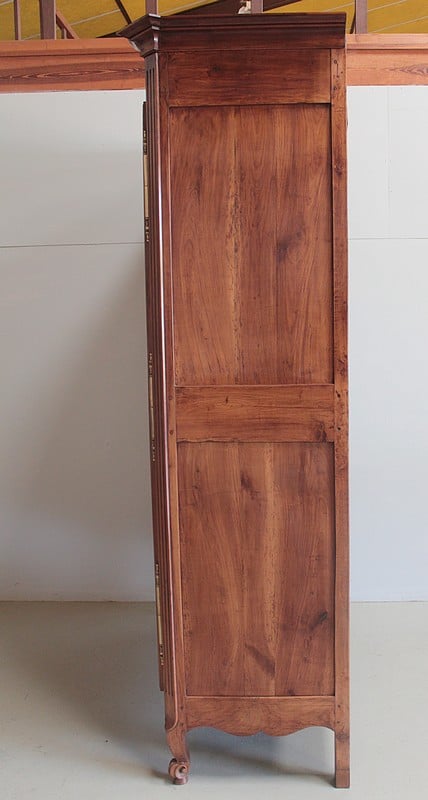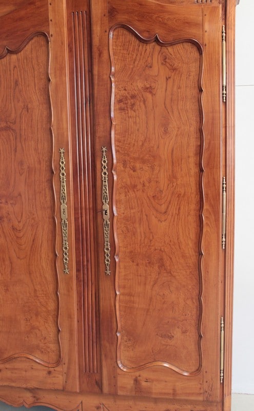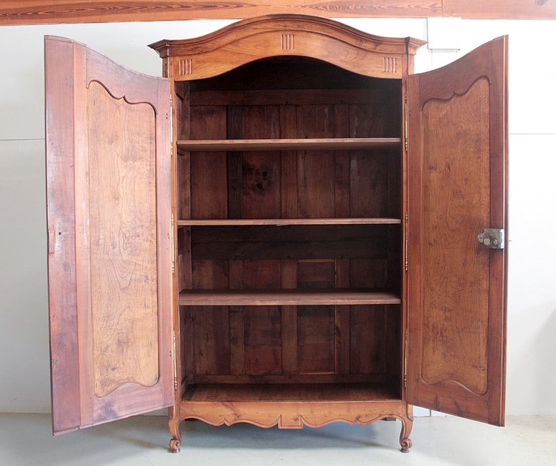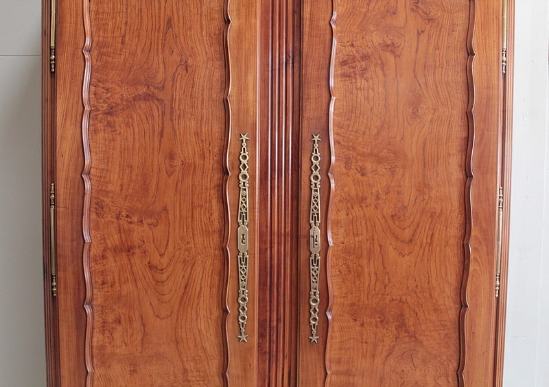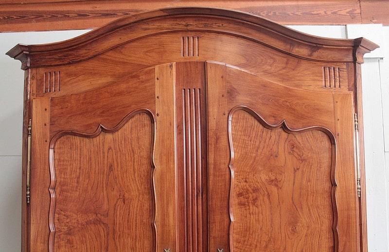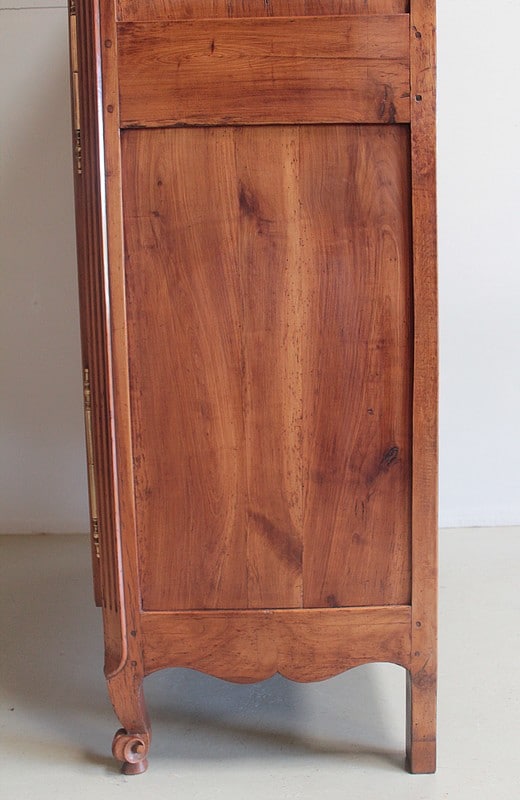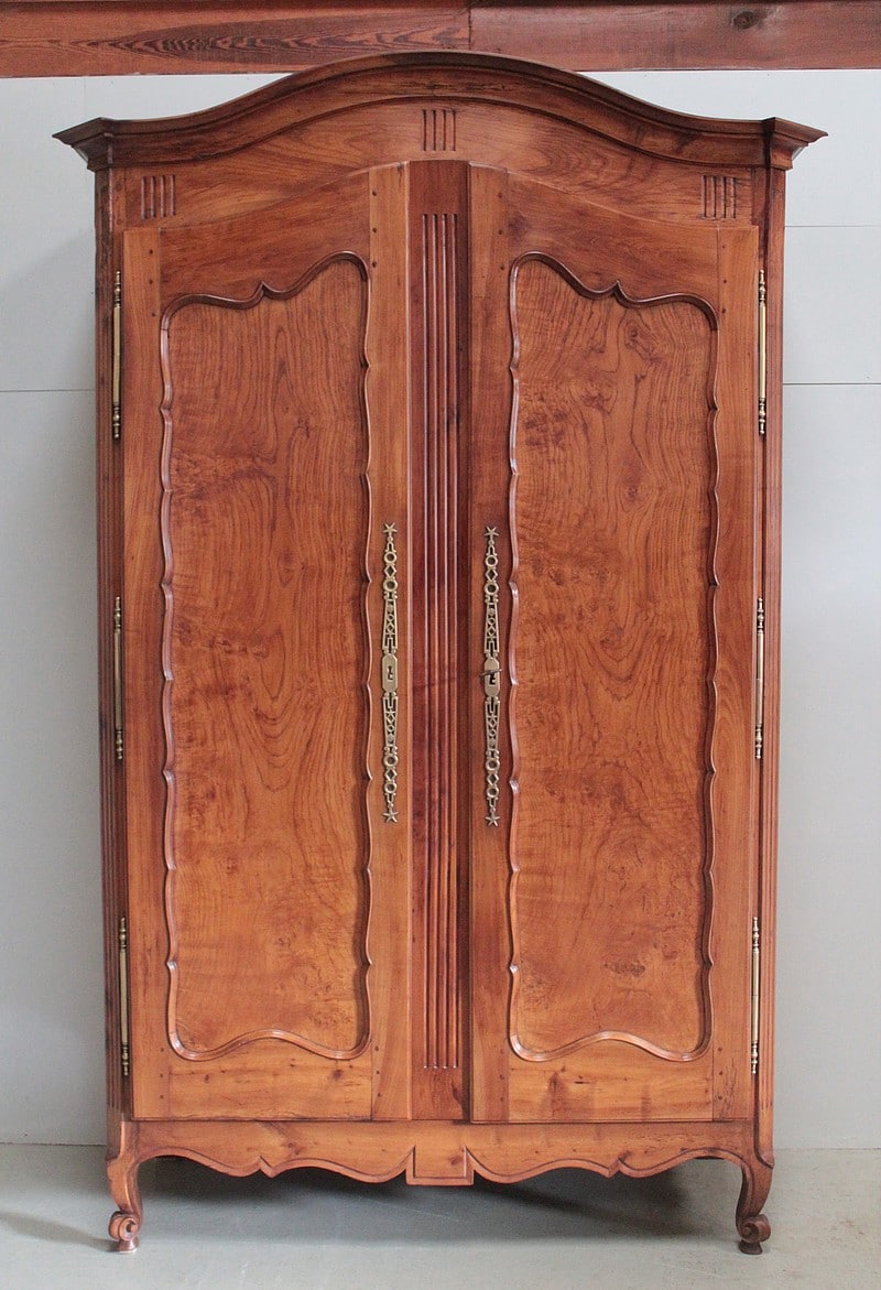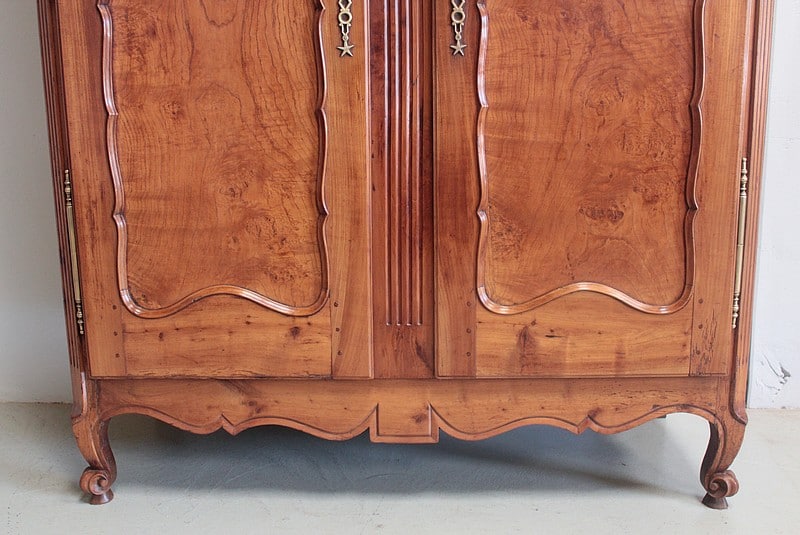 Armoire de style Louis XV ouvrant à 2 portes médaillon en merisier et frêne d’une seule planche pour les panneaux des portes.