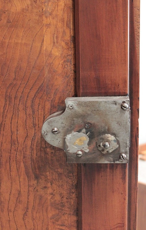 Parfait état après restauration, remise en état de la serrure ancienne et de la clé, décapage et patine cirée dans notre atelier.