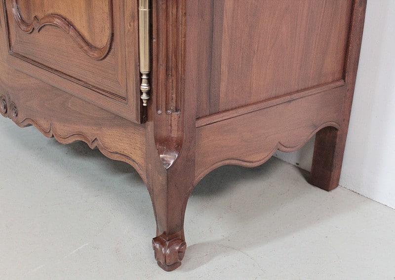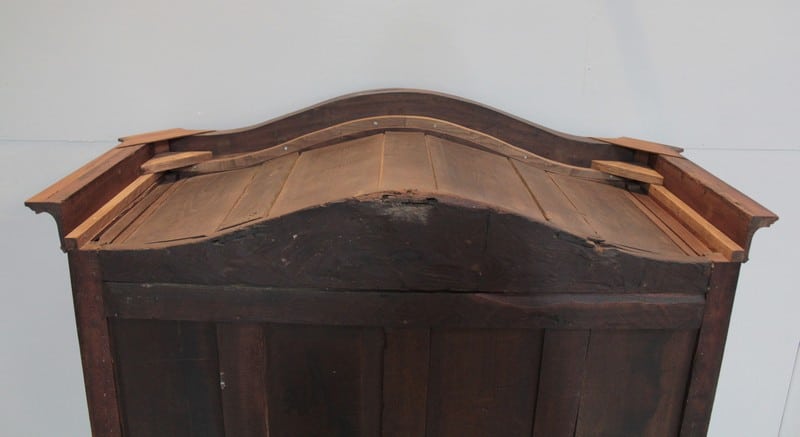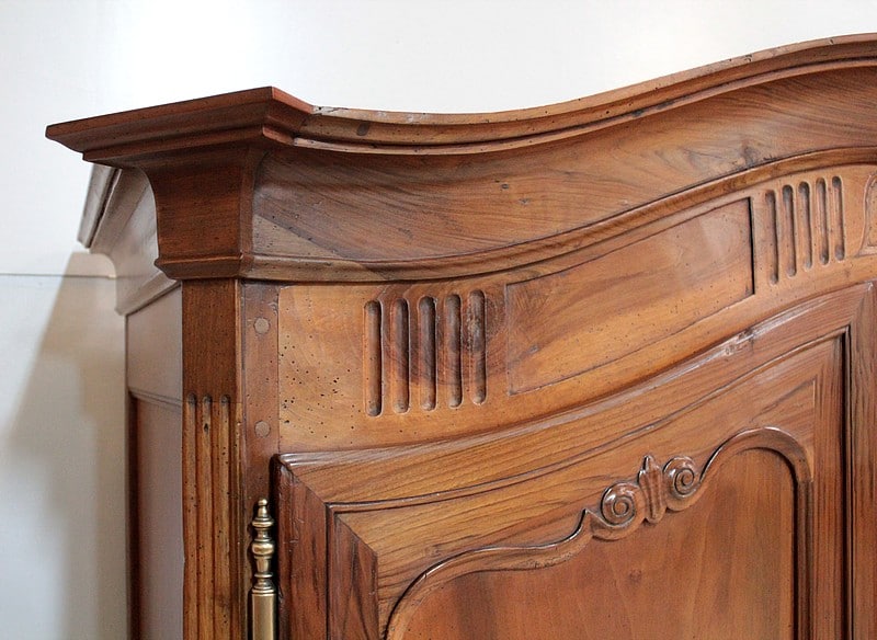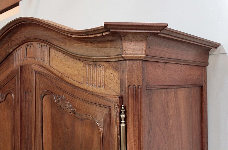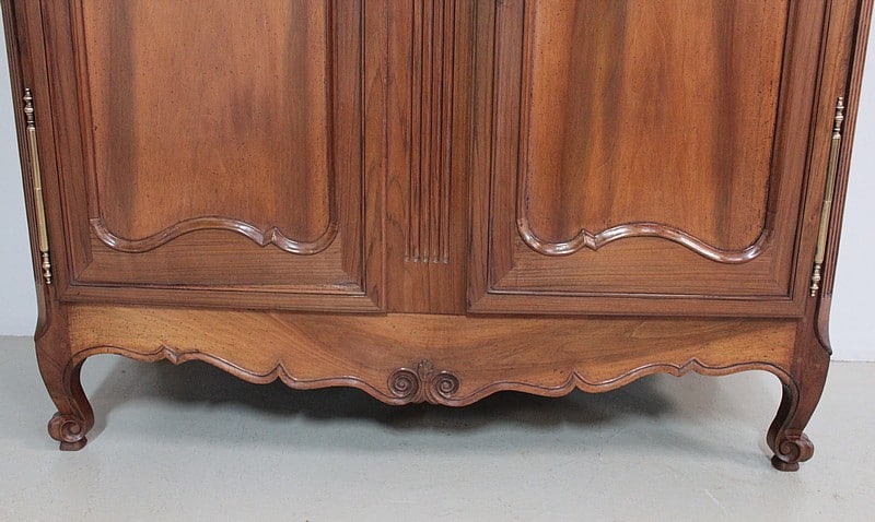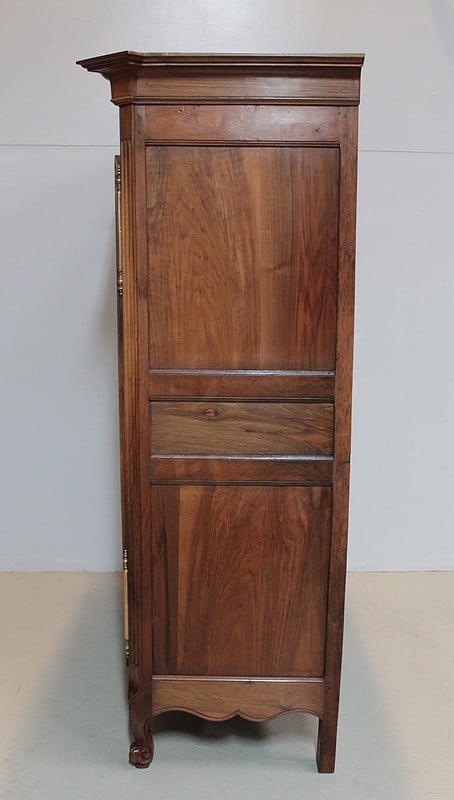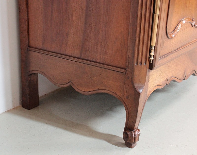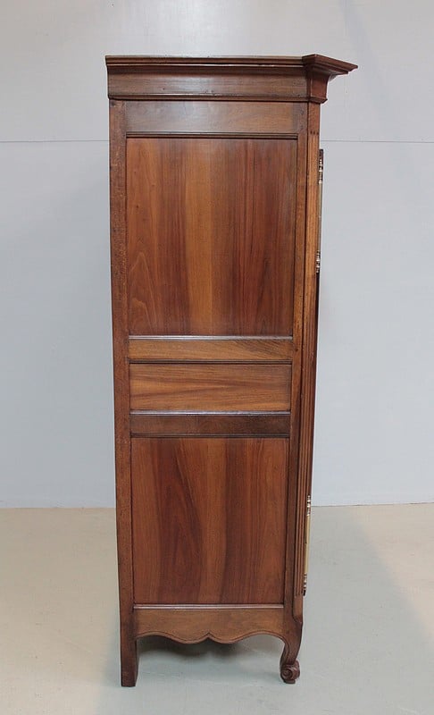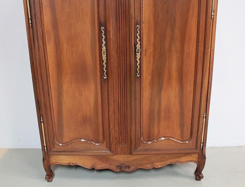 Armoire de style Louis XV, ‘Chapeau de Gendarme’ en noyer massif à pans coupés à cannelures. L’arrière est en chêne.