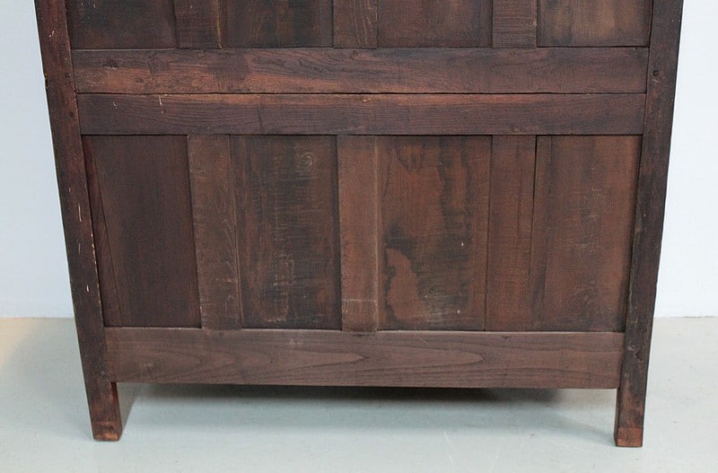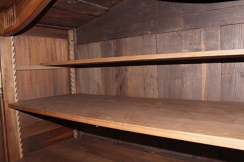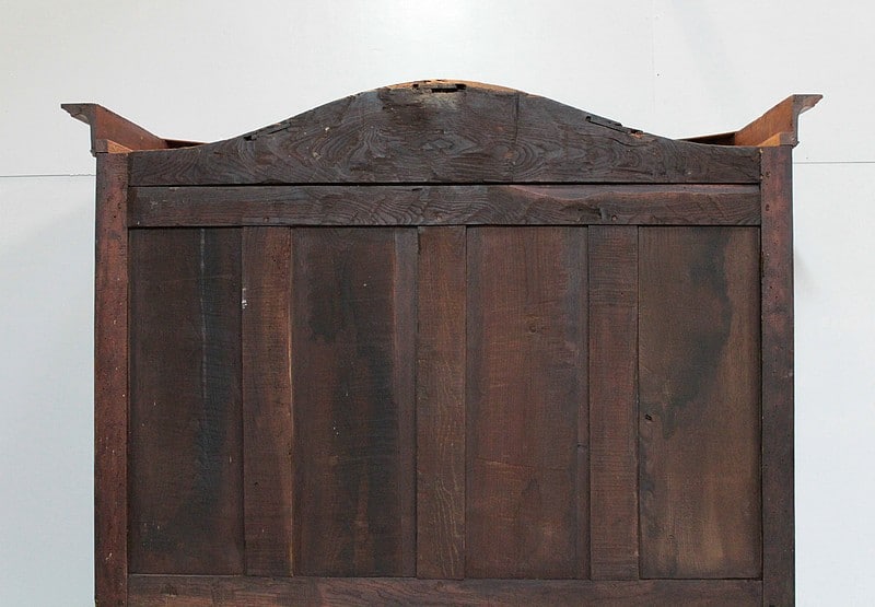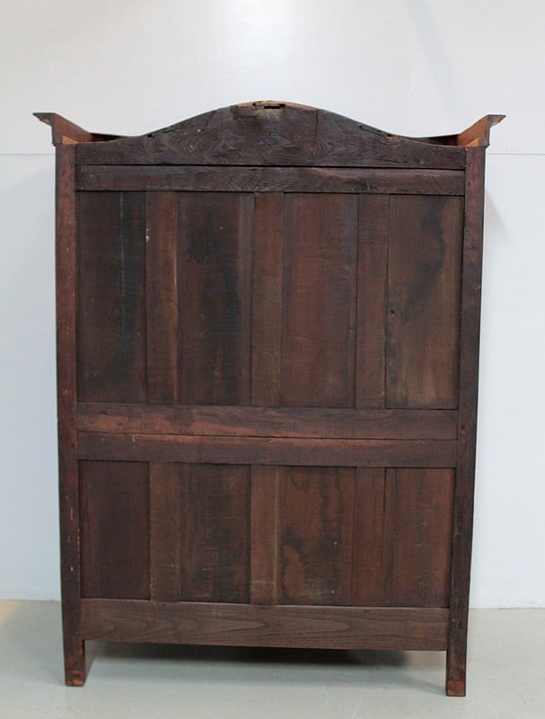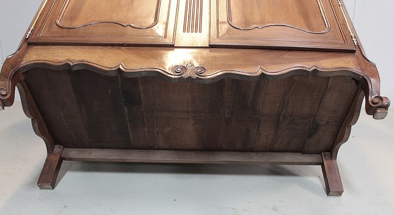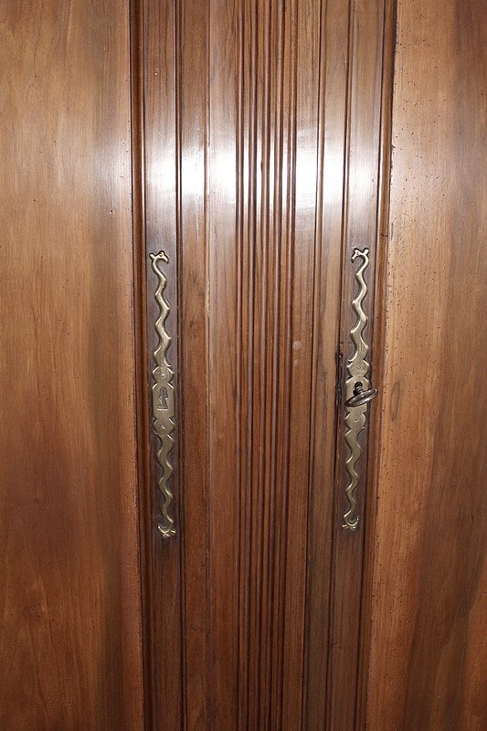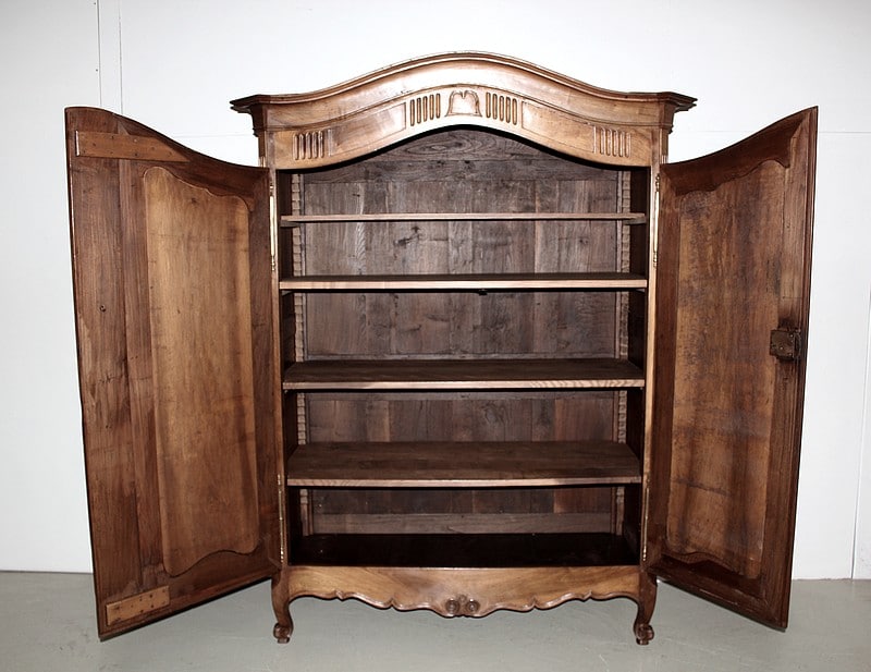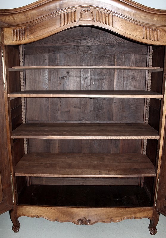 Armoire de style Louis XV, ‘Chapeau de Gendarme’ en noyer massif à pans coupés à cannelures. L’arrière est en chêne.