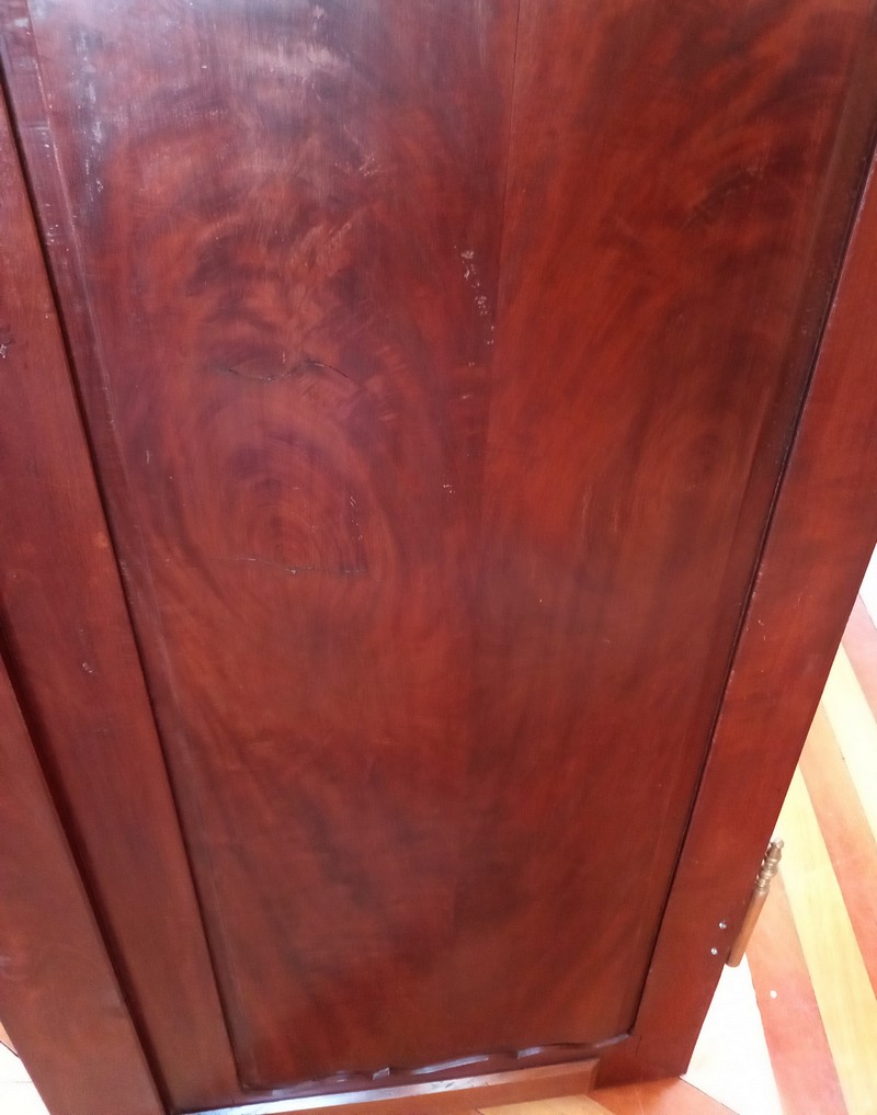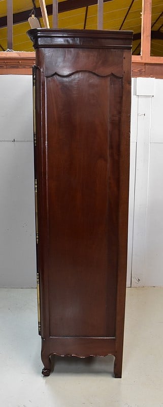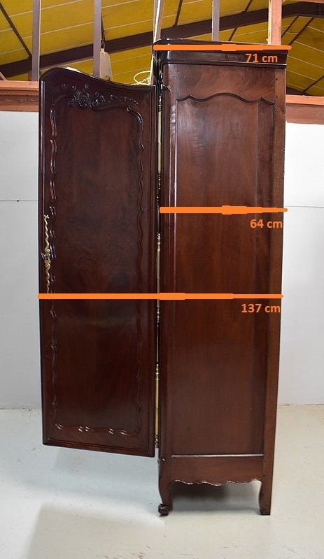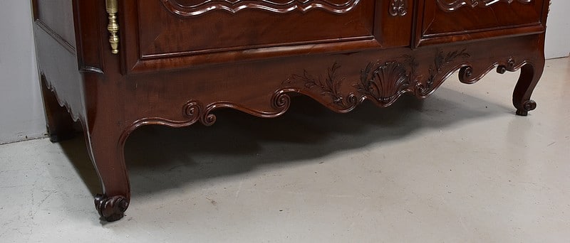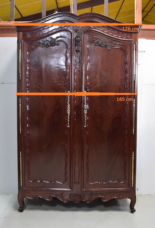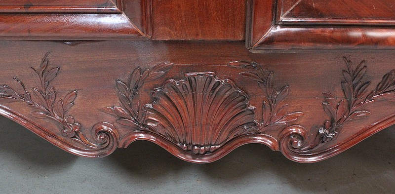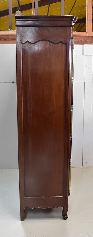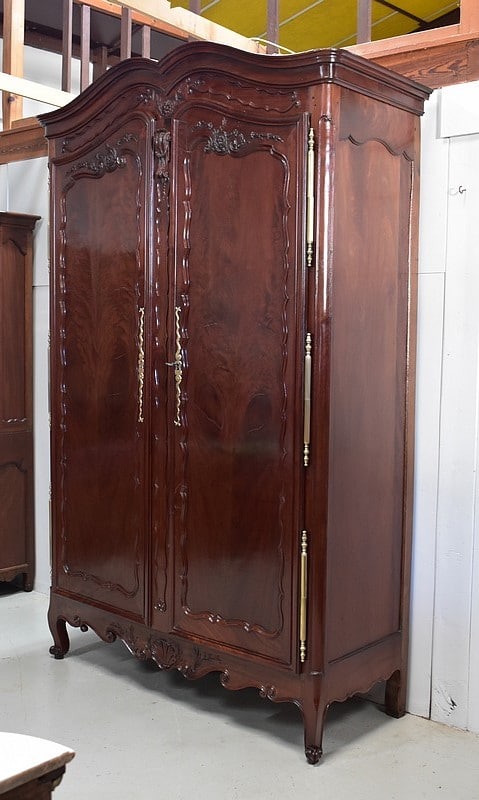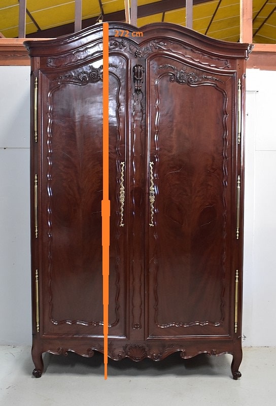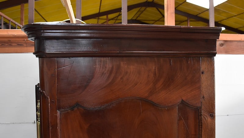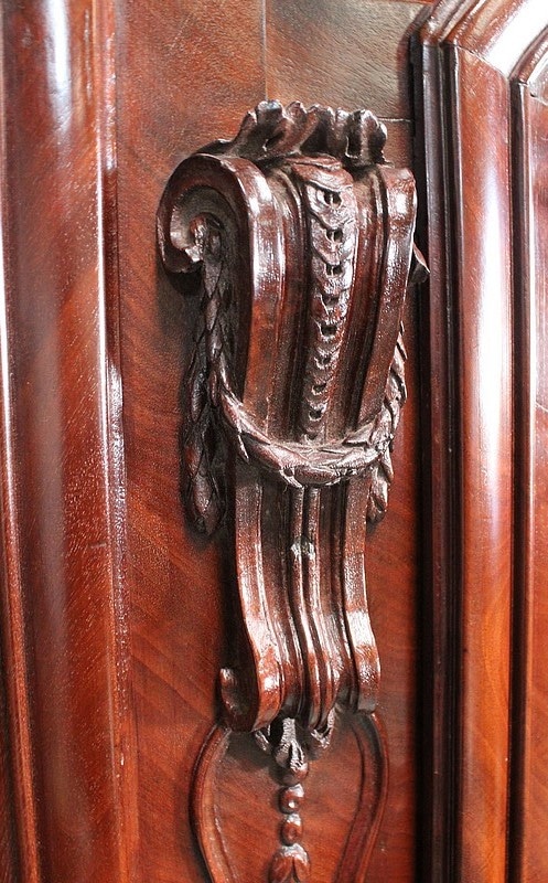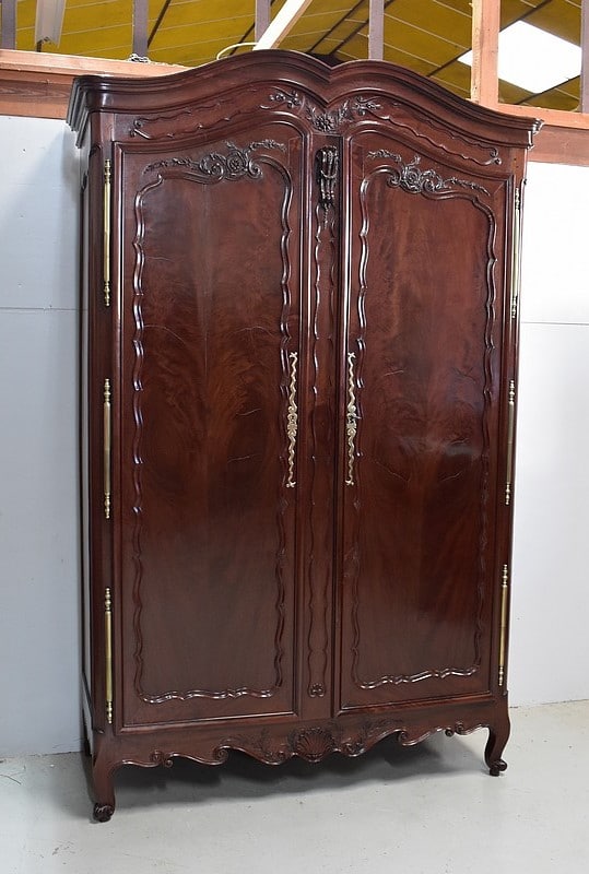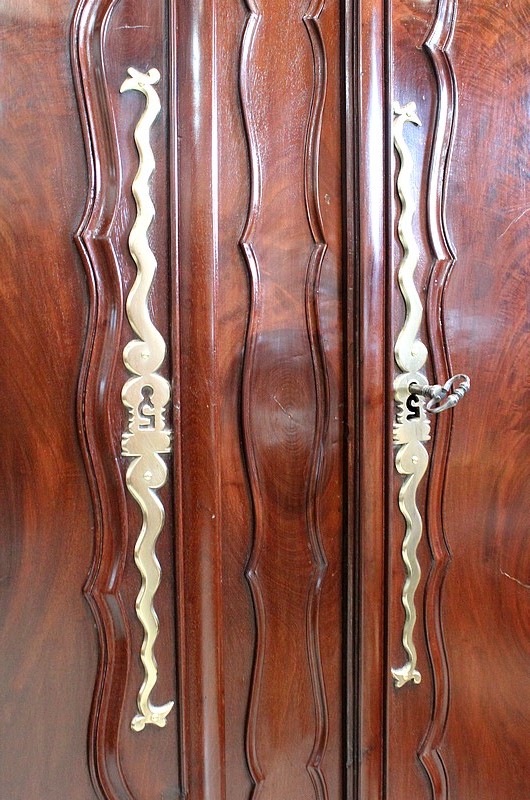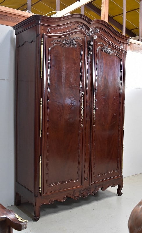 Remarquable Armoire de Port en Acajou de Cuba, aux dimensions imposantes, coiffée d’une Corniche Arbalète en forme de cœur.