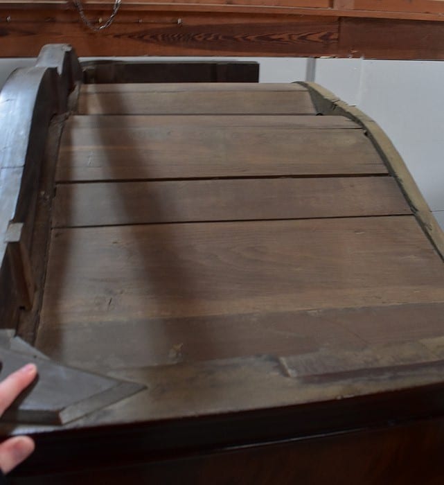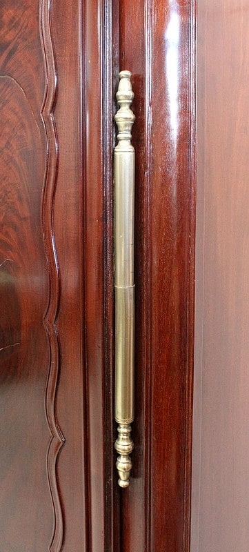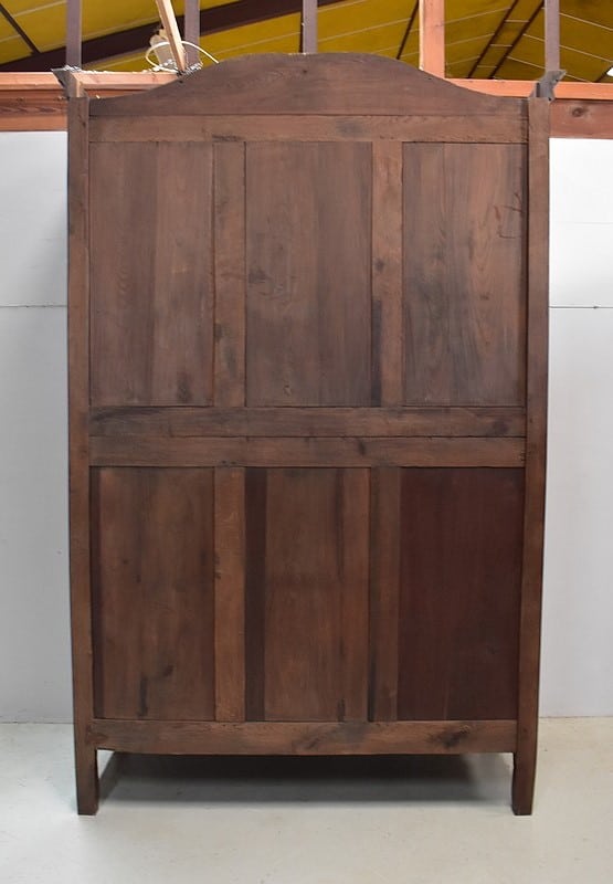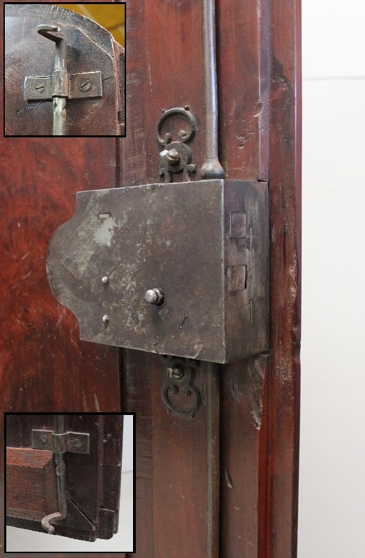 Elle ouvre par deux grandes portes découpées en accolade en partie haute. Elles se composent de panneaux en retrait aux contours soulignés par des moulures ondulées. Chacune de ces portes est maintenue par trois importantes fiches en laiton et est pourvue d’une longue entrée de serrure. Le vantail de droite est équipé d’un verrou d’origine à trois points d’accroches. Le meuble est fourni avec se clé d’époque. On notera que chacun des panneaux massifs disposés en symétrie sur un axe vertical habilement dissimulé. L’intérieur est garni de quatre étagères de 59 cm de profondeur posées sur tasseaux fixes et de deux tiroirs aux largeurs inégales.