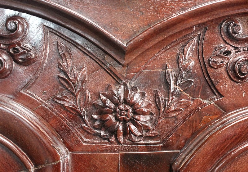 On appréciera de manière générale les nombreuses sculptures aux motifs divers présentes sur l’ensemble du meuble : sous la Corniche, en haut des portes, entre celles-çi …