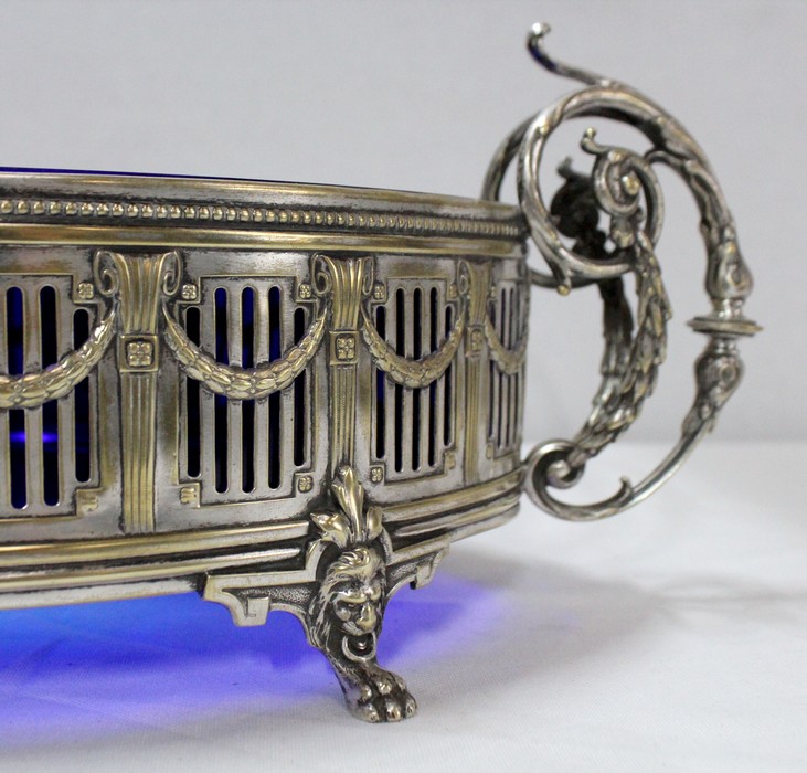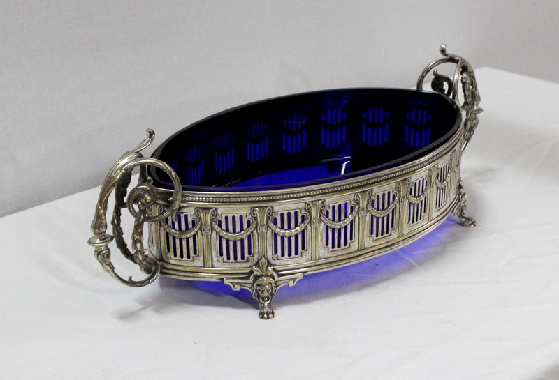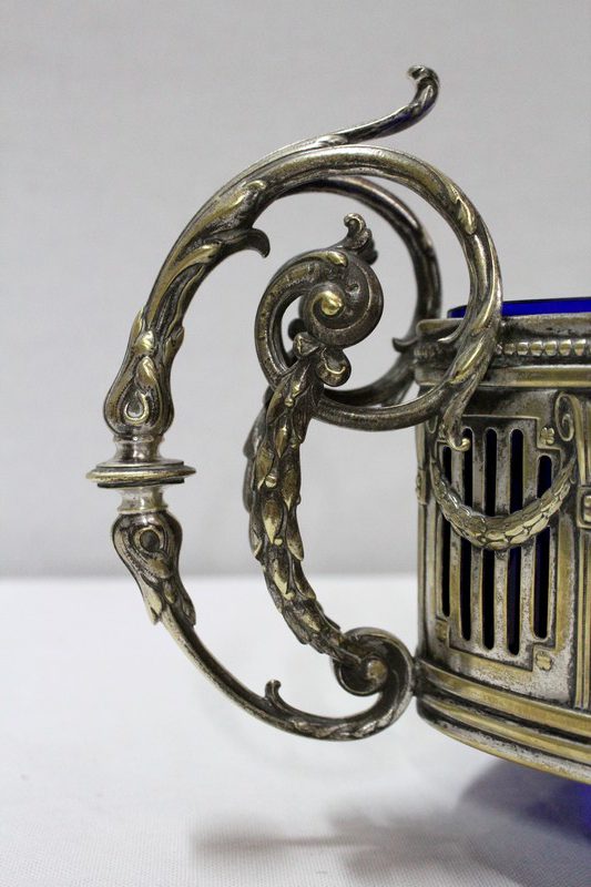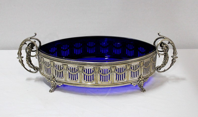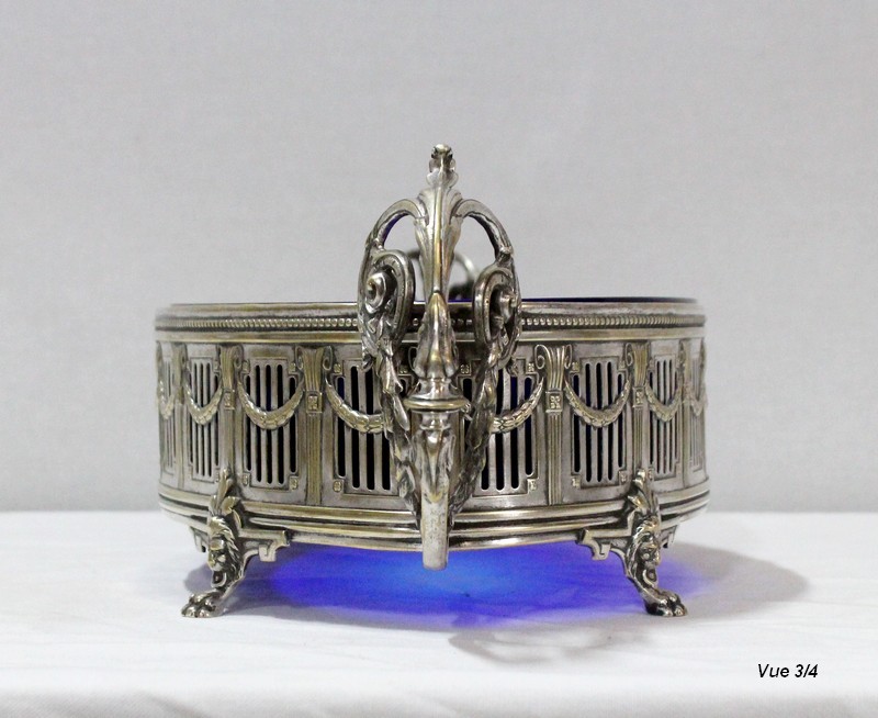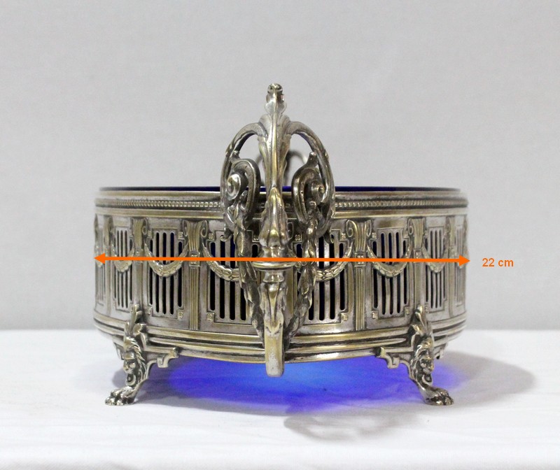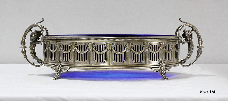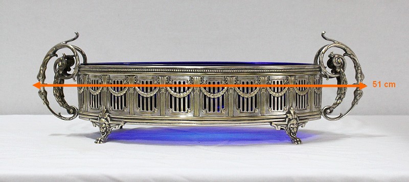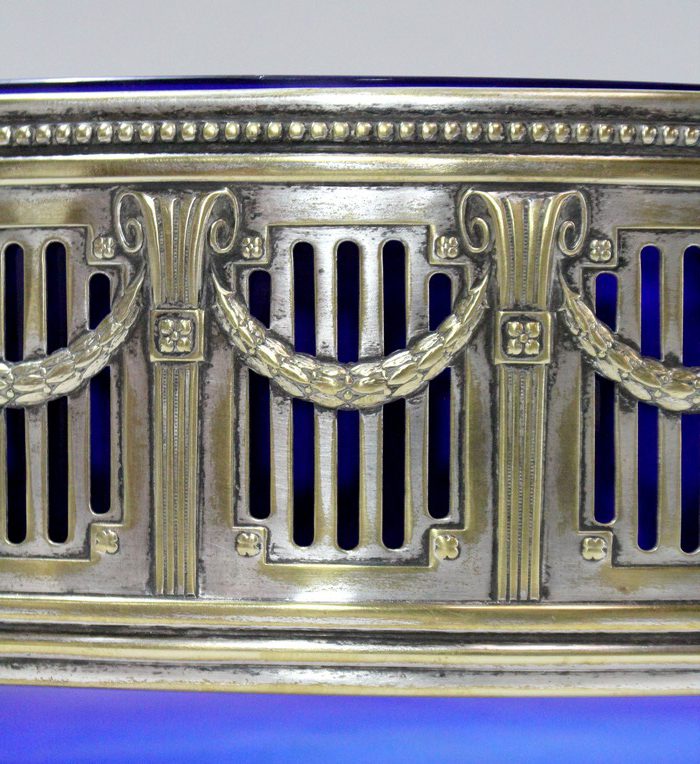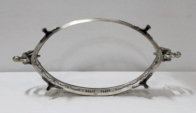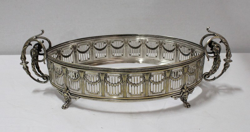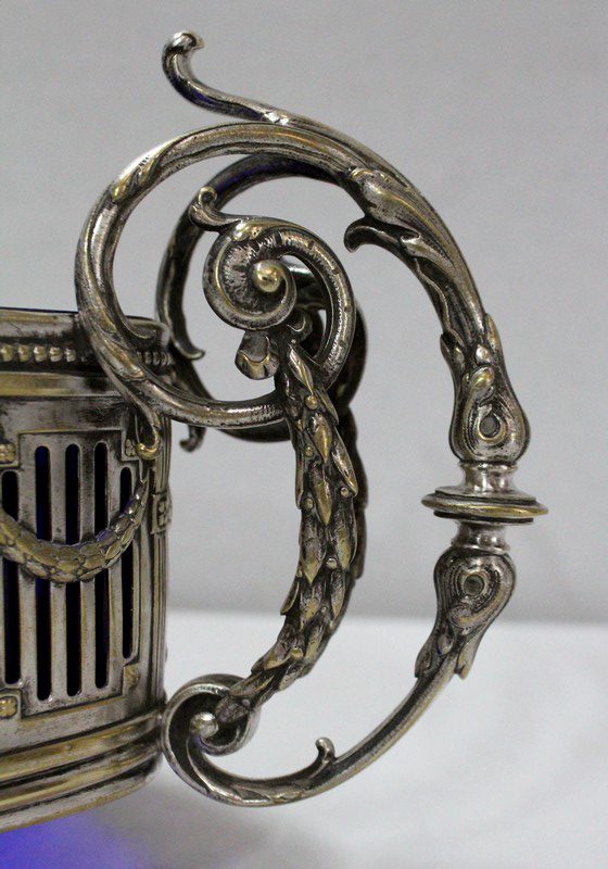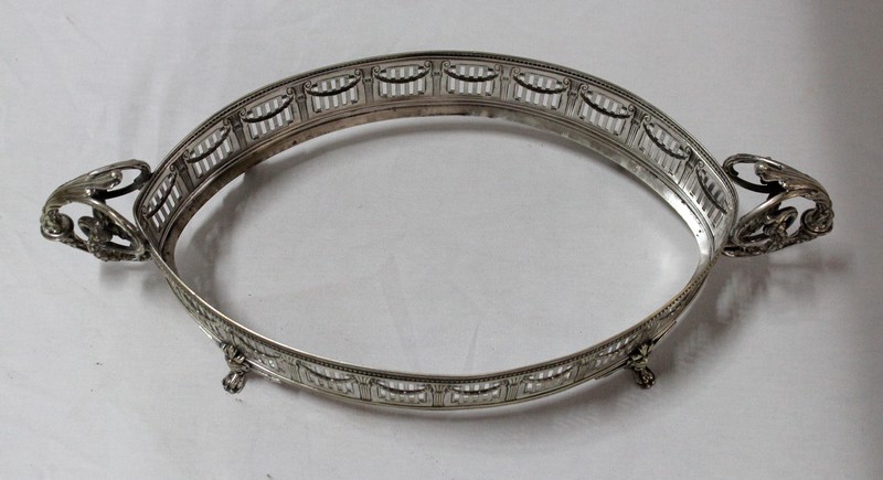 Il est composé dans son pourtour de multiples éléments ajourés comportant des pilastres et des couronnes enrubannées. À chaque extrémité, une poignée très aérée en forme de volutes et de feuilles permet la prise en main de l’objet.
