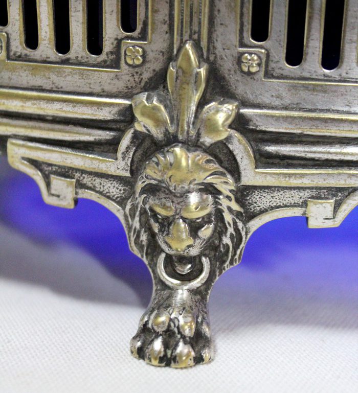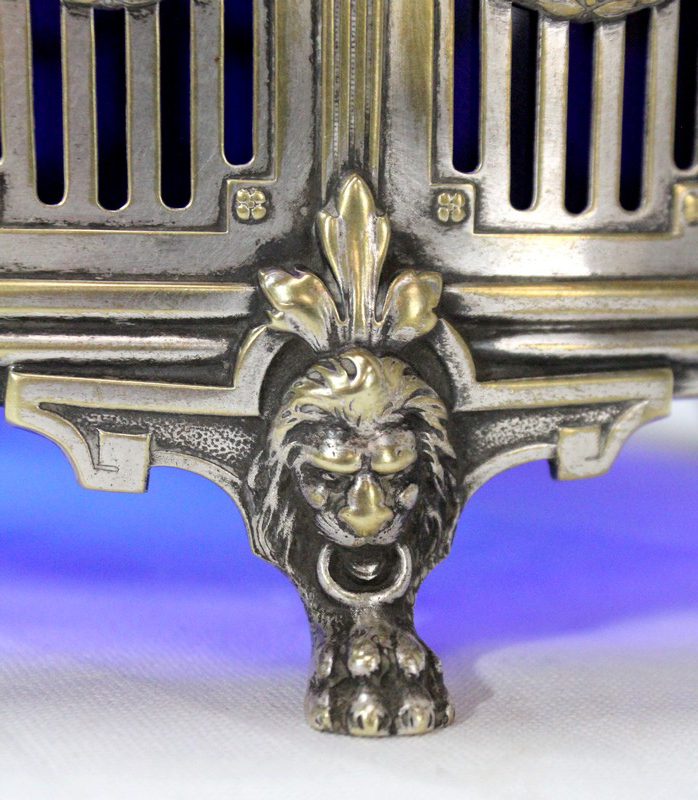 Cette jardinière repose sur quatre petits pieds à griffes, chacun surmonté d’une tête de lion au rictus grimaçant.