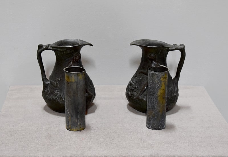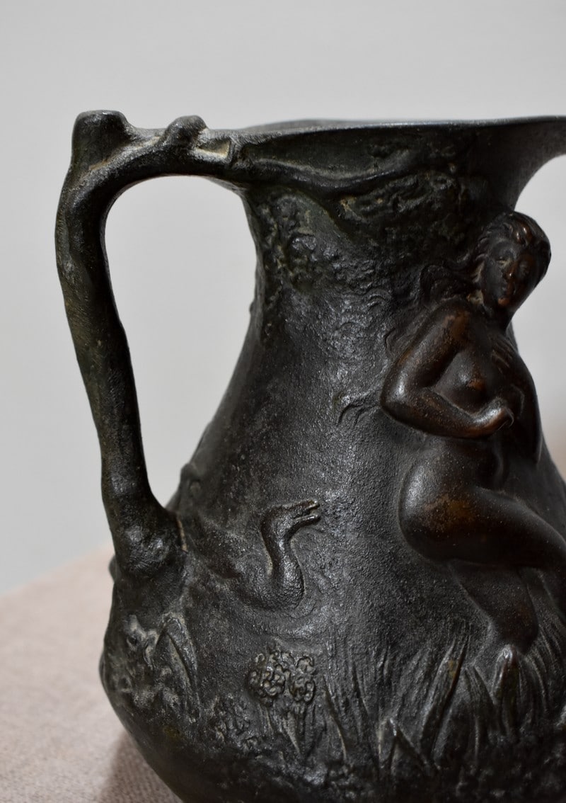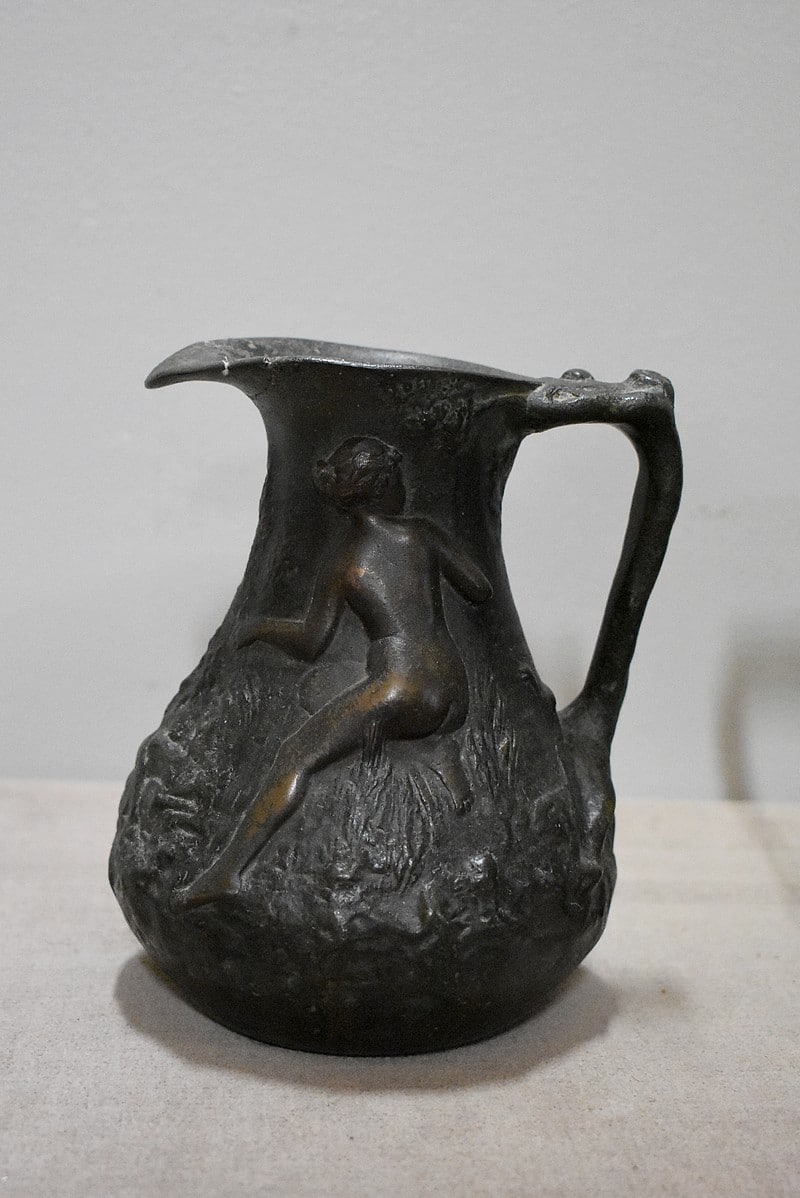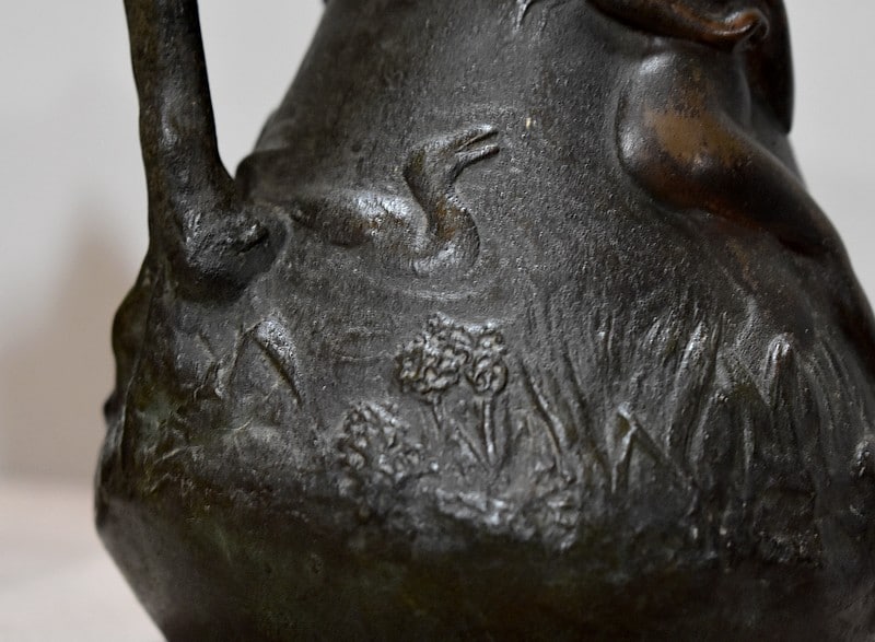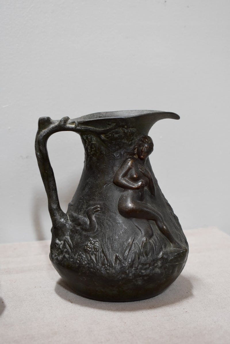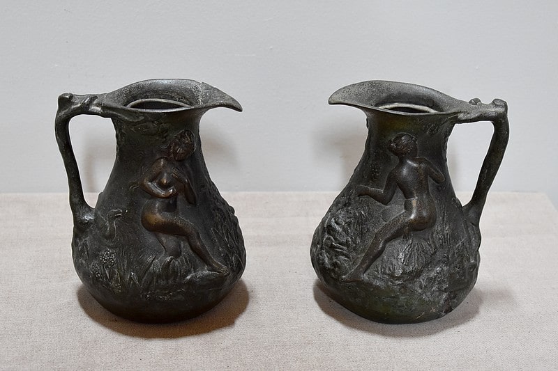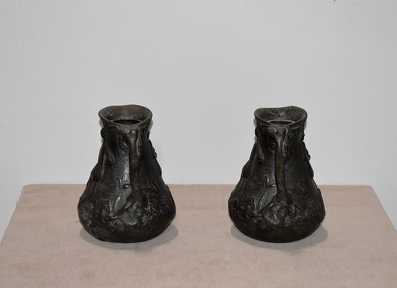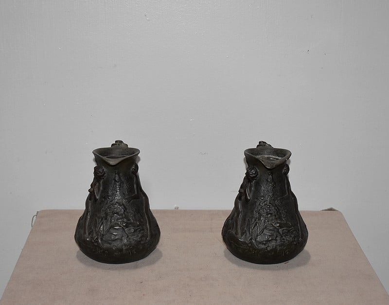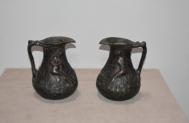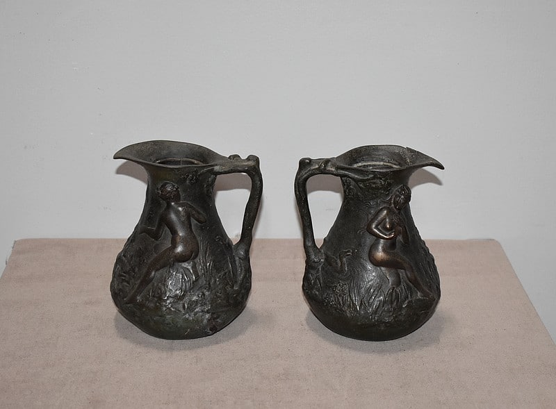 Paire de petits vases pichets en étain vieilli, signés J.G., à décors de femmes se baignant dans une marre, entourées de nature et de canards.