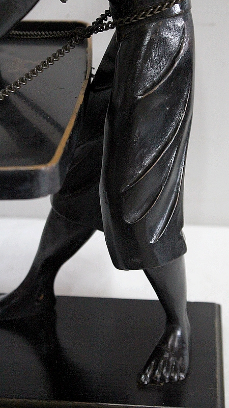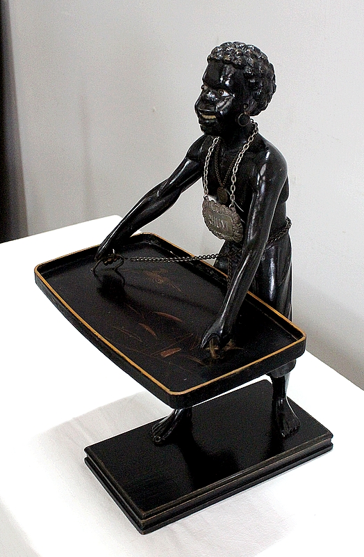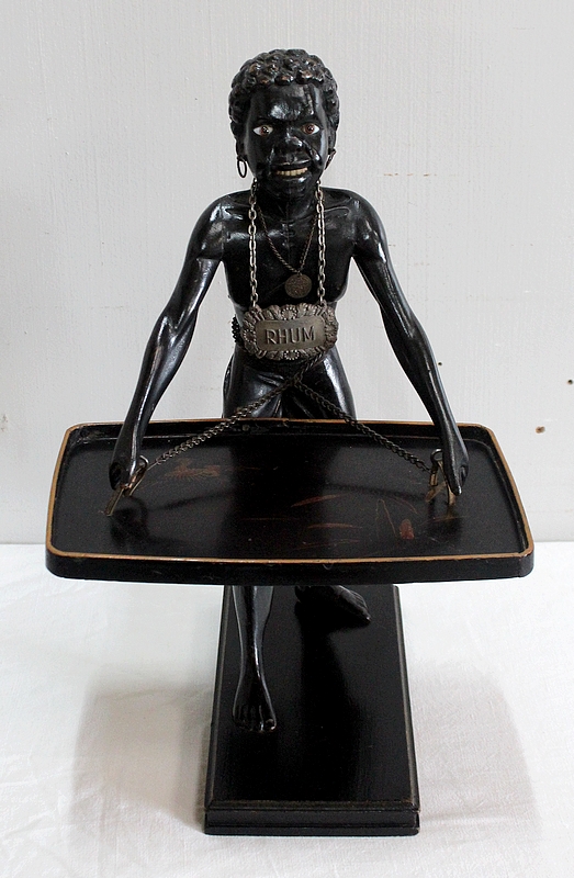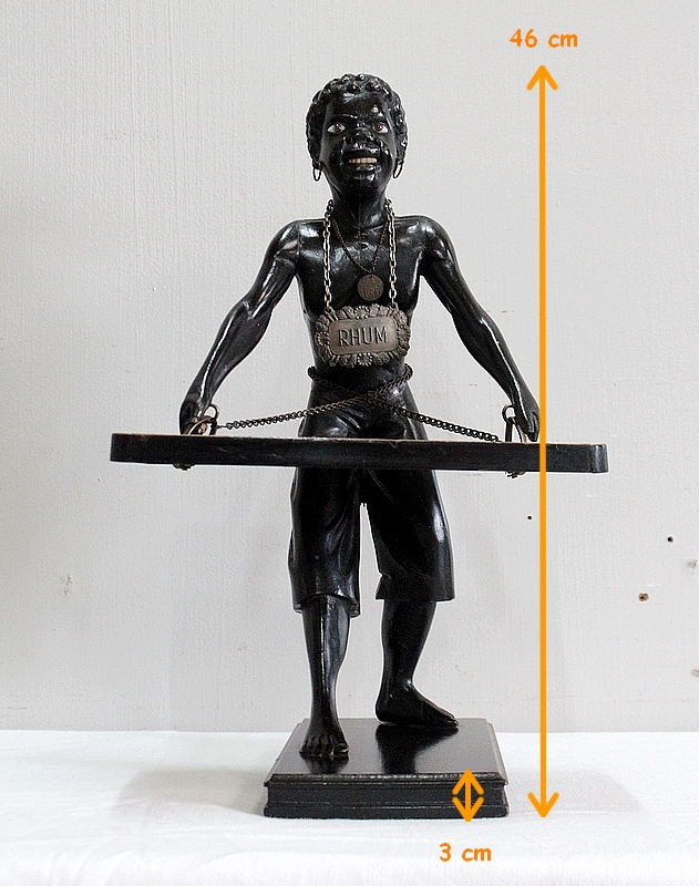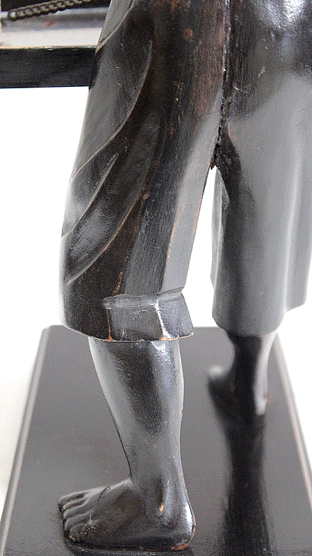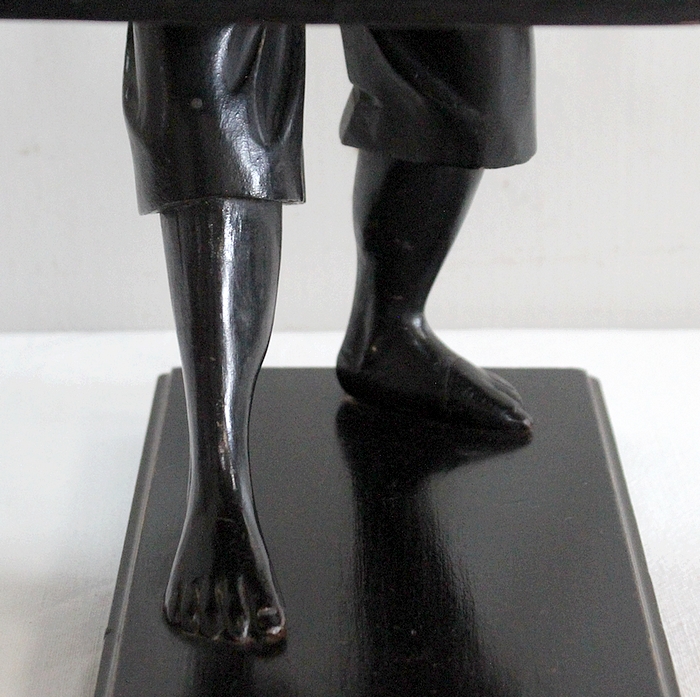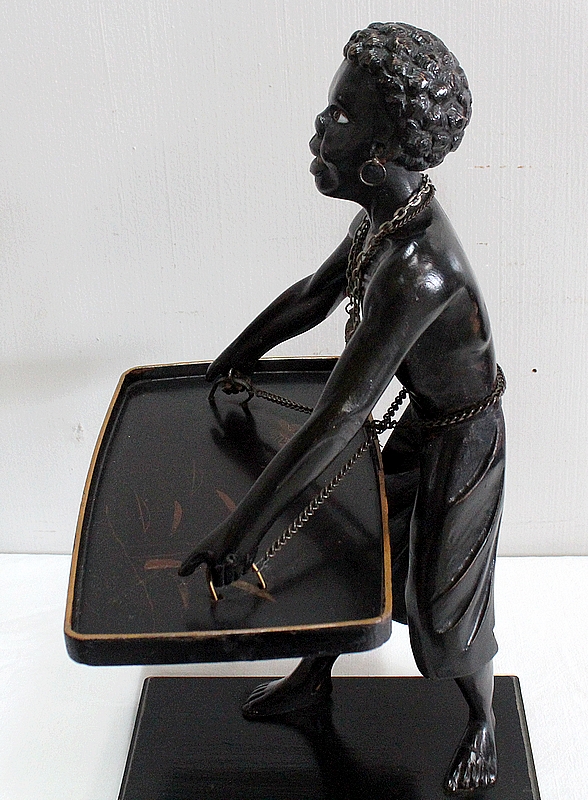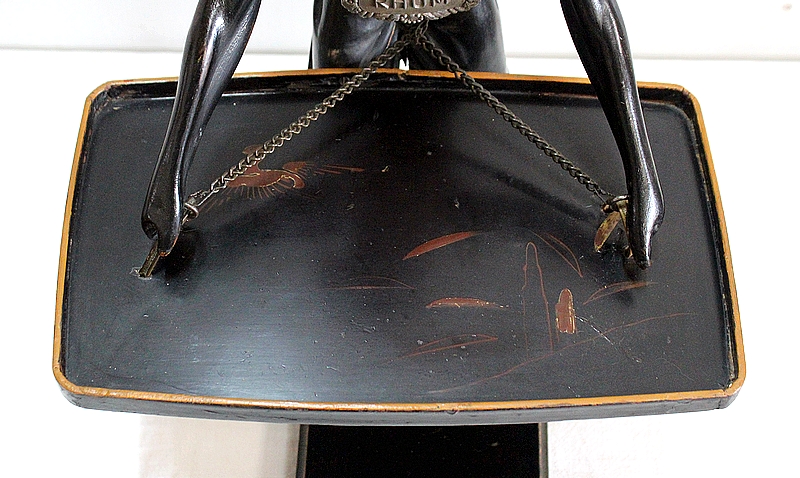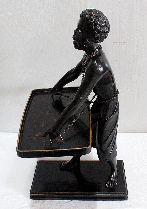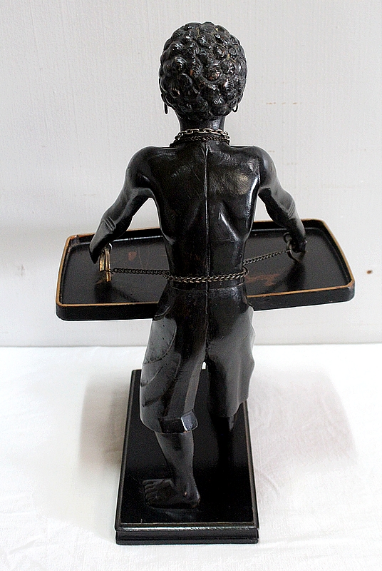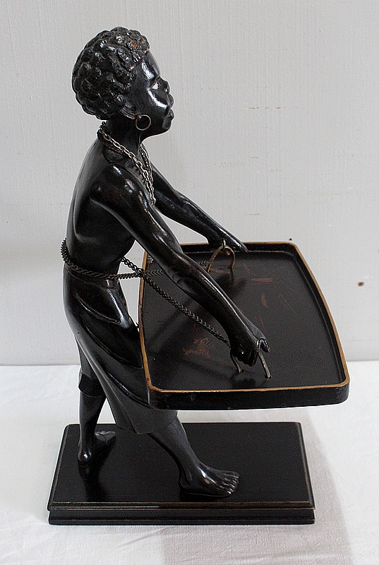 Présentoir de Table en Bois à laque Noire, représentant un Nubien bras tendus, portant un plateau de service assorti d’une chaînette. Ce dernier, dans un esprit Japonisant, révèle deux Fines peintures. A gauche, on reconnaitra un Oiseau, peut-être un aigle, symbolisant l’Égypte, et à droite, des Roseaux à massettes.