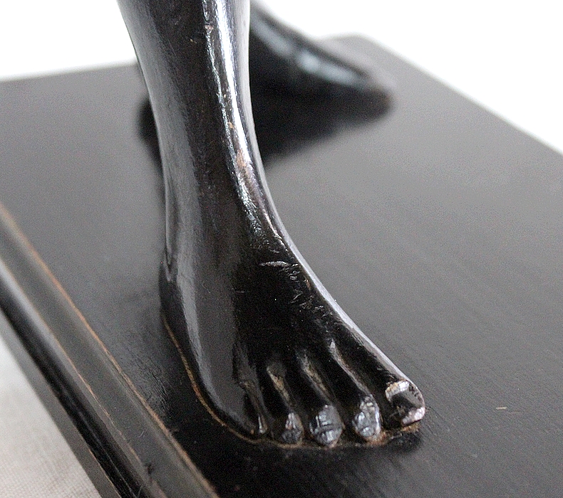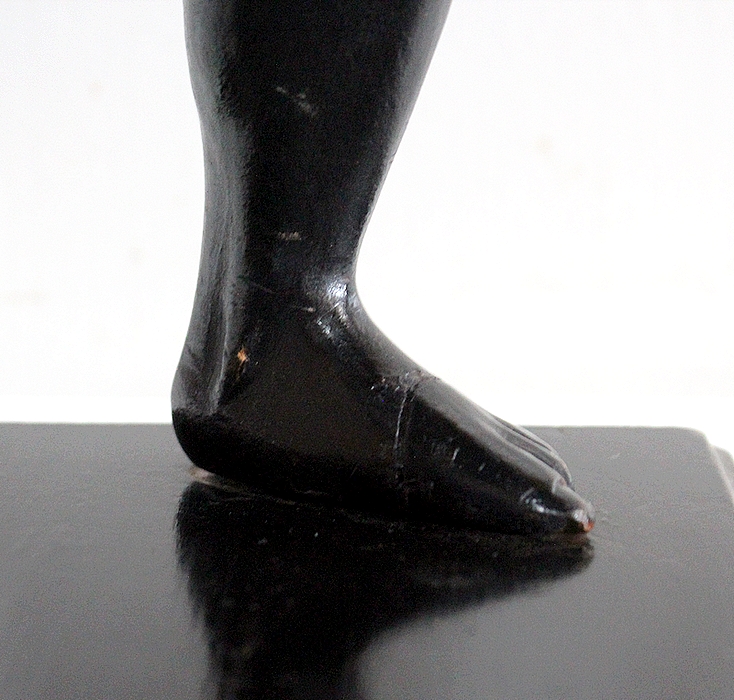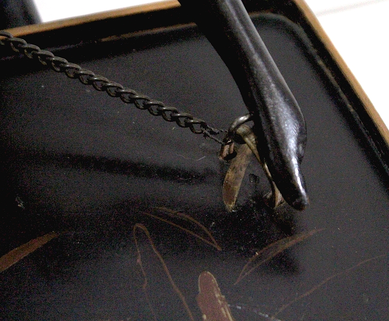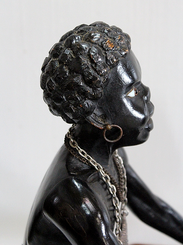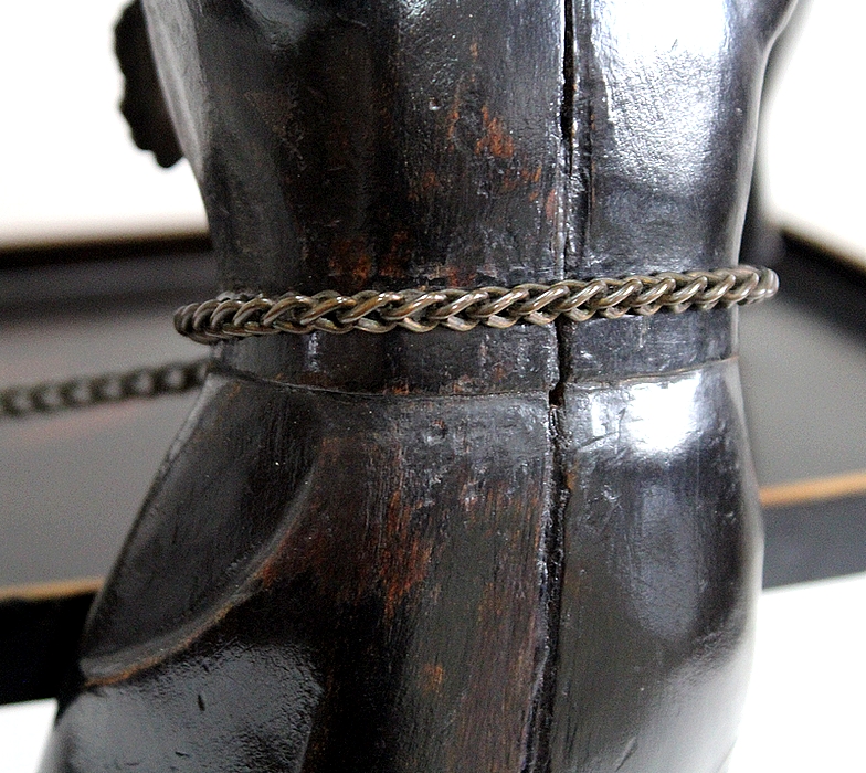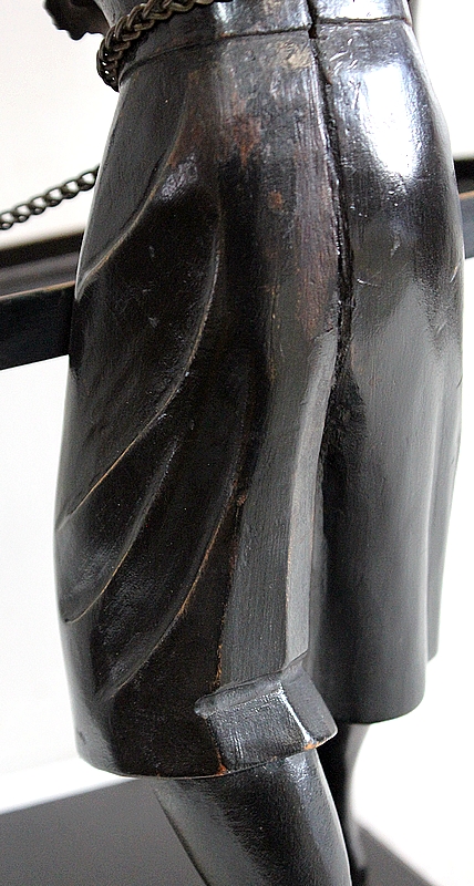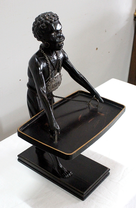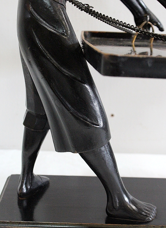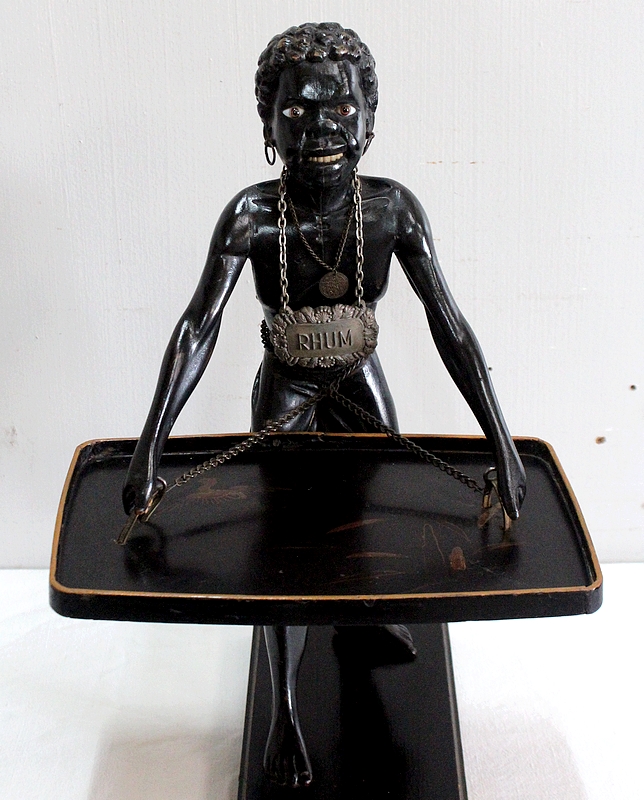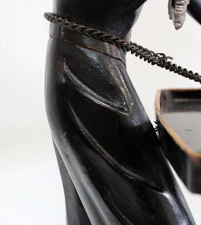Présentoir de Table en Bois à laque Noire, représentant un Nubien bras tendus, portant un plateau de service assorti d’une chaînette. Ce dernier, dans un esprit Japonisant, révèle deux Fines peintures. A gauche, on reconnaitra un Oiseau, peut-être un aigle, symbolisant l’Égypte, et à droite, des Roseaux à massettes.