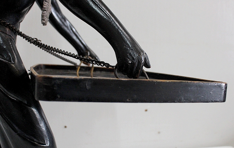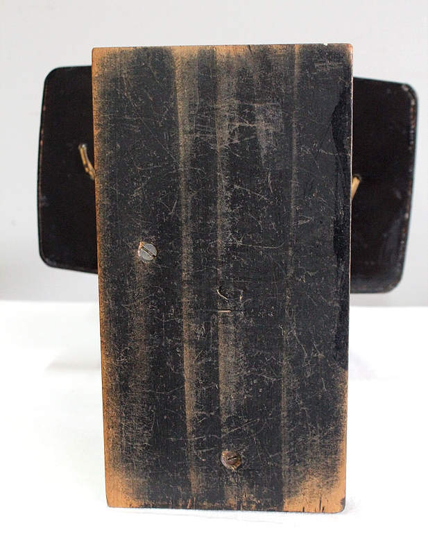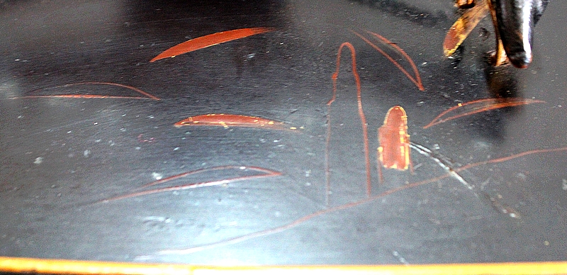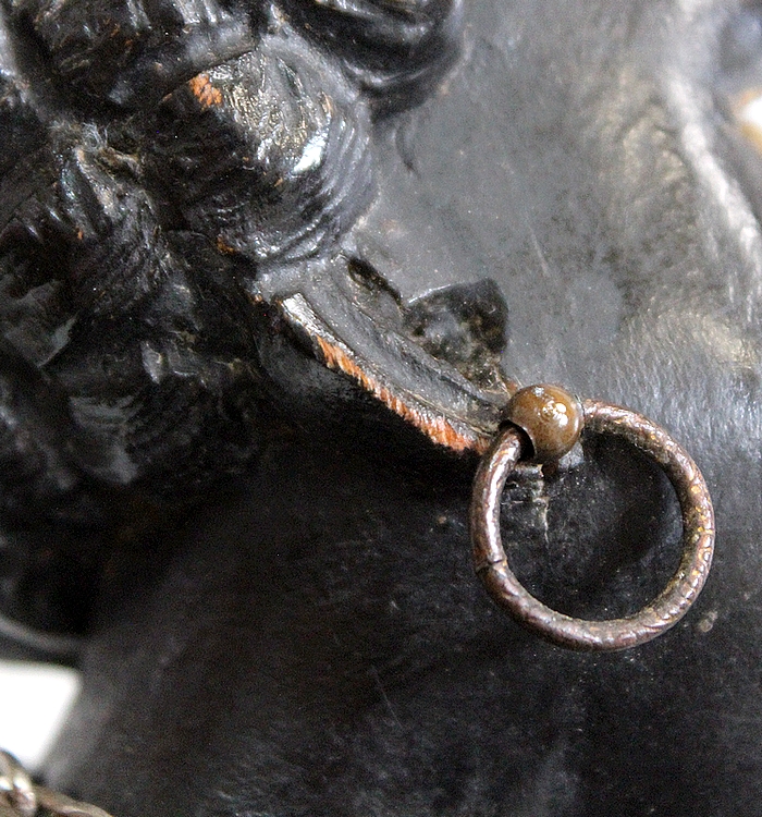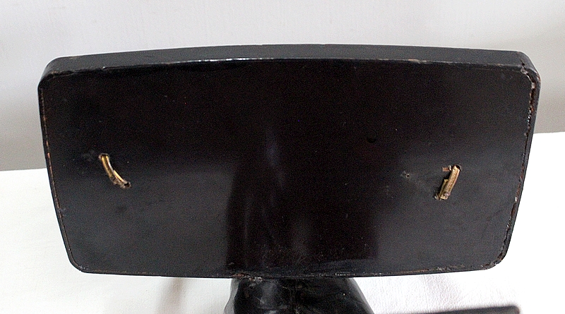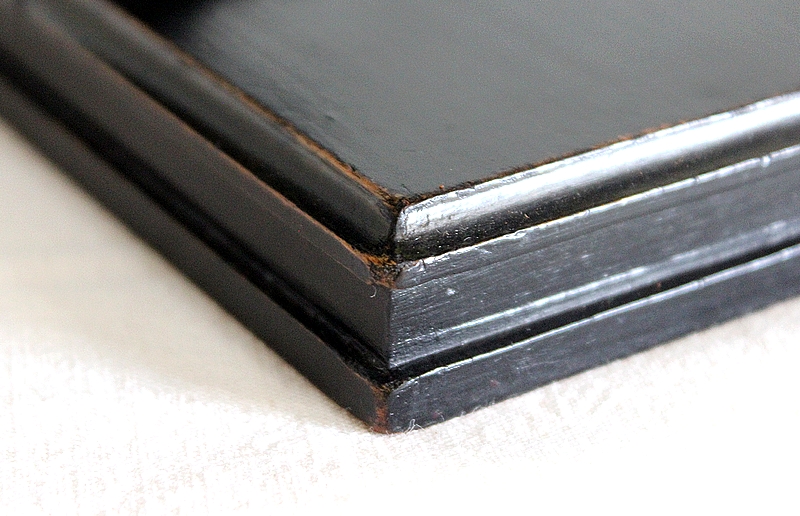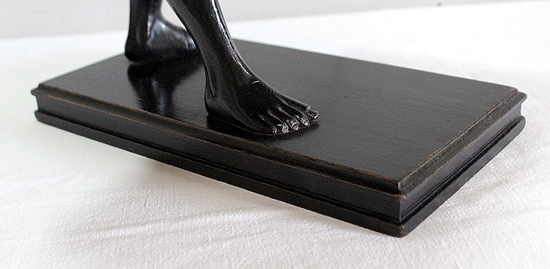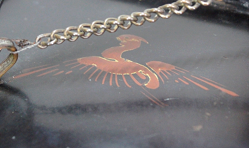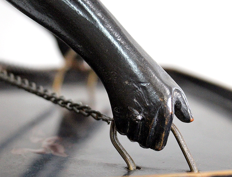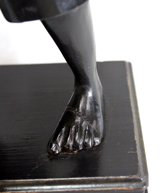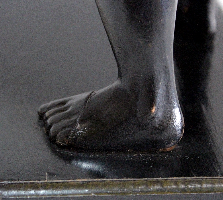 Présentoir de Table en Bois à laque Noire, représentant un Nubien bras tendus, portant un plateau de service assorti d’une chaînette. Ce dernier, dans un esprit Japonisant, révèle deux Fines peintures. A gauche, on reconnaitra un Oiseau, peut-être un aigle, symbolisant l’Égypte, et à droite, des Roseaux à massettes.