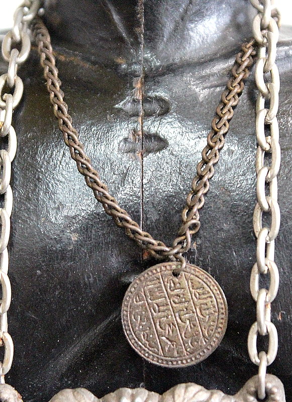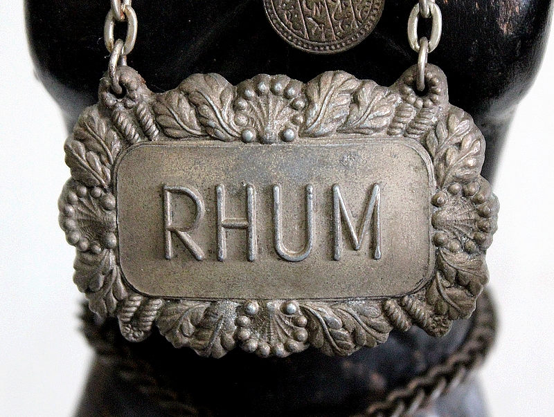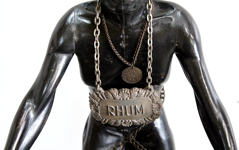 L’Homme est vêtu d’un pantacourt qui semble Léger et Fluide. Ses pieds ainsi que son torse sont nus. Ses seuls accessoires sont une paire de Créoles aux oreilles, ainsi que deux colliers à chaînes autour du cou. Ces derniers sont agrémentés de médaillons : le premier, rond, est gravé d’écritures hiéroglyphiques probablement Égyptiennes. Le second, plus large, s’entoure de Feuillages et de Baies encadrant l’inscription « RHUM ».