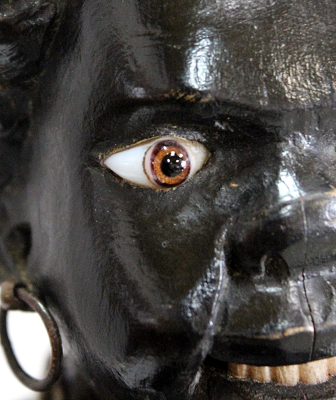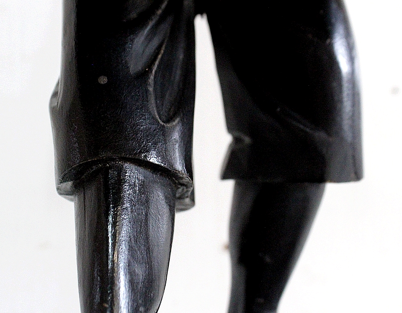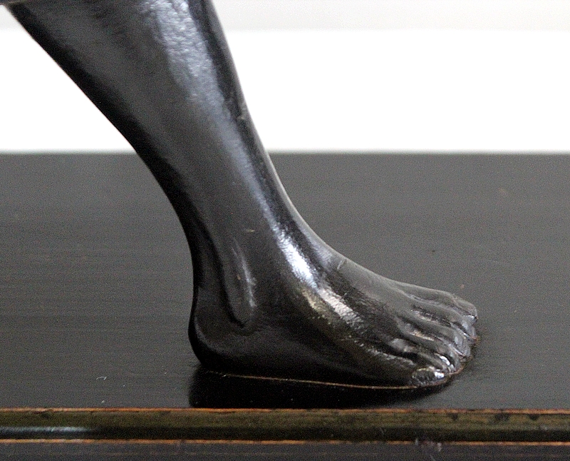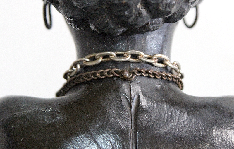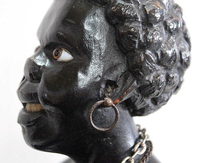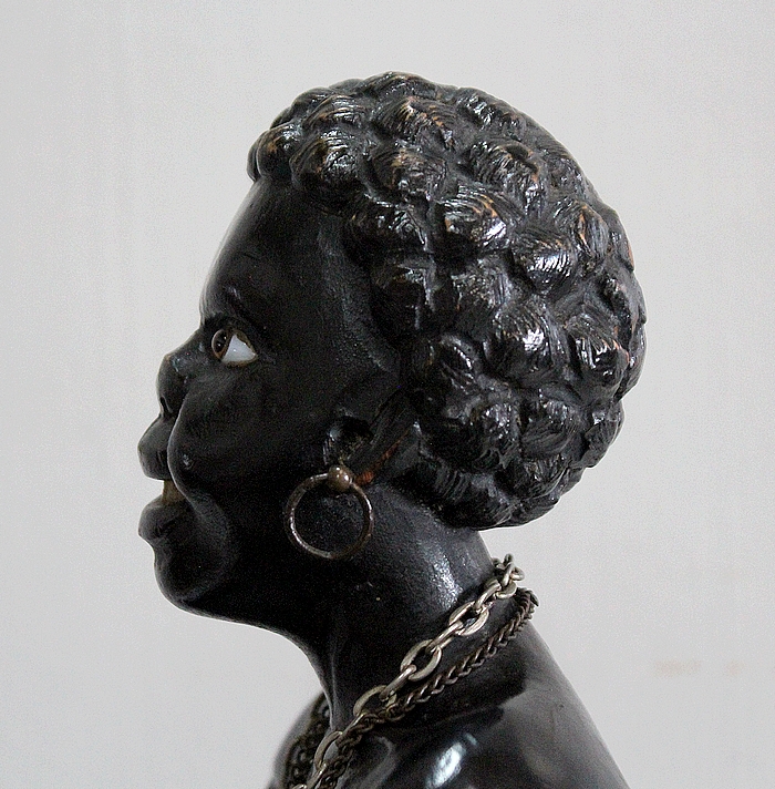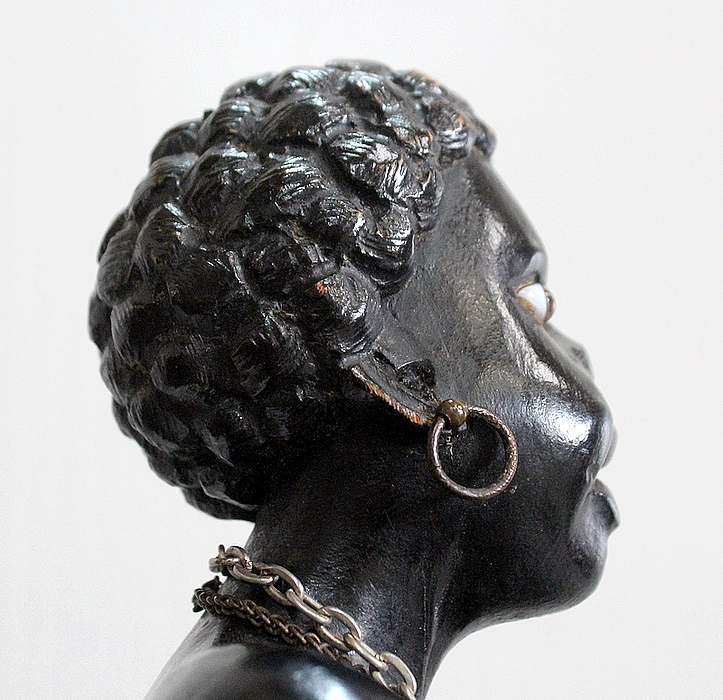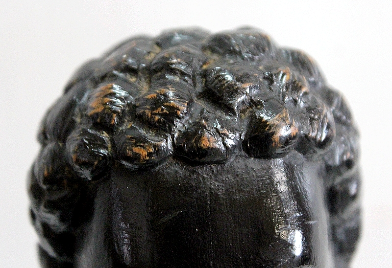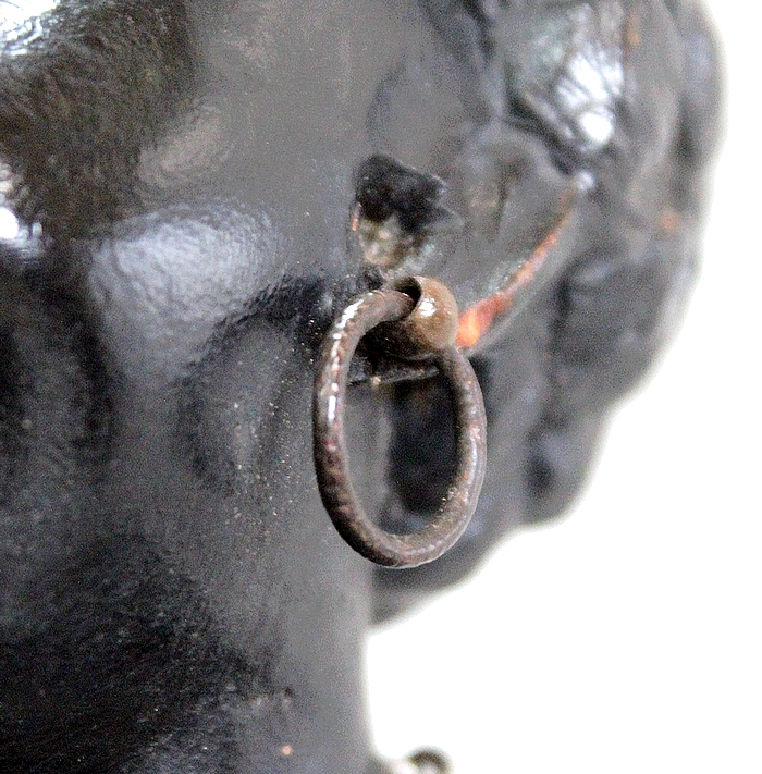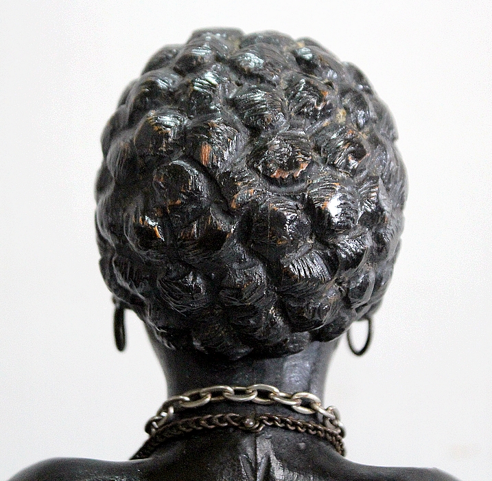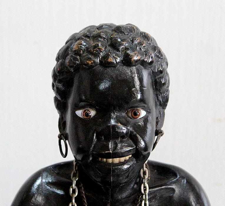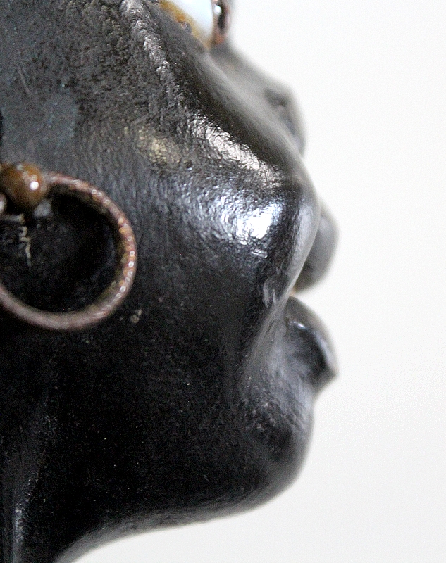 Le visage du Personnage exprime un large Sourire et un regard Vif. À noter que ses yeux ont probablement été recouverts de minutieuses capsules de Verre, de manière à leur donner scintillement, presque existence. Sa peau est Noire Ébène et ses cheveux courts, Bouclés et Crépus, soulignés par quelques mèches plus claires.