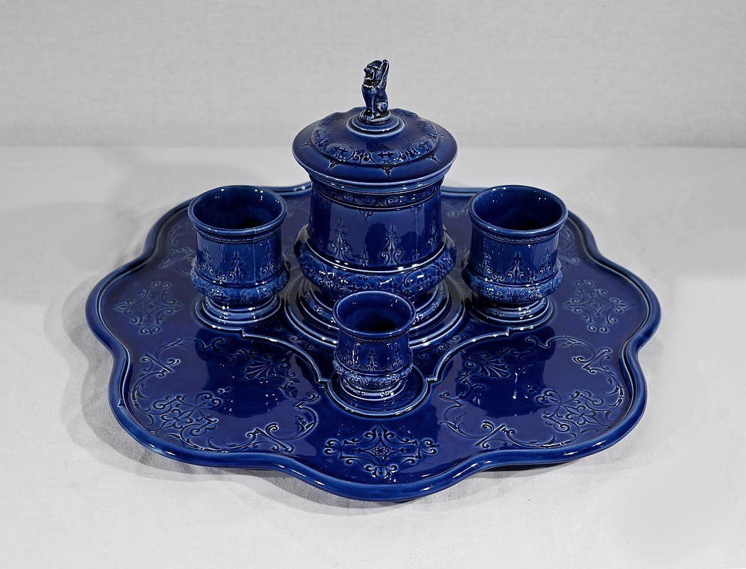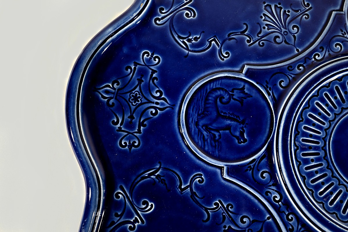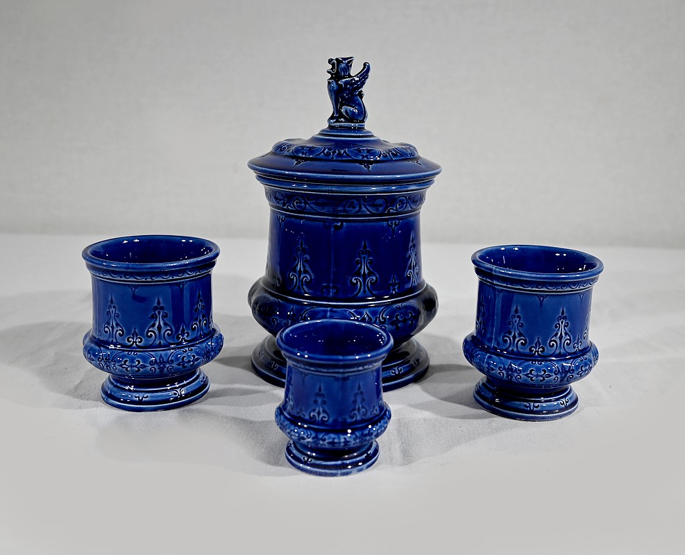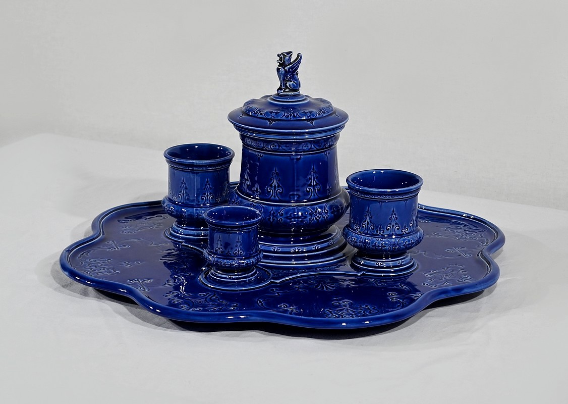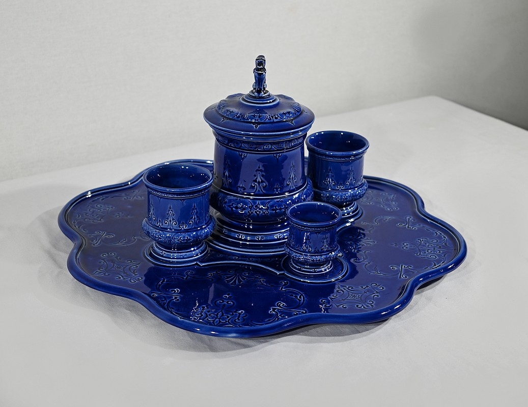 Ce service de cinq pièces est un modèle rare. Il se caractérise par sa teinte bleue profonde et ses ornementations sculptées finement.