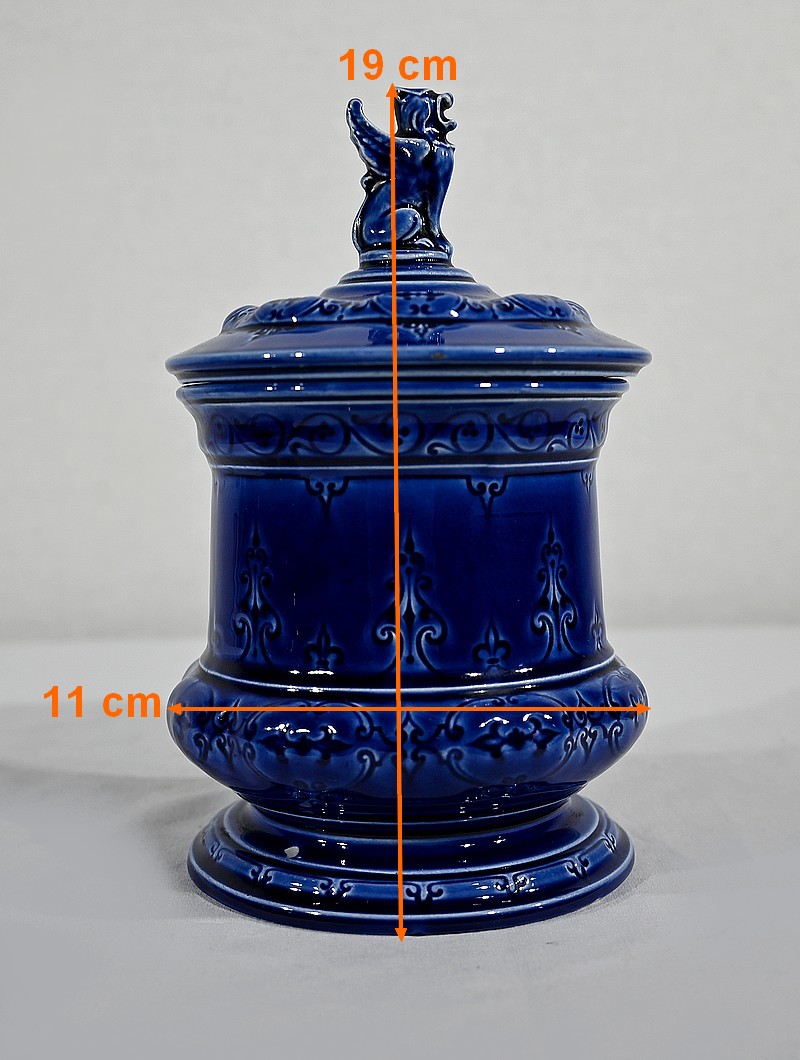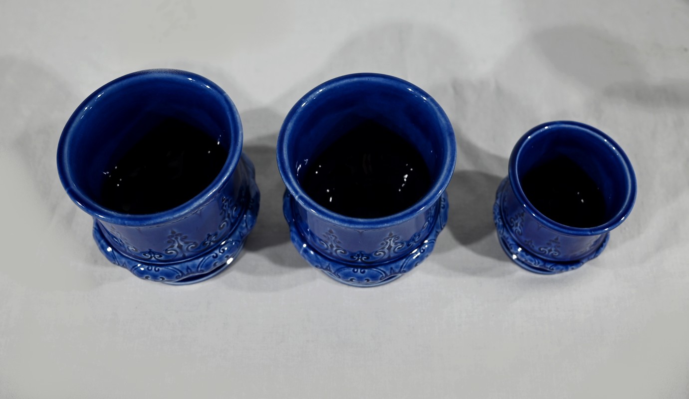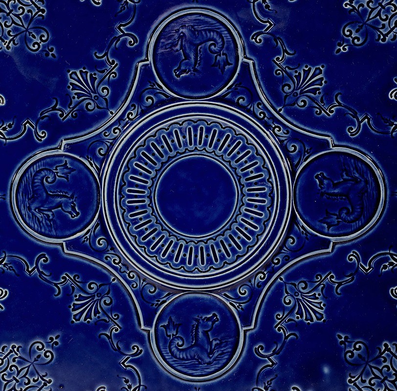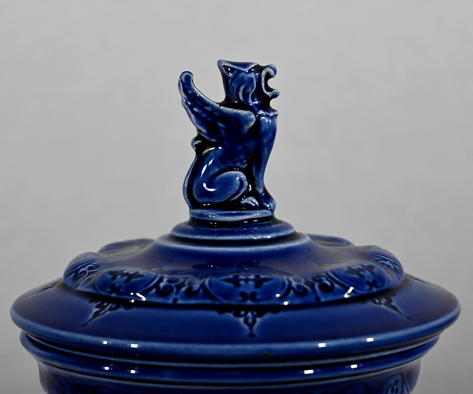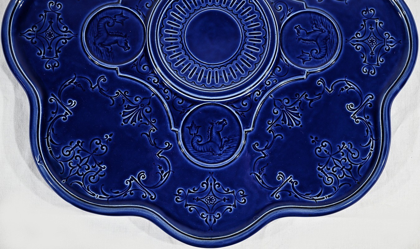 Ce service de cinq pièces est un modèle rare. Il se caractérise par sa teinte bleue profonde et ses ornementations sculptées finement.