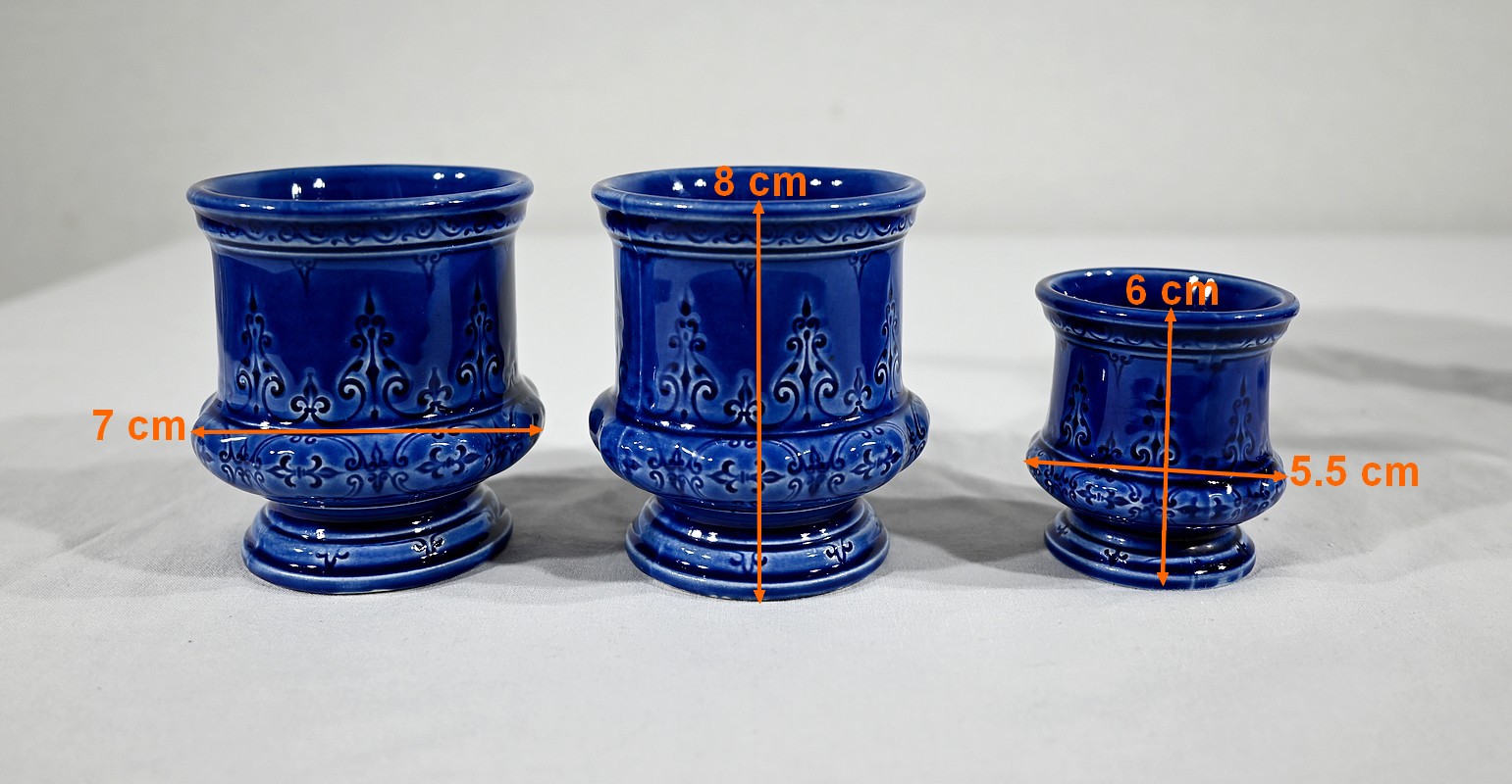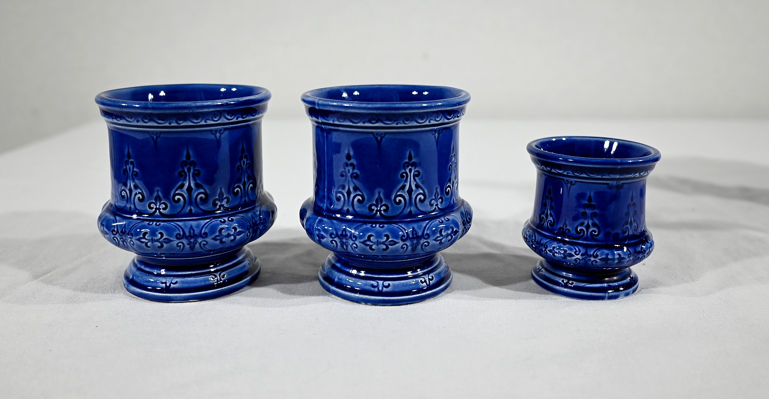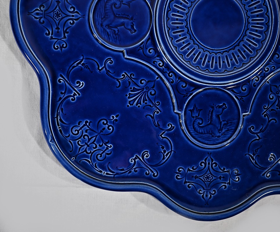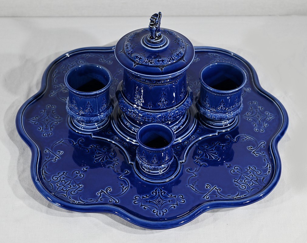 Bel ensemble en faïence constitué d’un plateau polylobé, d’un pot et de trois verres de couleur « bleu de Sèvres ».