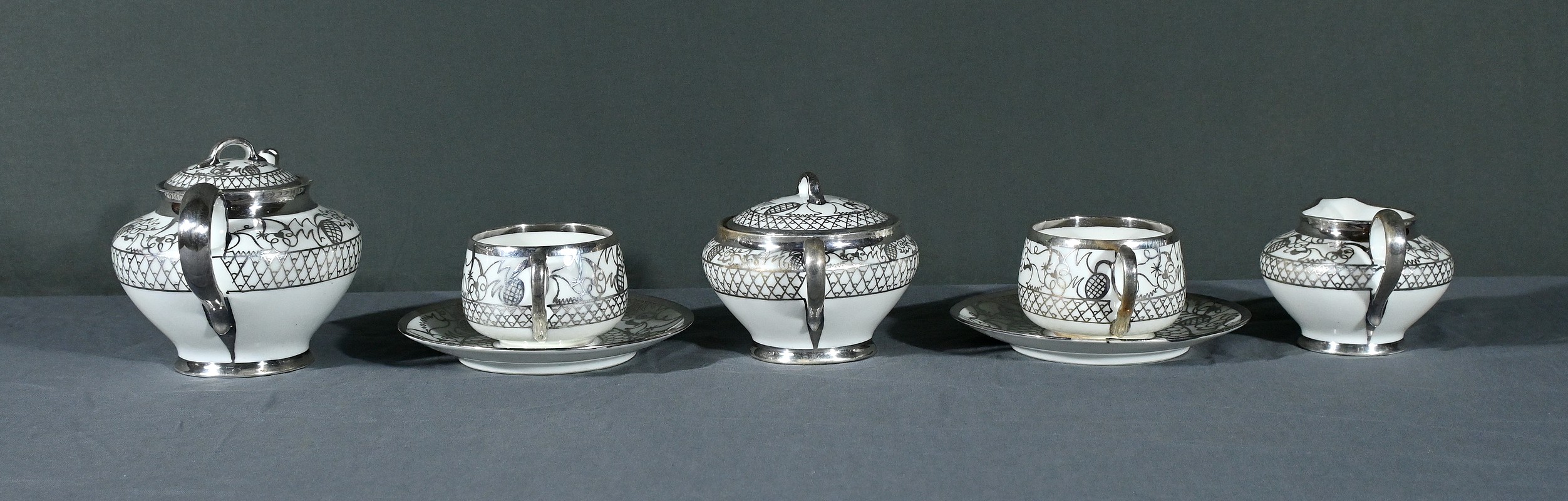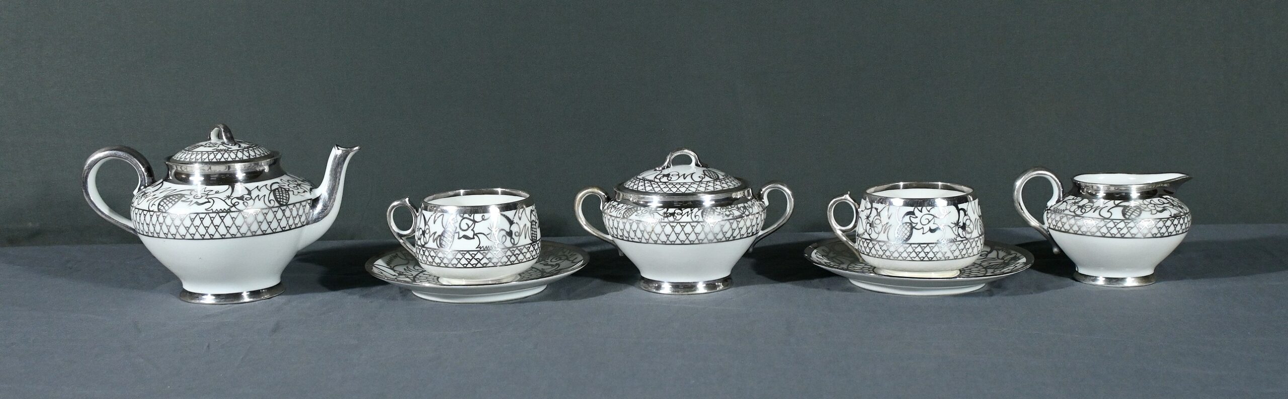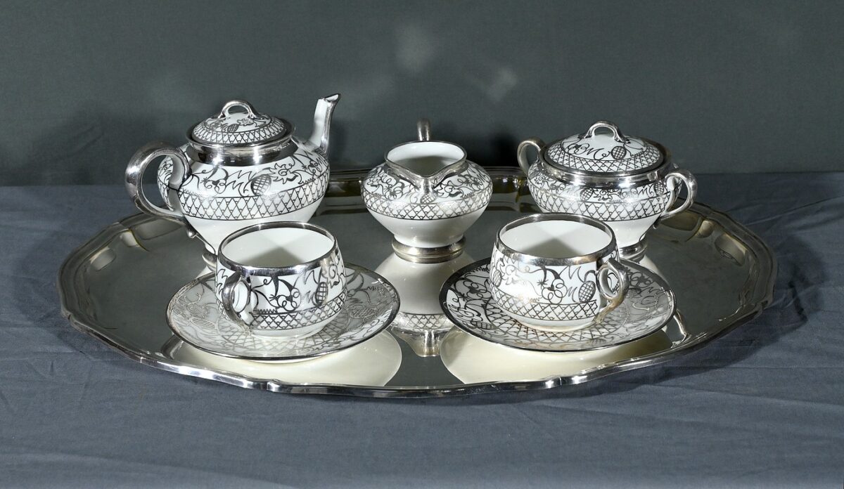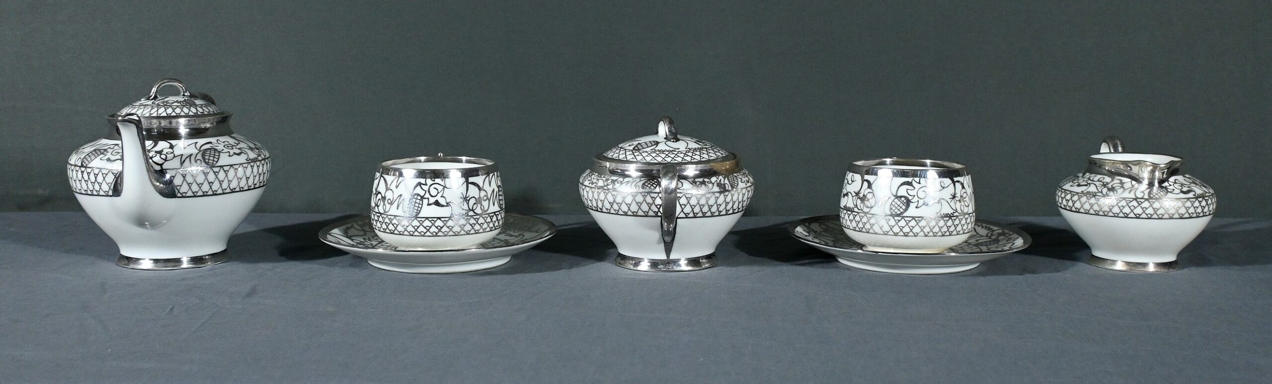 Service Tête-à-tête pour le thé ou le café en porcelaine émaillée issue de la manufacture de Limoges. Il s’agit du modèle Saint Graal à décor argenté de frises losangées et géométriques, accompagnées d’arabesques. Ce service comprend une verseuse, un sucrier, un pot à lait, deux tasses et sous-tasse et un plateau en métal argenté. Nous retrouvons l’estampille « LIMOGES France » sous plusieurs pièces. L’ensemble est en très bel état.