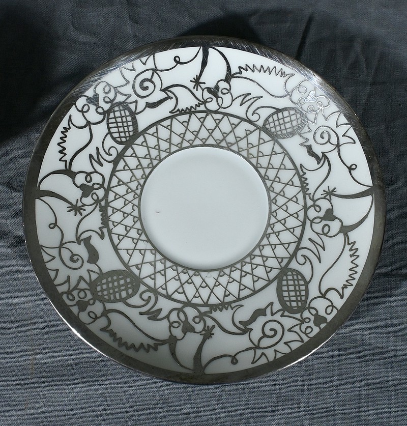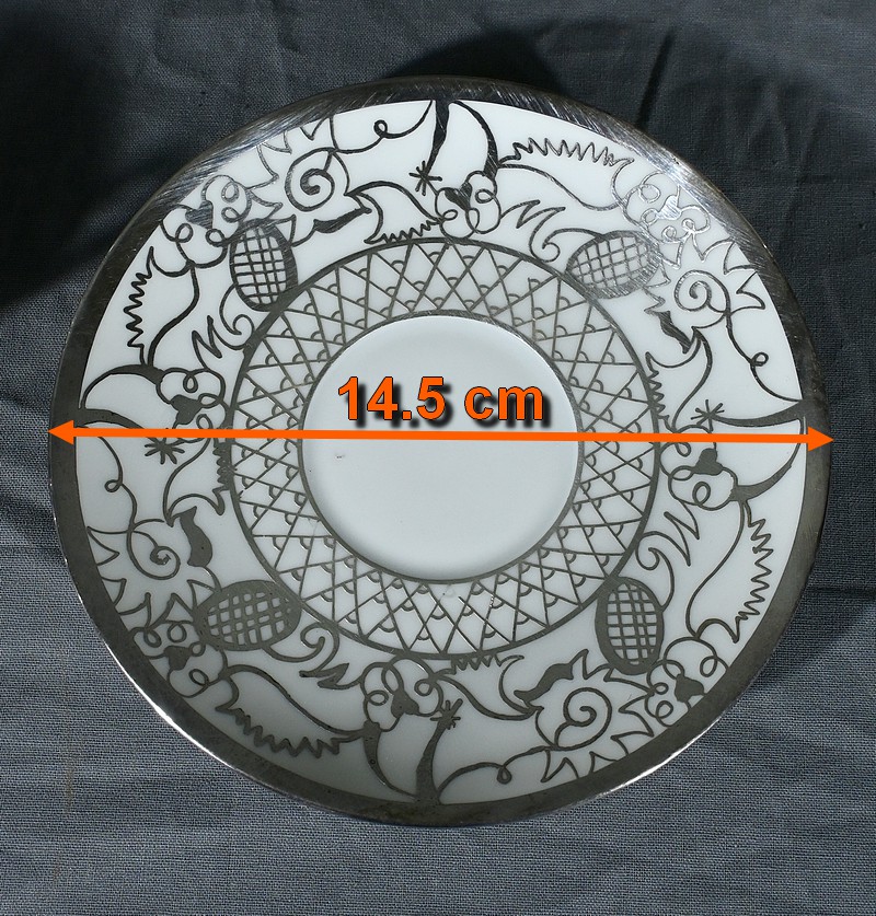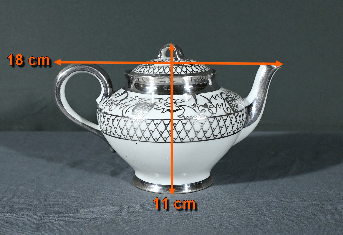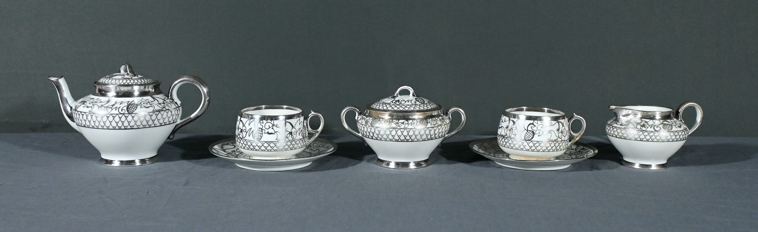 Service Tête-à-tête pour le thé ou le café en porcelaine émaillée issue de la manufacture de Limoges. Il s’agit du modèle Saint Graal à décor argenté de frises losangées et géométriques, accompagnées d’arabesques. Ce service comprend une verseuse, un sucrier, un pot à lait, deux tasses et sous-tasse et un plateau en métal argenté. Nous retrouvons l’estampille « LIMOGES France » sous plusieurs pièces. L’ensemble est en très bel état.