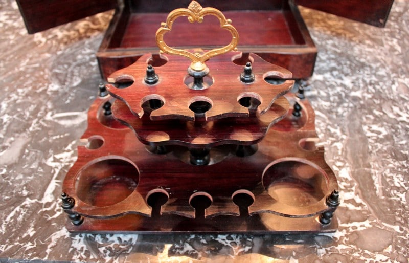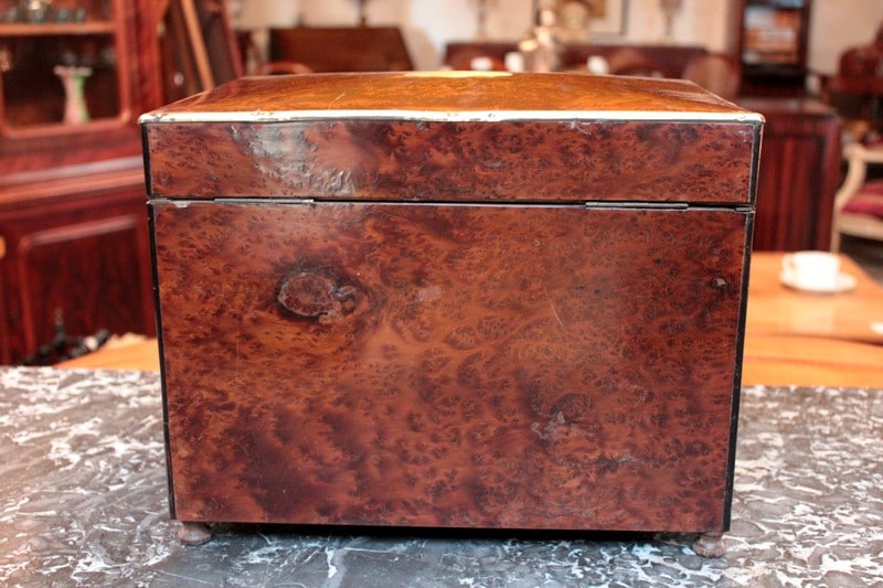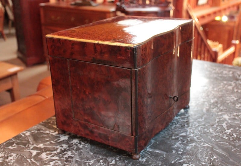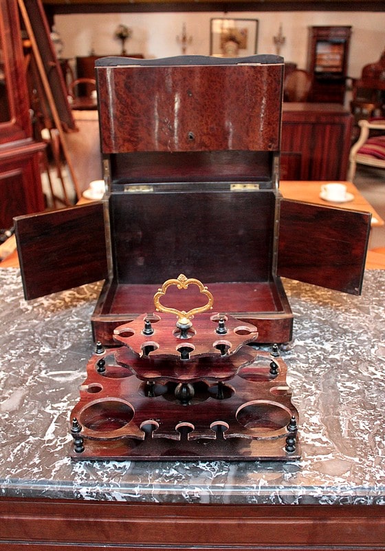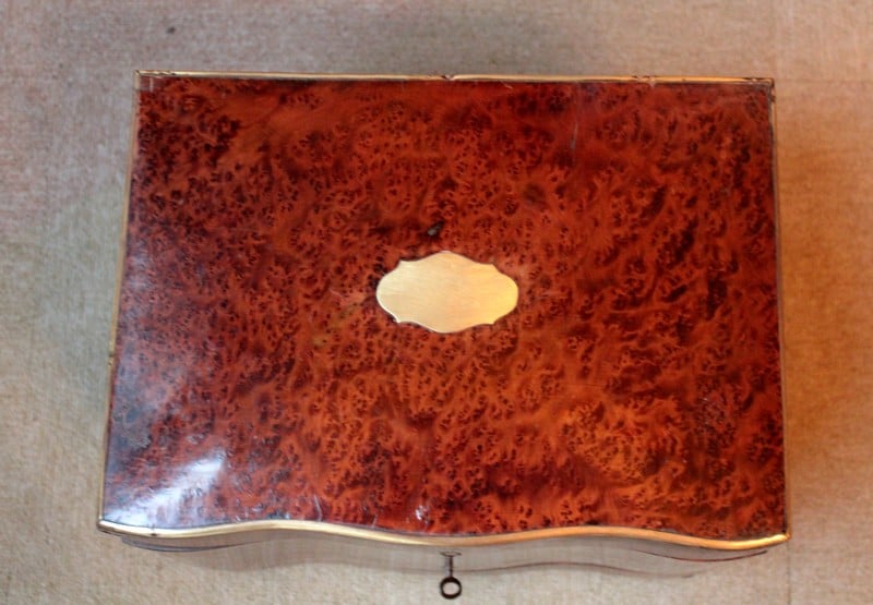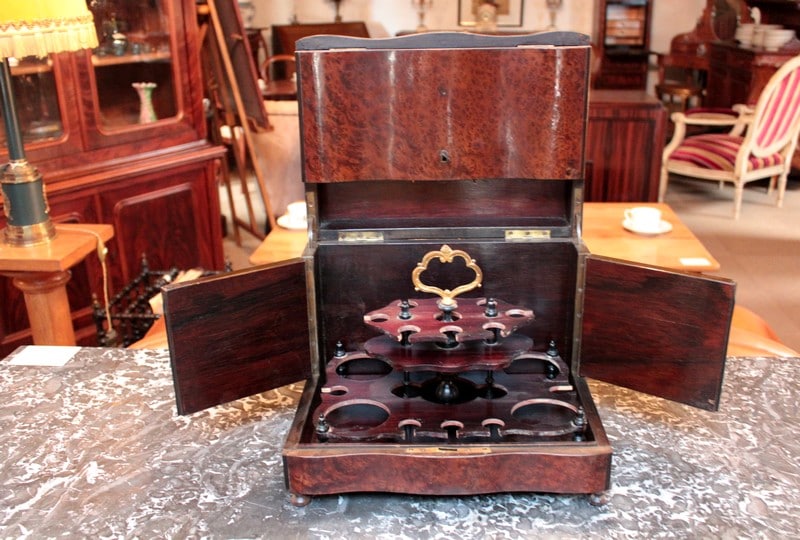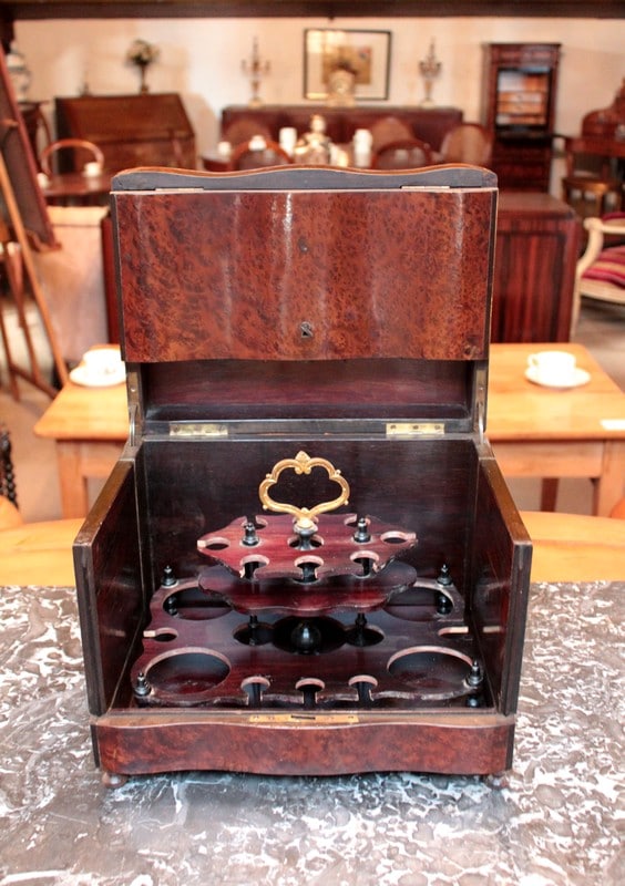 Cave à liqueurs en loupe de thuya avec intérieur en palissandre, sans verrerie. Motif et moulure de laiton sur le couvercle. Le support de carafes et verres est garni d’une poignée en laiton.