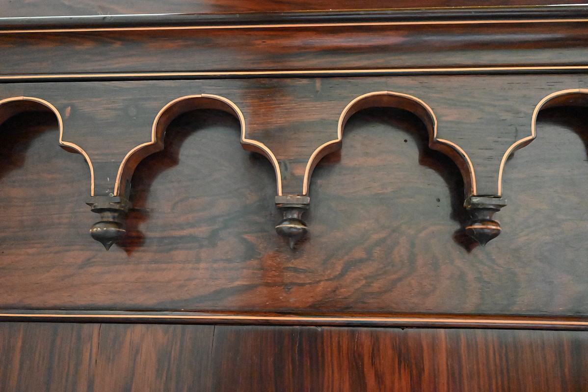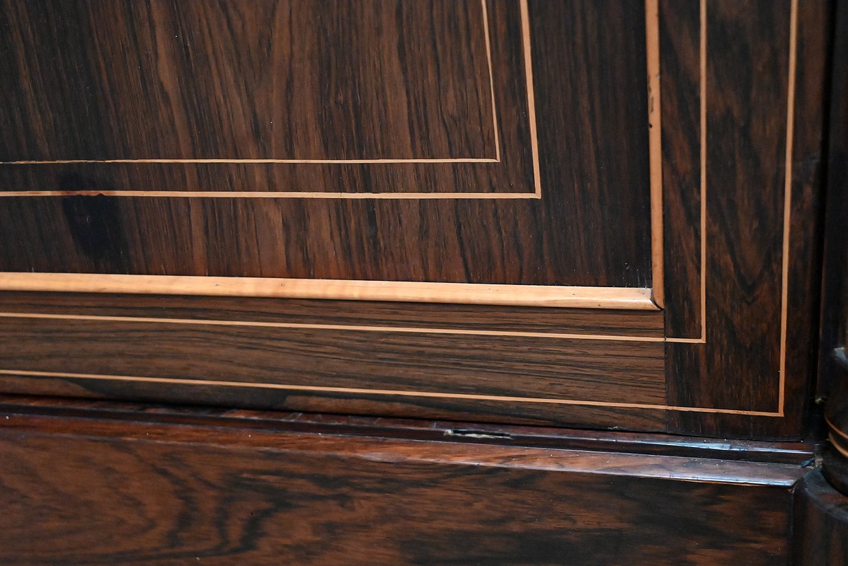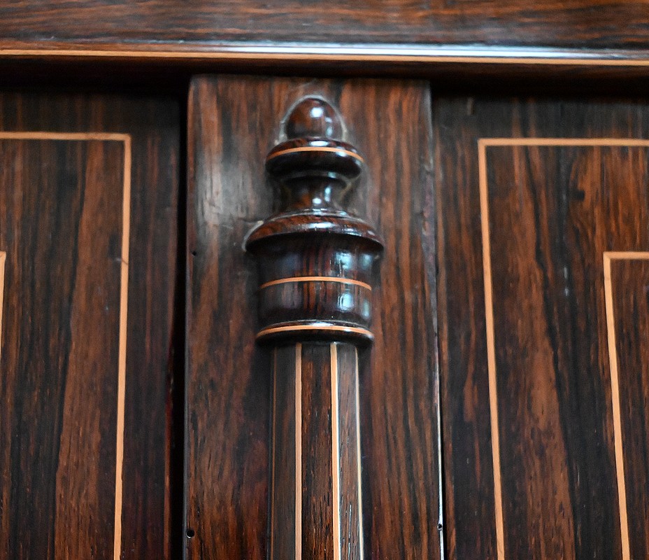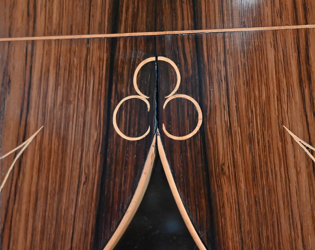 Le fronton offre des motifs finement découpés, avec tombée de petits glands en Palissandre et Citronnier.