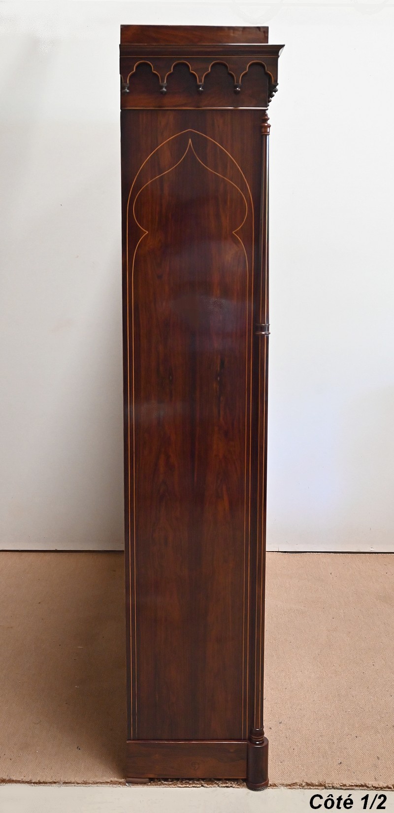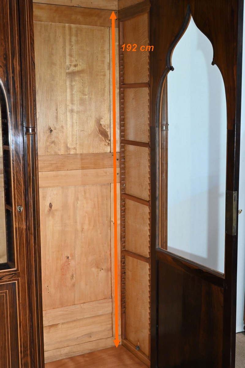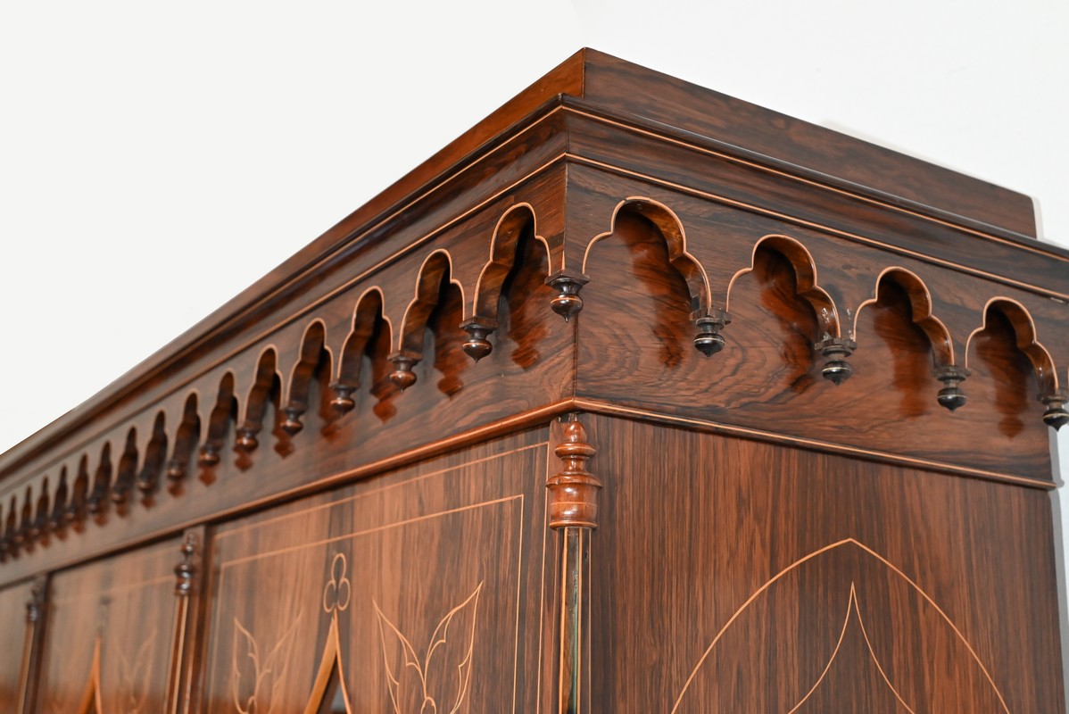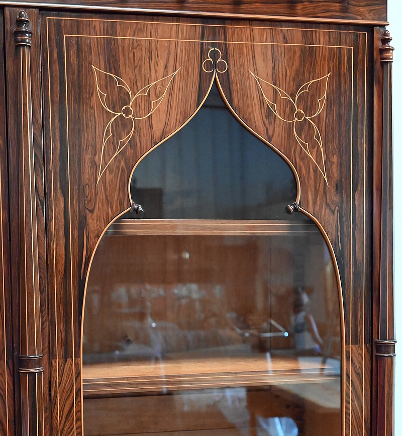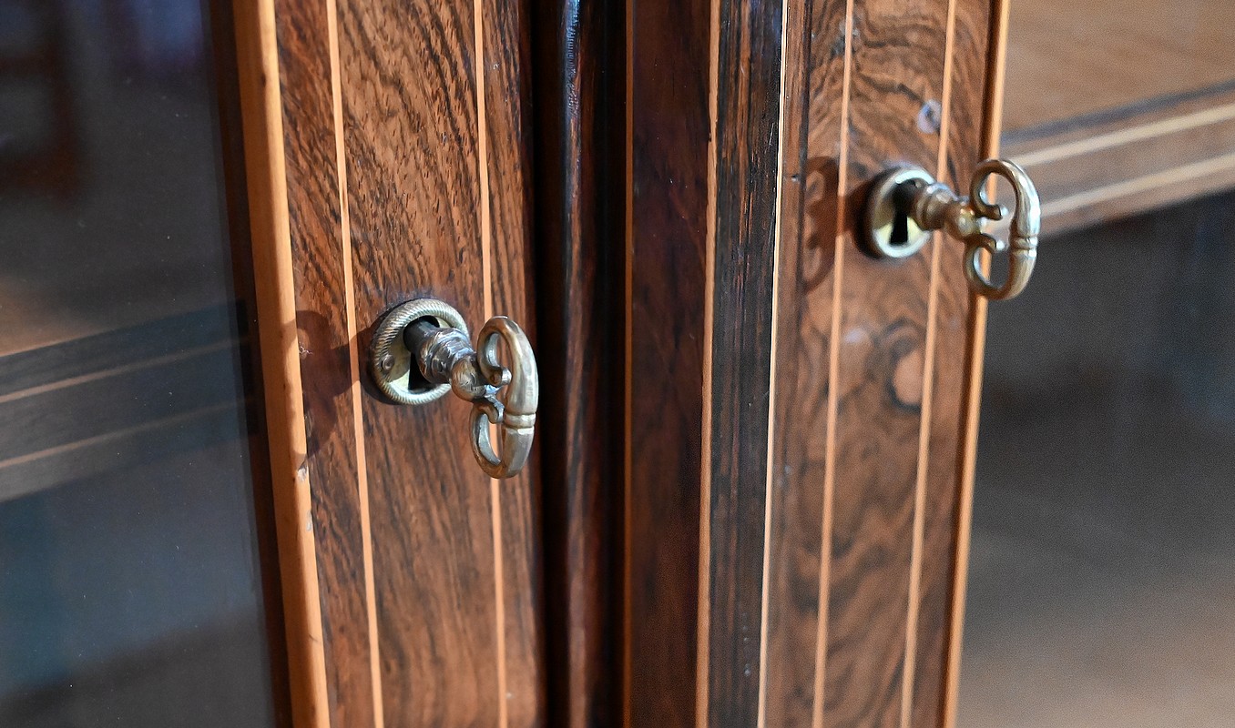 Le vitrage, de forme dite « à cathédrale », est mouvementé dans la partie haute, et entouré de filets et d’une fine baguette de Citronnier.