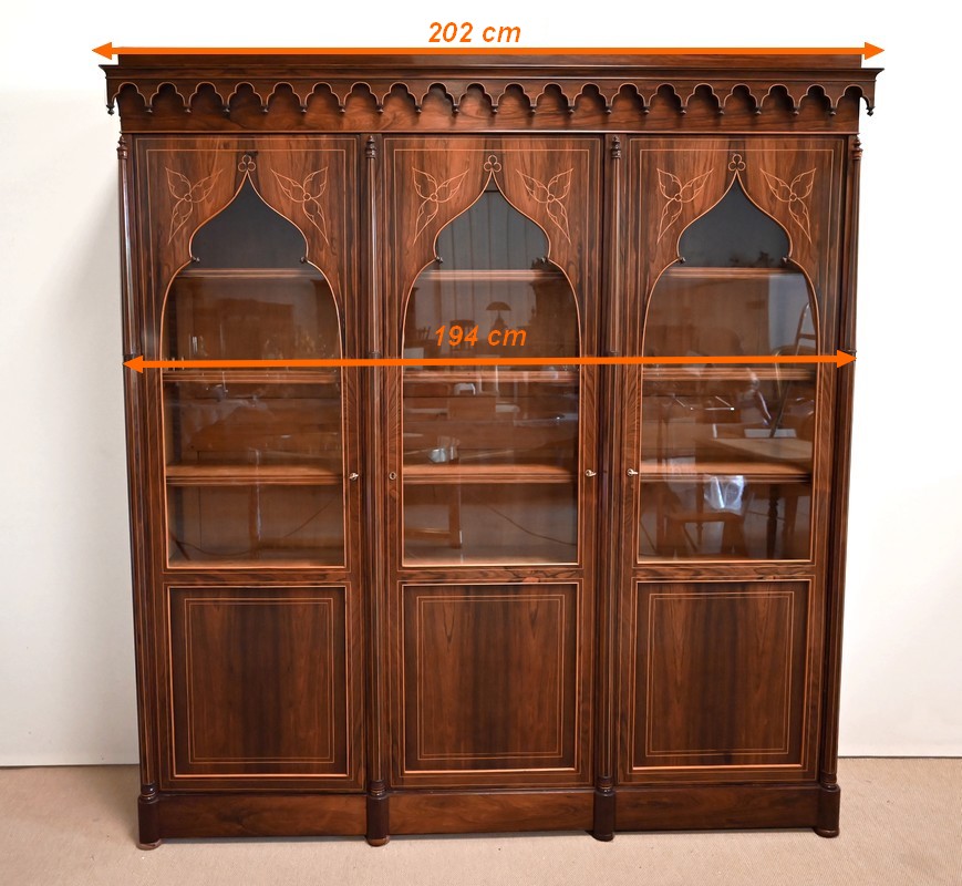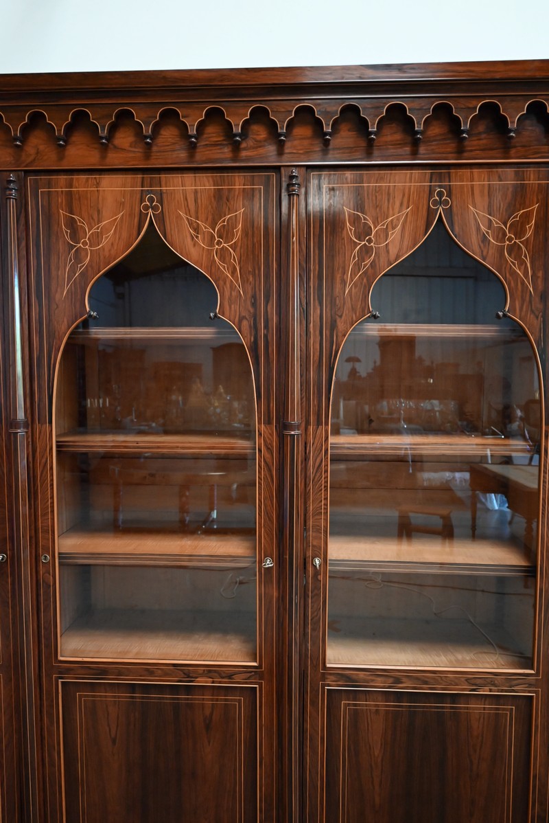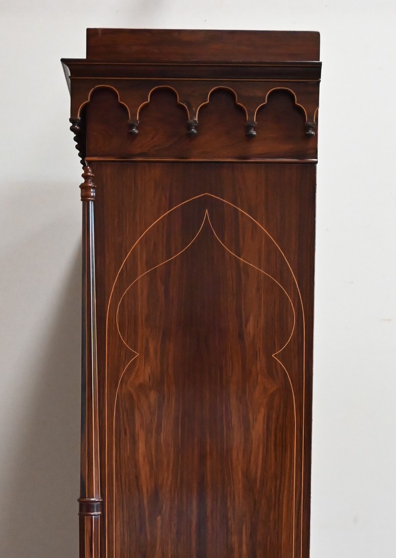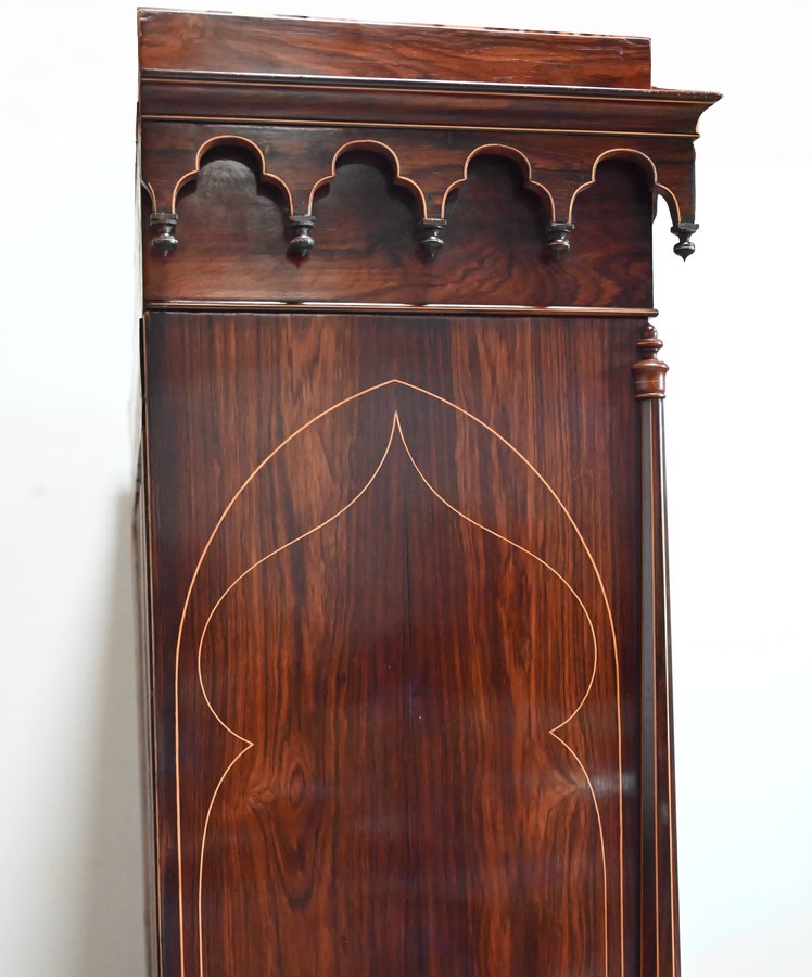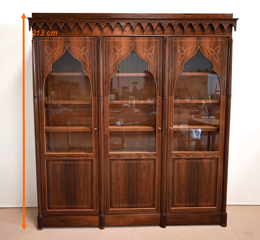 Le vitrage, de forme dite « à cathédrale », est mouvementé dans la partie haute, et entouré de filets et d’une fine baguette de Citronnier.