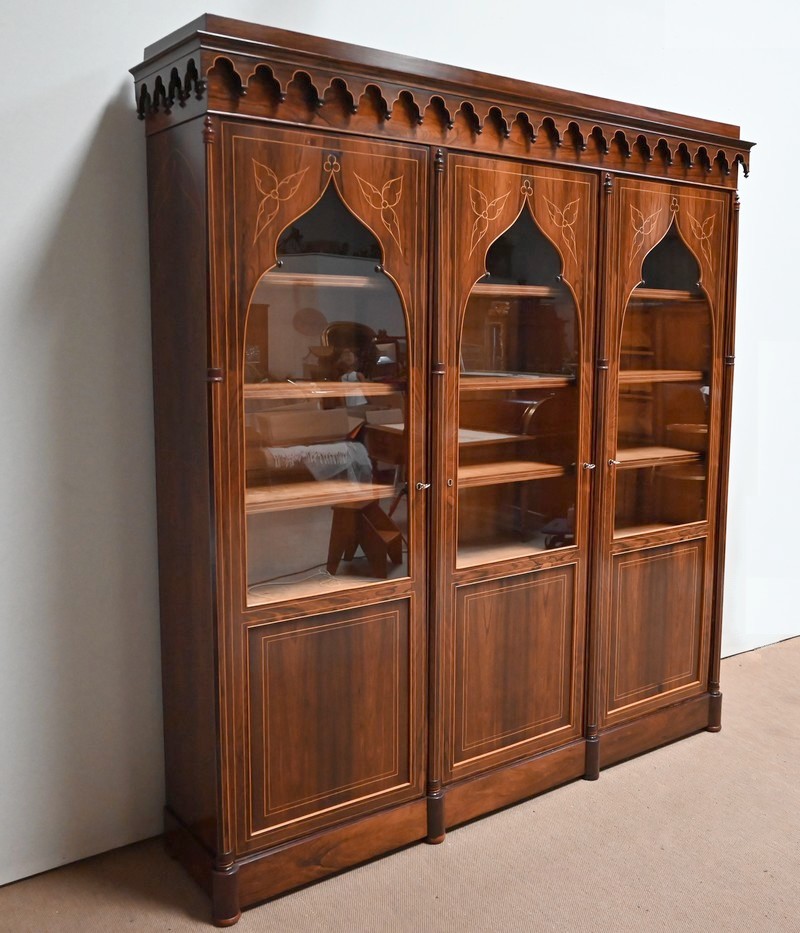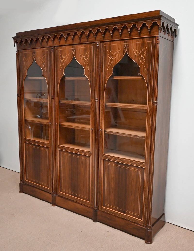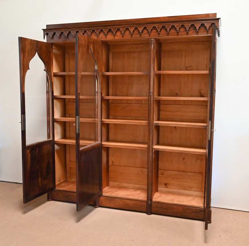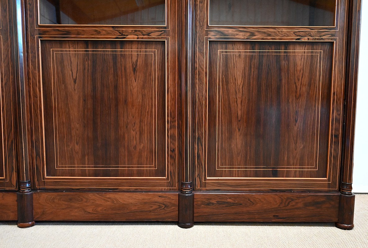 Bibliothèque intégralement composée de placage de Palissandre de Rio avec incrustations de filets de Citronnier sur ses faces visibles.