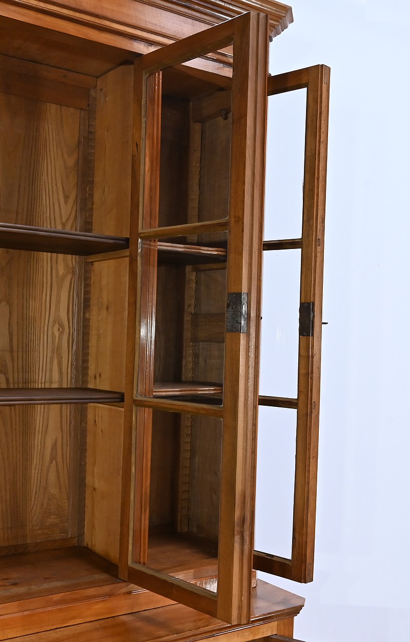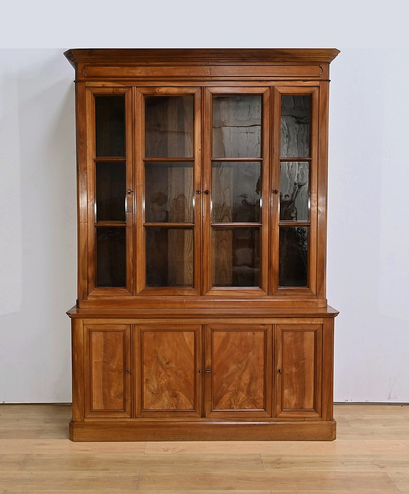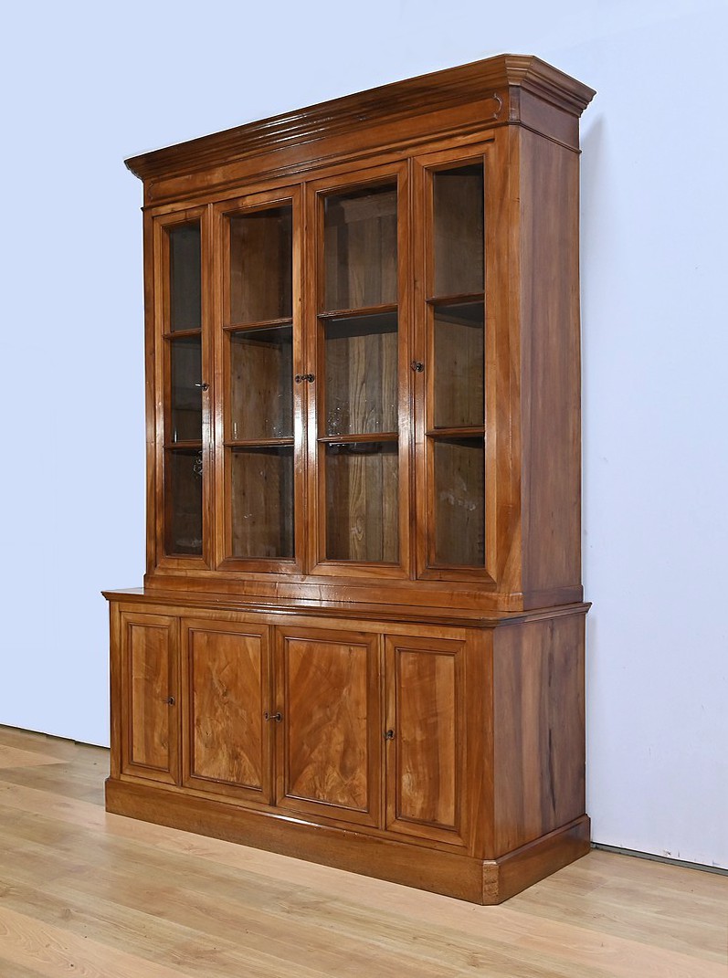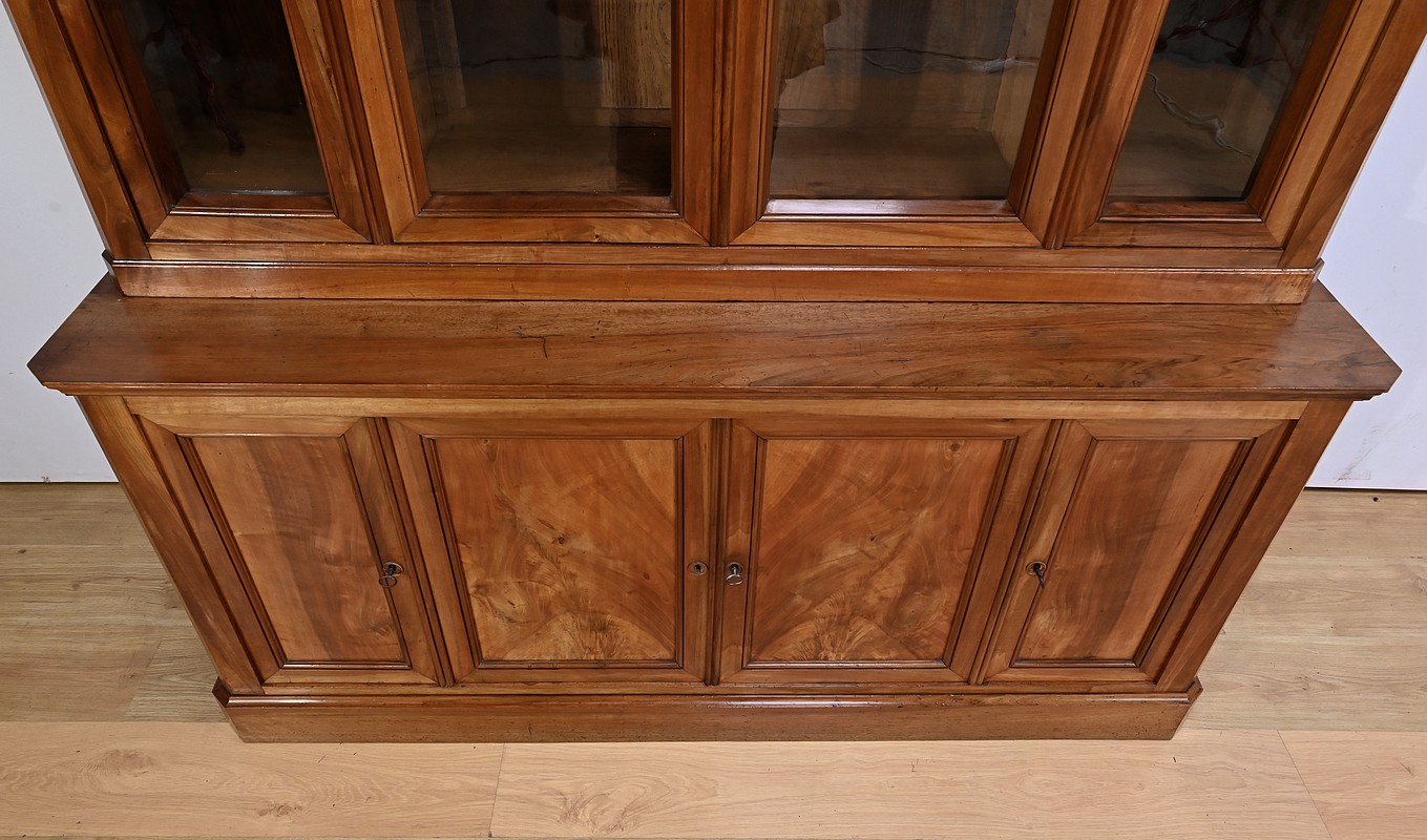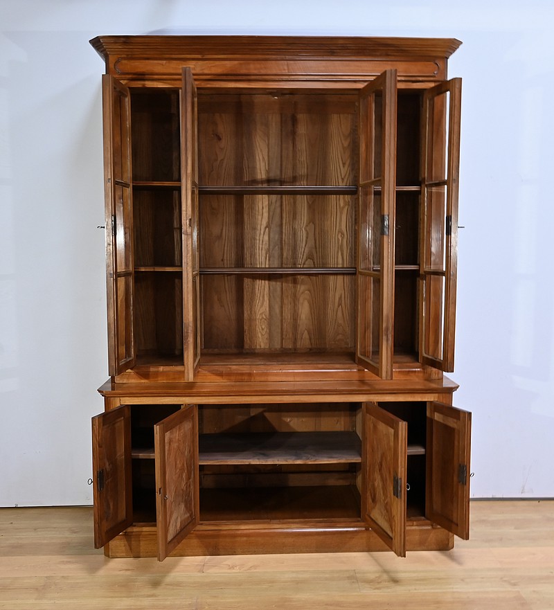 Bibliothèque constituée de deux parties. La partie haute ouvre par quatre portes, dont deux latérales plus étroites, dotées de vitres d’origine séparées par des barreaux. L’intérieur est garni d’étagères réglables sur crémaillères. Cette bibliothèque est chapeautée par un fronton avec moulures et corniche démontable. La partie basse du meuble est constituée de quatre portes possédant un encadrement à coupe d’onglet. Ces portes moulurées sont foncées de panneaux en noyer massif disposés symétriquement. A l’intérieur, nous retrouvons des étagères réglables sur crémaillères. Toutes les serrures, d’origine, sont en état de fonctionnement et accompagnées de leur clé.