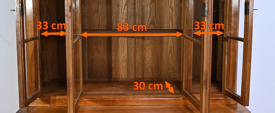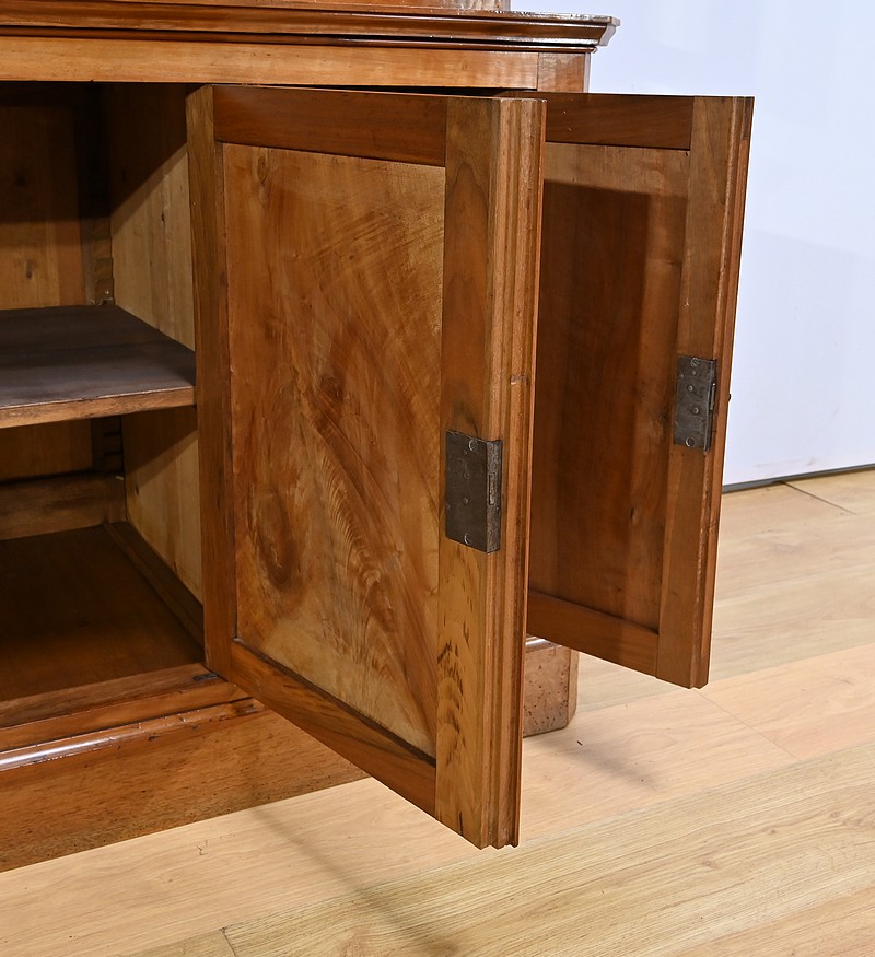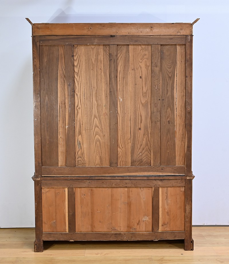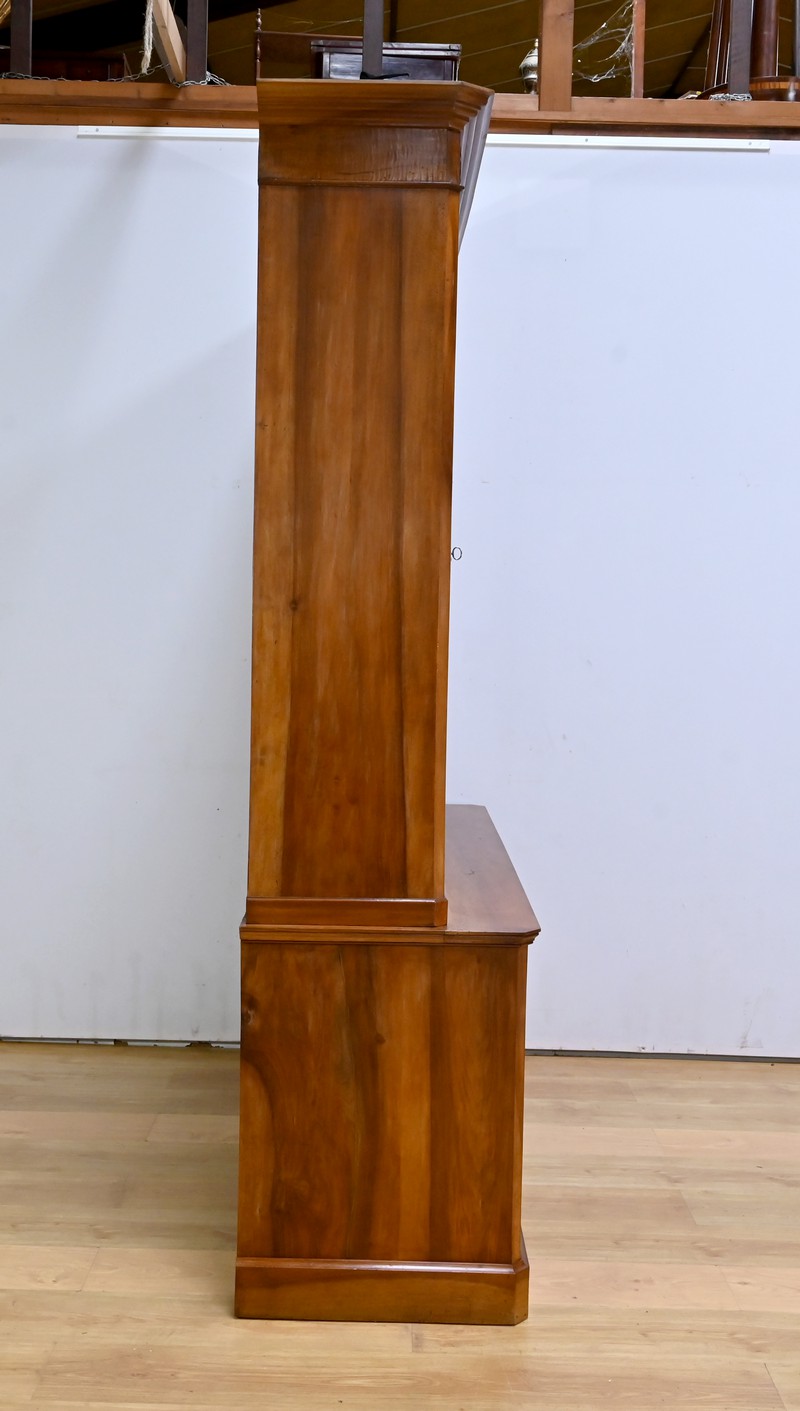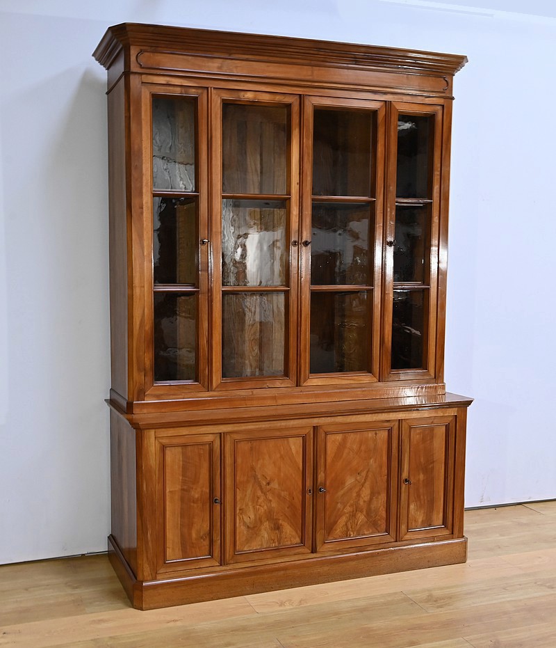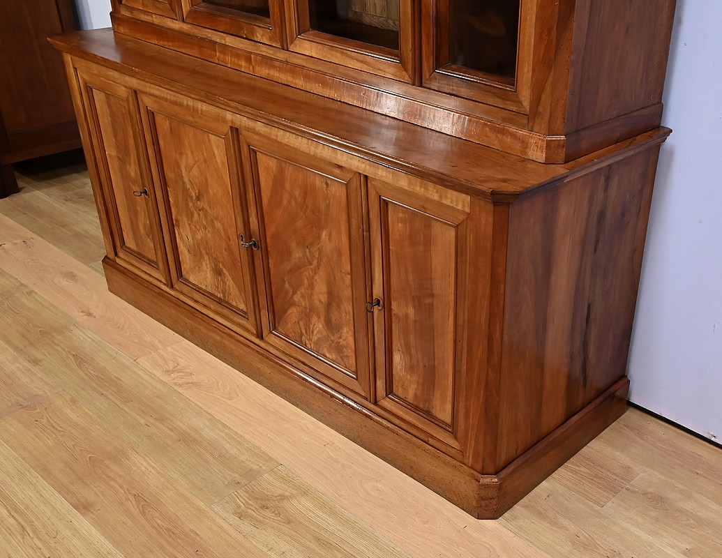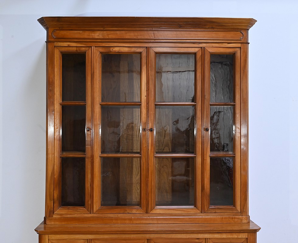 Bibliothèque constituée de deux parties. La partie haute ouvre par quatre portes, dont deux latérales plus étroites, dotées de vitres d’origine séparées par des barreaux. L’intérieur est garni d’étagères réglables sur crémaillères. Cette bibliothèque est chapeautée par un fronton avec moulures et corniche démontable. La partie basse du meuble est constituée de quatre portes possédant un encadrement à coupe d’onglet. Ces portes moulurées sont foncées de panneaux en noyer massif disposés symétriquement. A l’intérieur, nous retrouvons des étagères réglables sur crémaillères. Toutes les serrures, d’origine, sont en état de fonctionnement et accompagnées de leur clé.