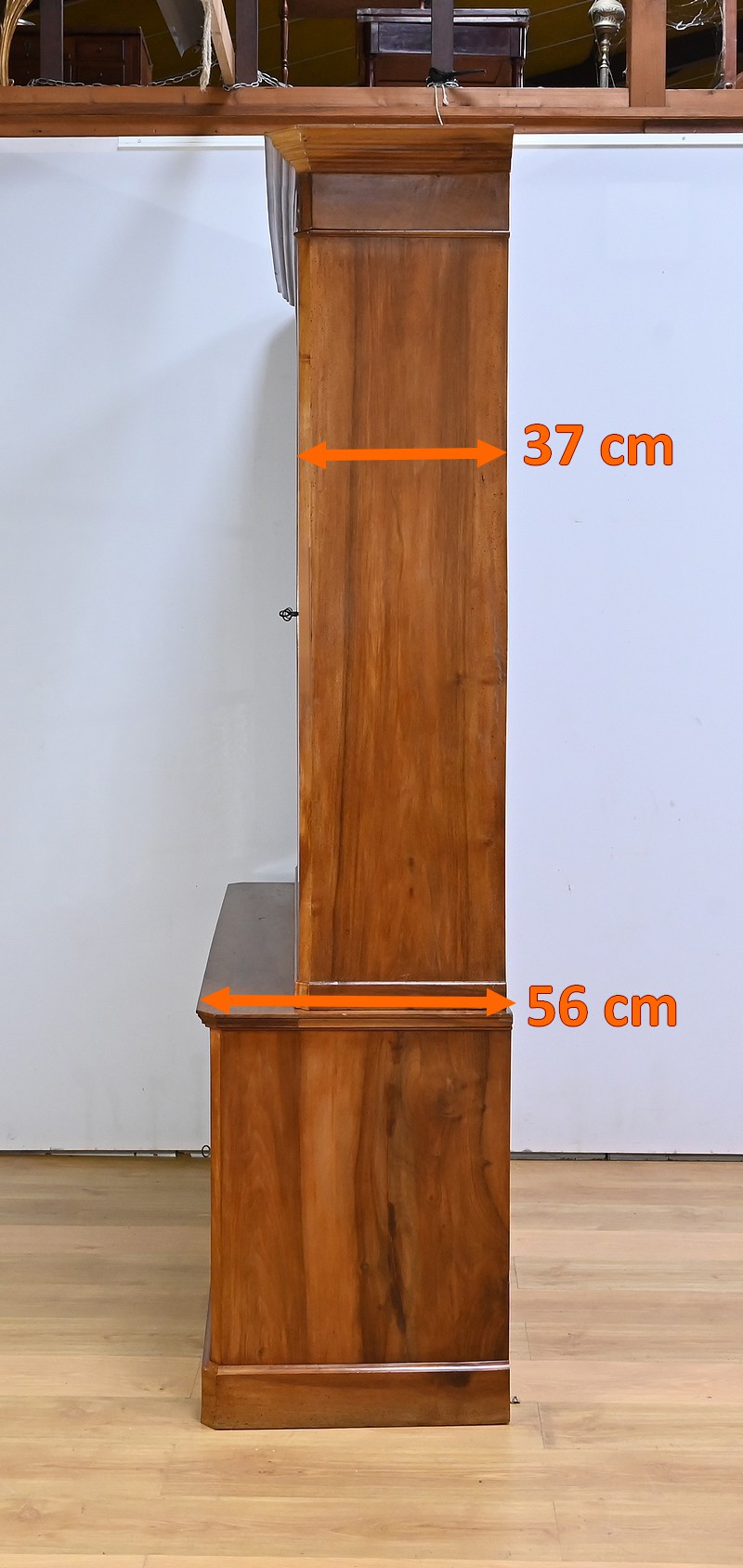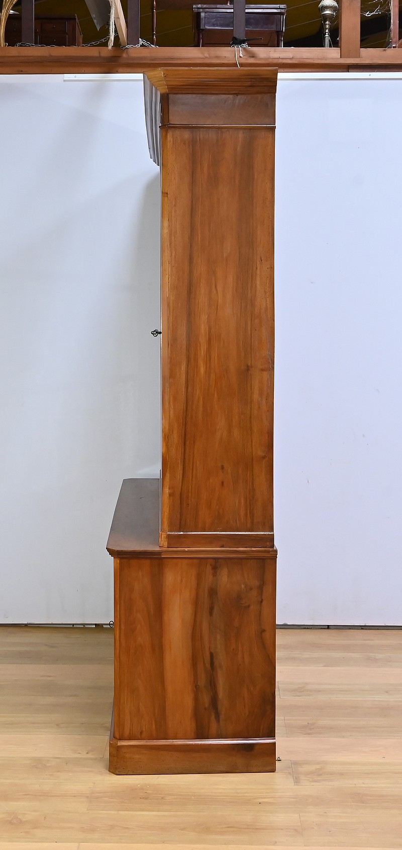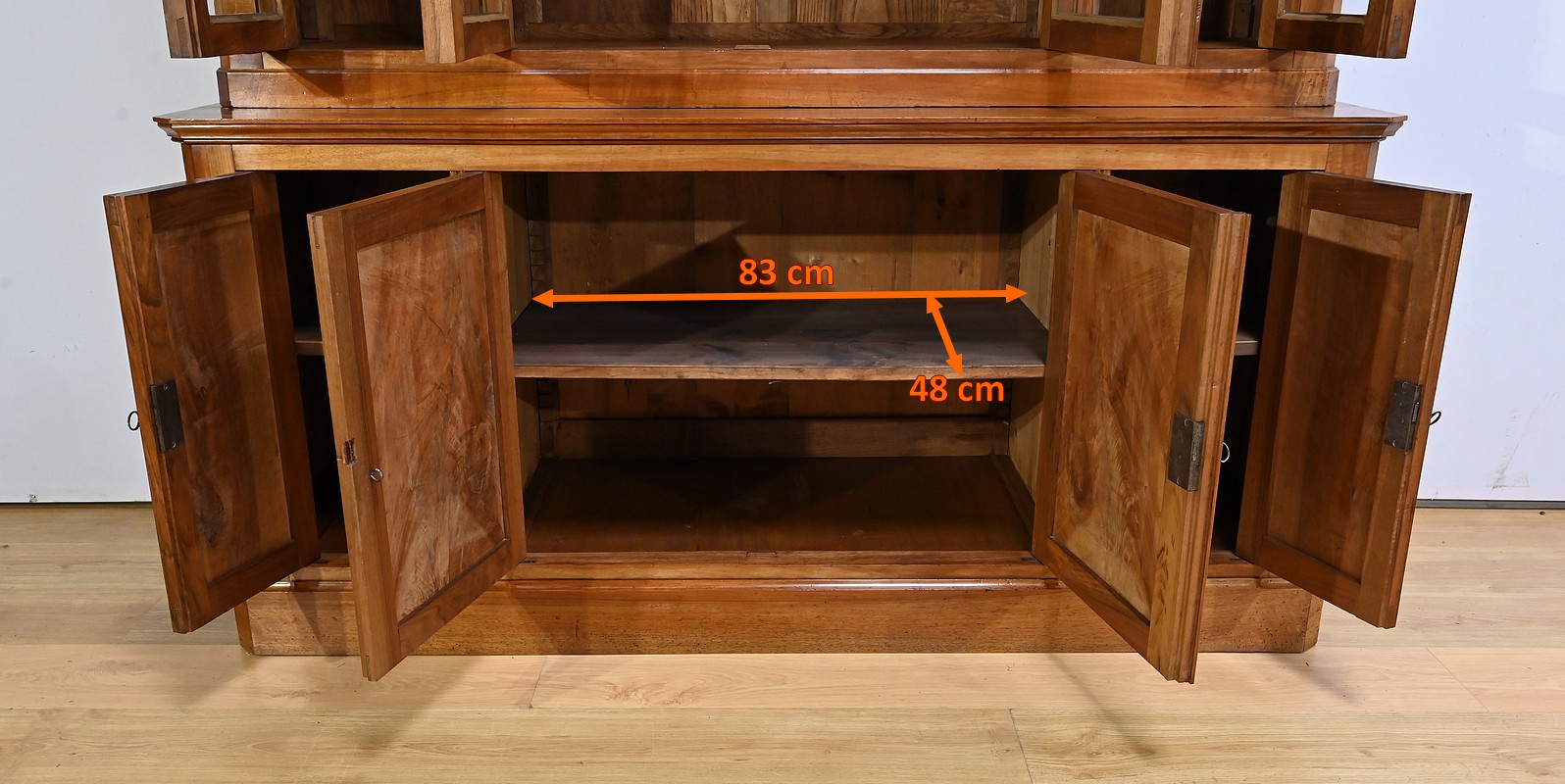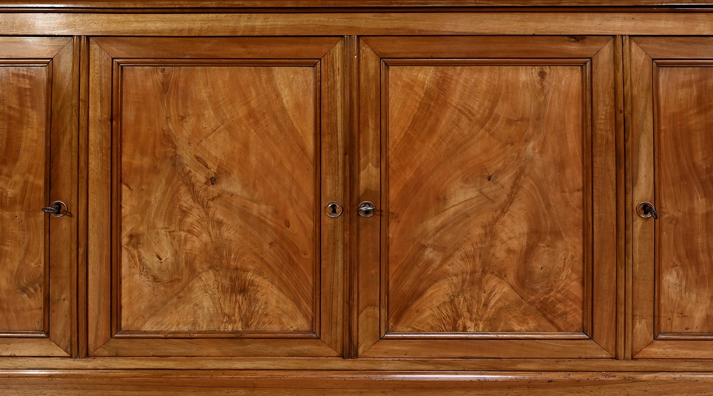 Bibliothèque constituée de deux parties. La partie haute ouvre par quatre portes, dont deux latérales plus étroites, dotées de vitres d’origine séparées par des barreaux. L’intérieur est garni d’étagères réglables sur crémaillères. Cette bibliothèque est chapeautée par un fronton avec moulures et corniche démontable. La partie basse du meuble est constituée de quatre portes possédant un encadrement à coupe d’onglet. Ces portes moulurées sont foncées de panneaux en noyer massif disposés symétriquement. A l’intérieur, nous retrouvons des étagères réglables sur crémaillères. Toutes les serrures, d’origine, sont en état de fonctionnement et accompagnées de leur clé.