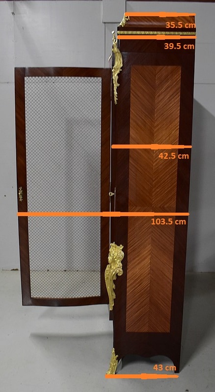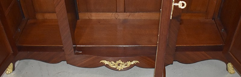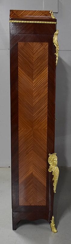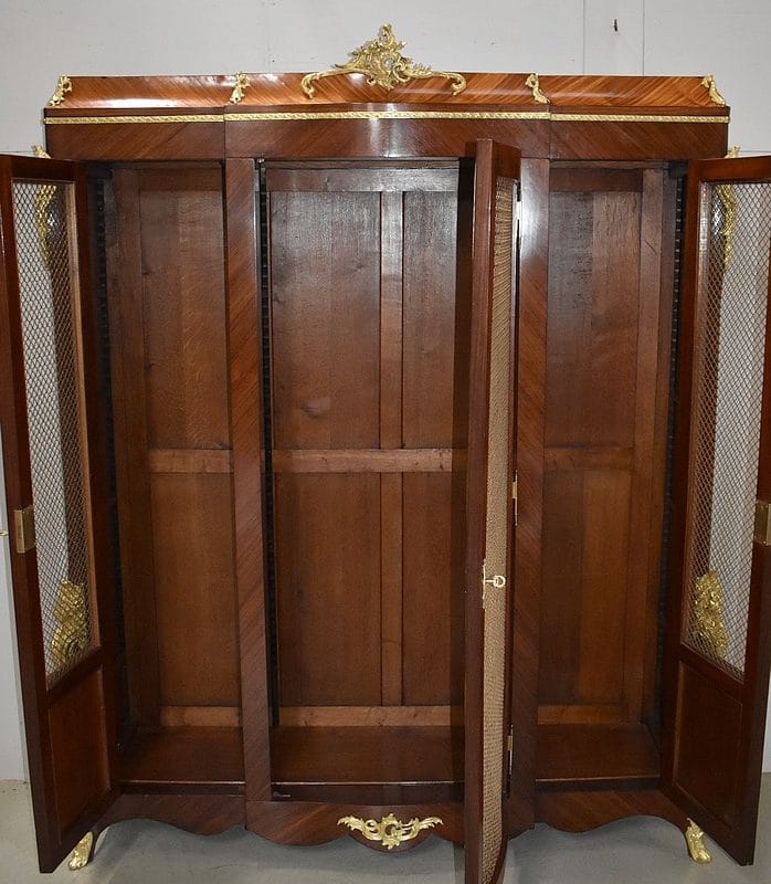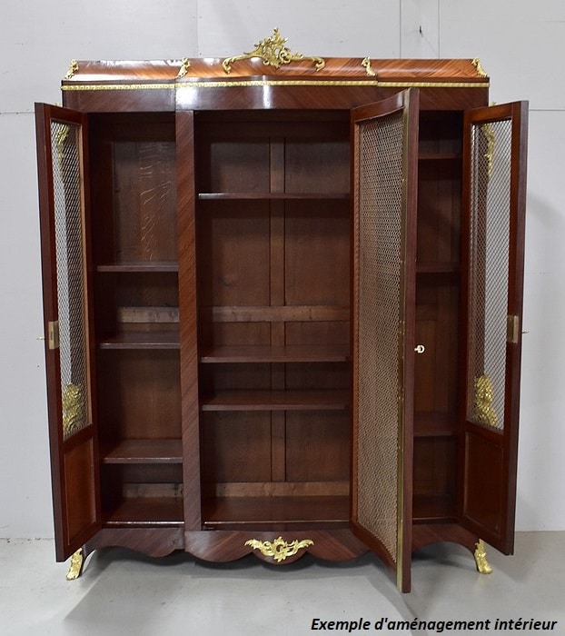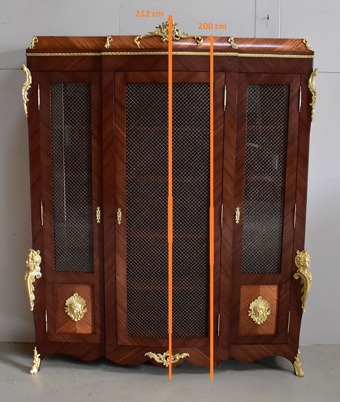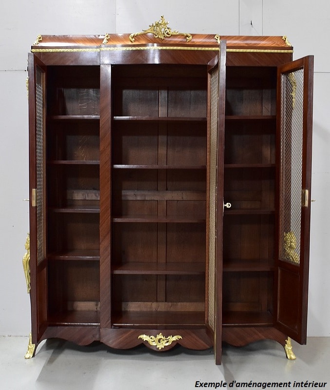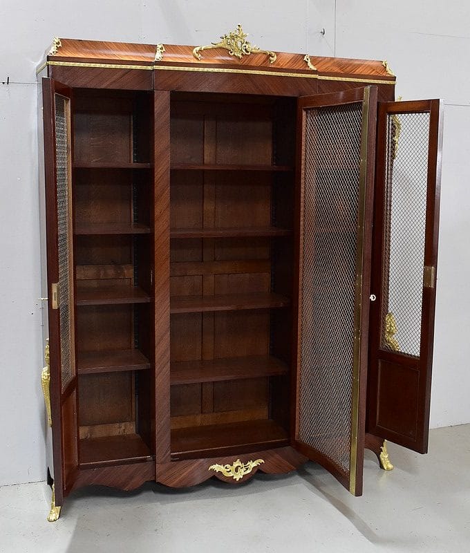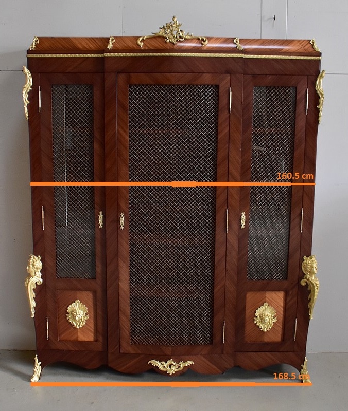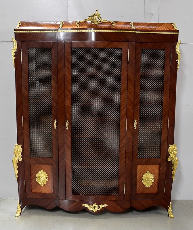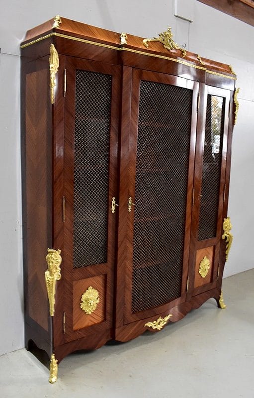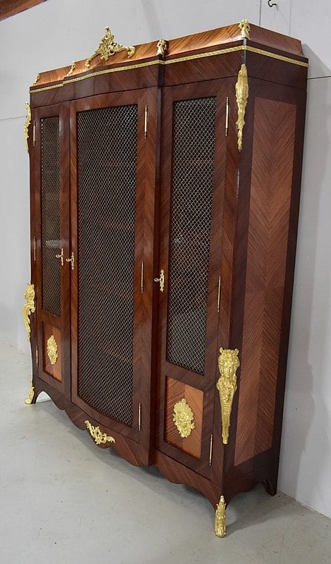 Bibliothèque style Louis XV, avec partie centrale à ressaut. Elle ouvre par trois portes, à encadrements en Placage de Bois de Violette. Elles sont Grillagées de Laiton, et se verrouillent puisque pourvues de Serrures en état de fonctionnement. Le Meuble est fourni avec ses trois clés. Les deux portes latérales, plus étroites que celle du milieu, se distinguent également par la présence de Vitres en parties hautes. De plus, leurs parties basses sont pleines et composées de panneaux en retrait, en Placage d’Acajou Blond disposé en Chevrons. Leurs centres sont agrémentés de deux Importants Mascarons à visages d’Hommes.