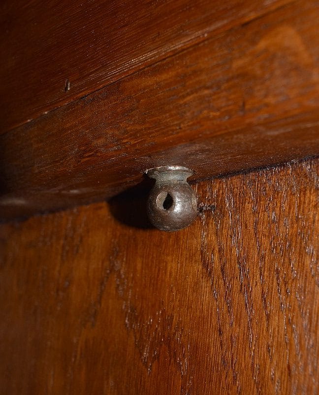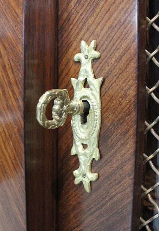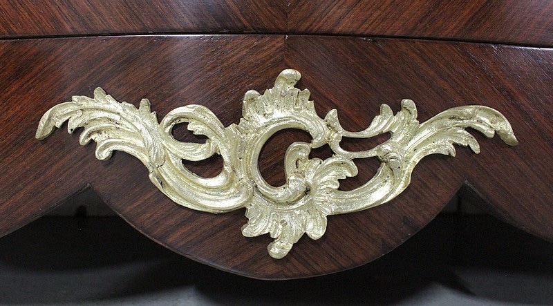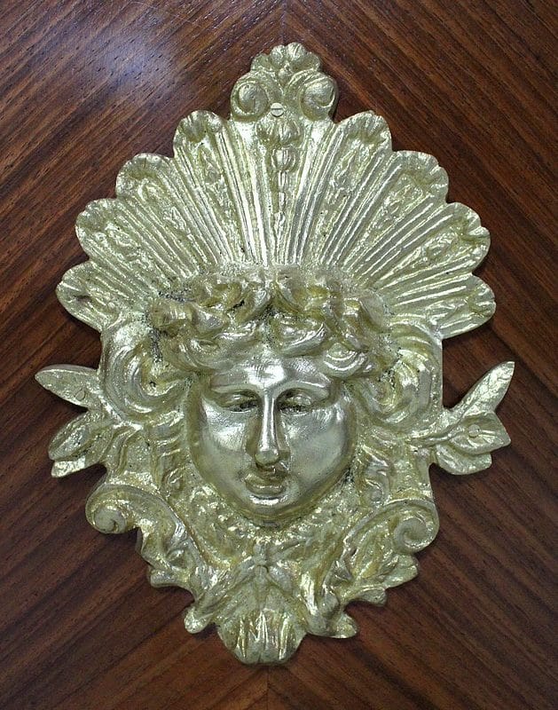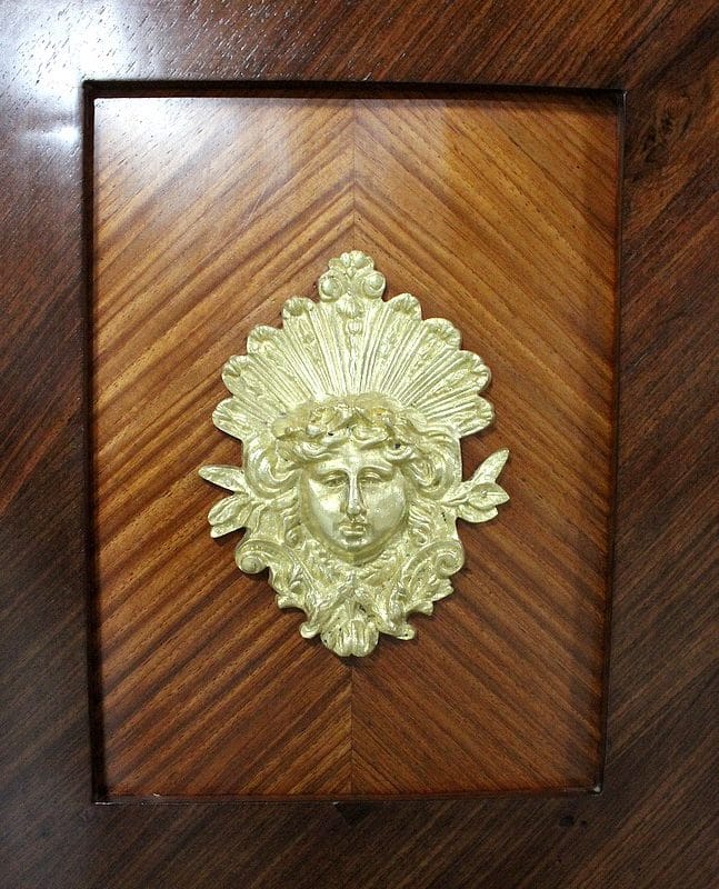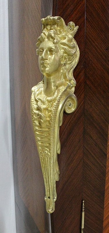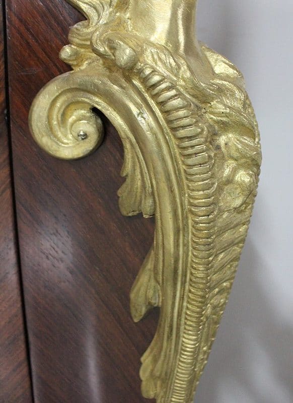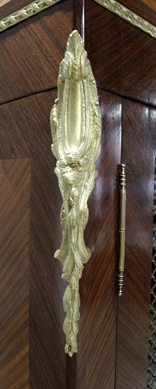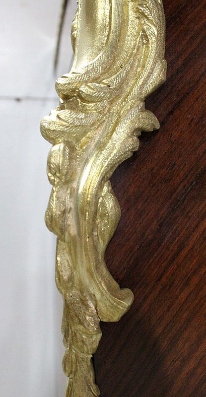 Les montants de façade sont également Généreusement ornementés, puisqu’ils arborent successivement Bronzes Feuillagés, Espagnolettes, et Sabots.