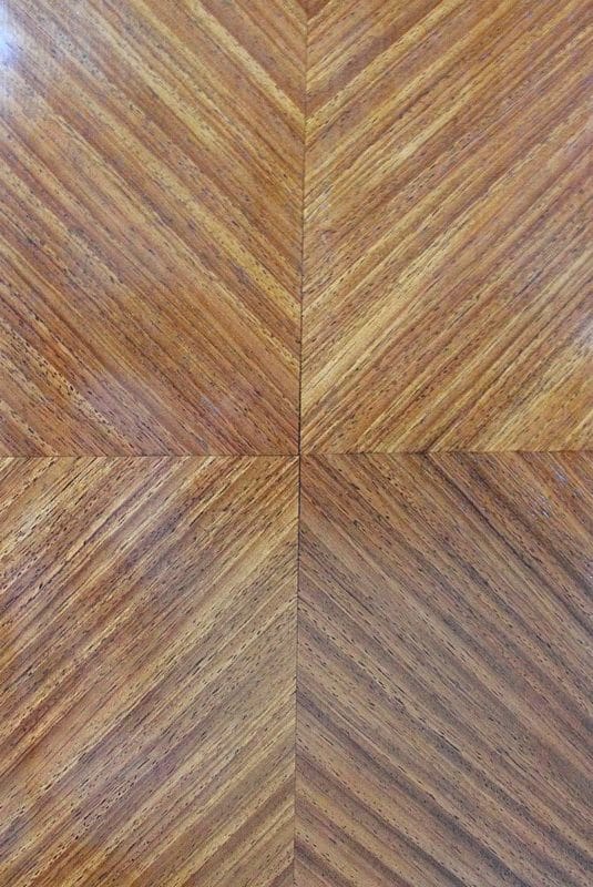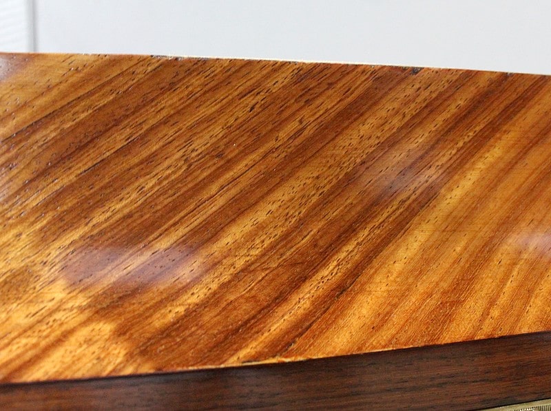 Les côtés de ce Meuble reprennent la composition décrite précédemment : Acajou Bond, plaqué en Ailes de Papillon, bordé d’un Bois plus foncé, le Bois de Violette.