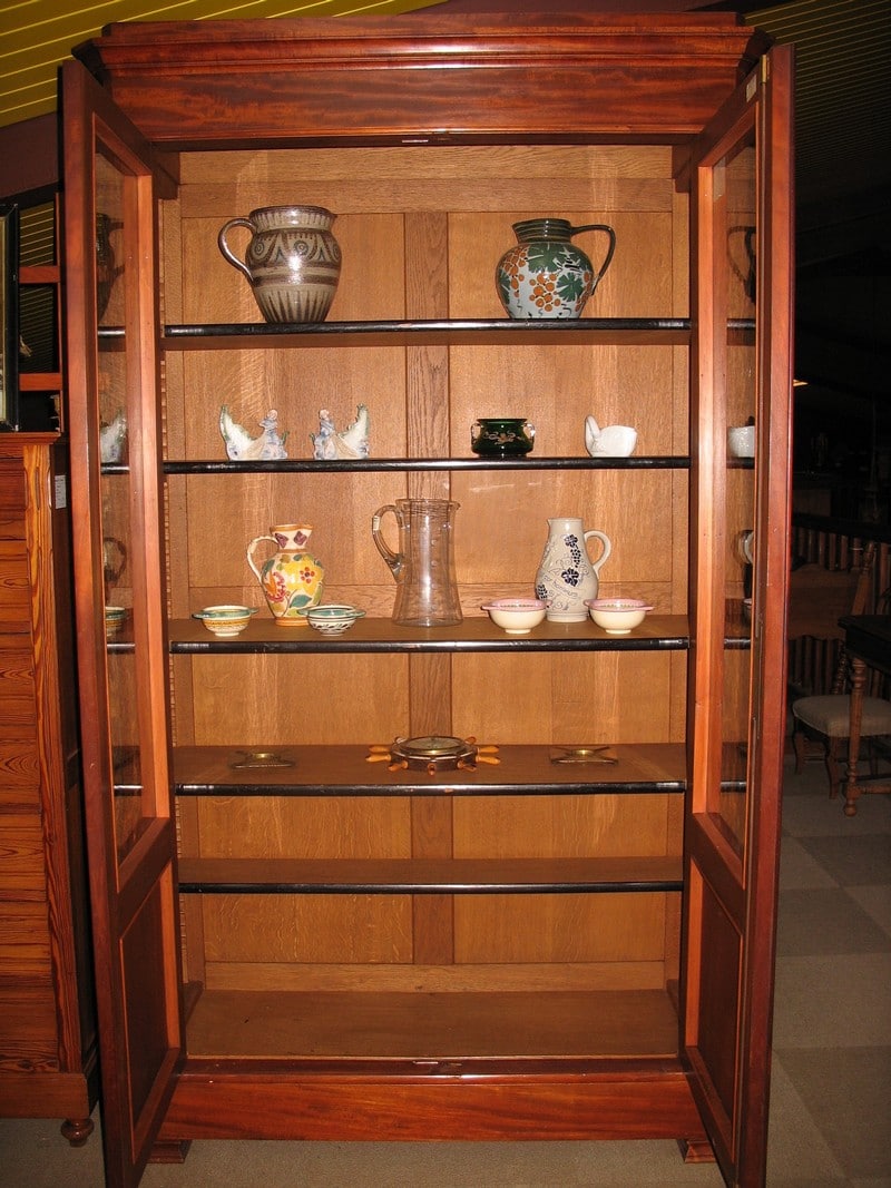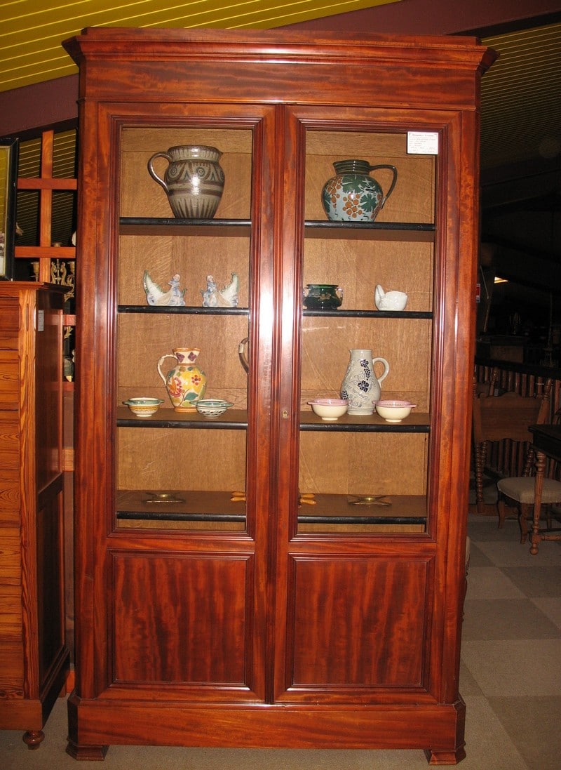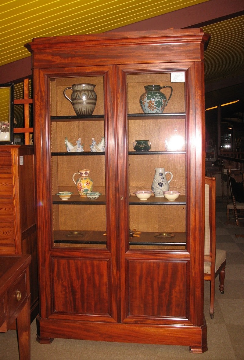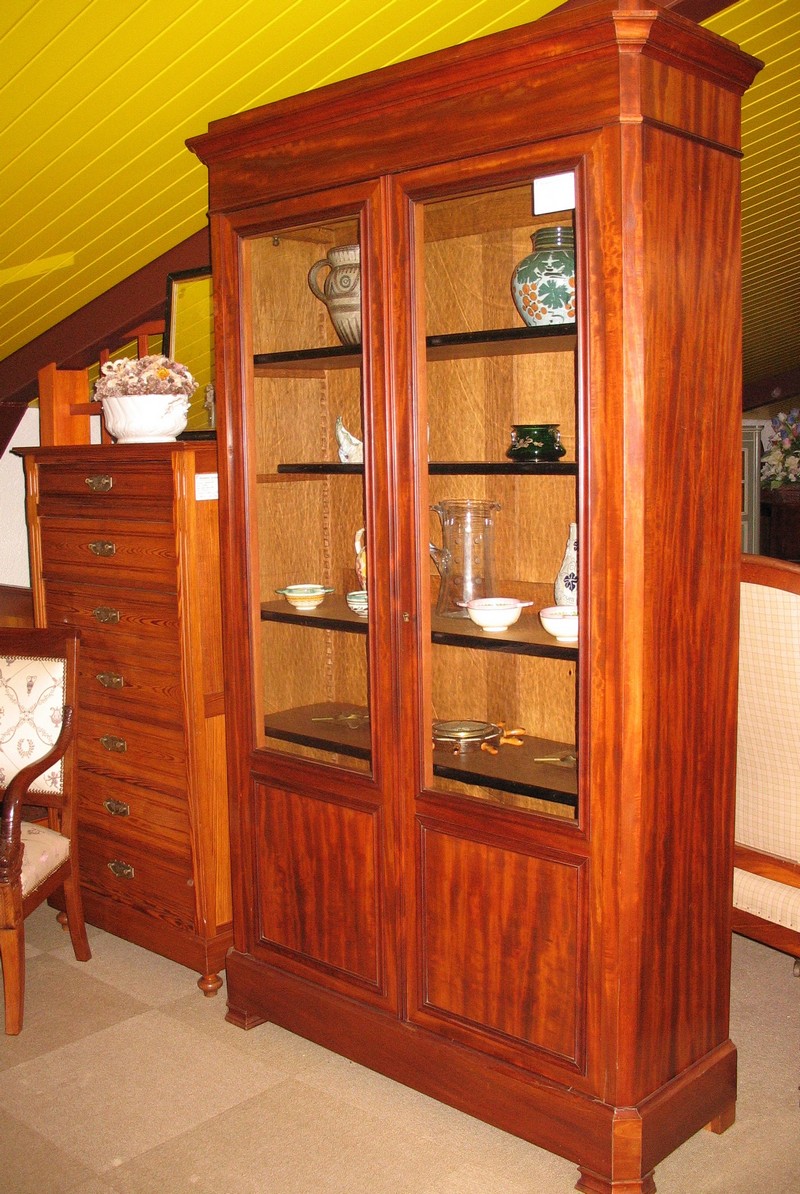 regreÉlégante Bibliothèque en acajou de la région Nantaise. L’intérieur, le fond et les étagères sont en chêne. Elle possède 3 étagères et 2 demies, sur crémaillères, dont le chant est noirci. Époque : fin XIXe.