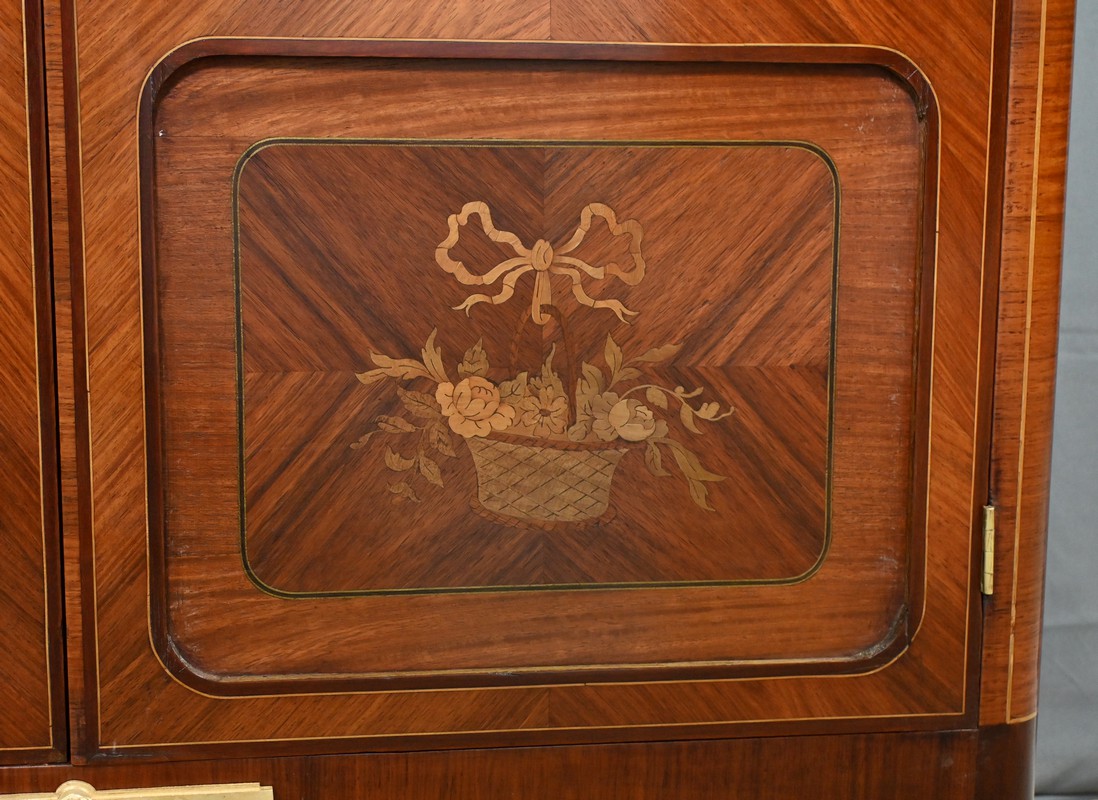 Ces portes sont délicatement soulignées par une marqueterie de bois clair, mettant en scène des décors de paniers enrubannés, un motif typique du style Louis XVI, symbole de raffinement et de délicatesse.