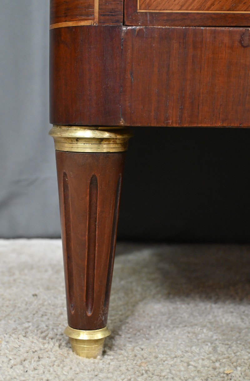 Habillée d’un placage précieux de bois de rose, d’acajou et de palissandre, elle incarne le savoir-faire raffiné et le goût du luxe discret propre à cette époque.