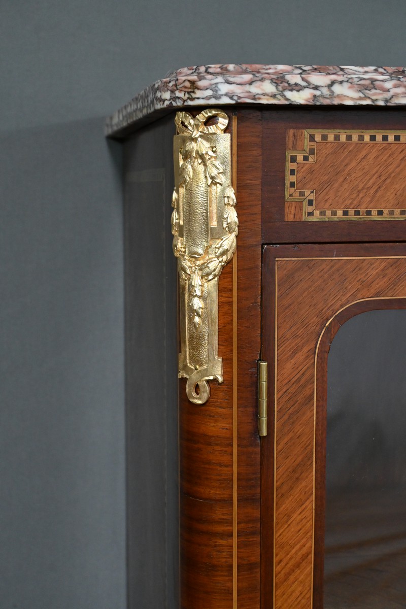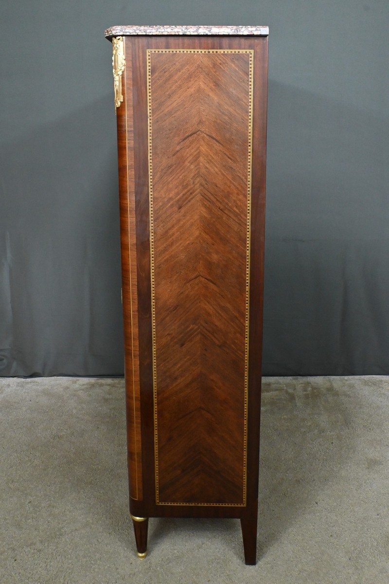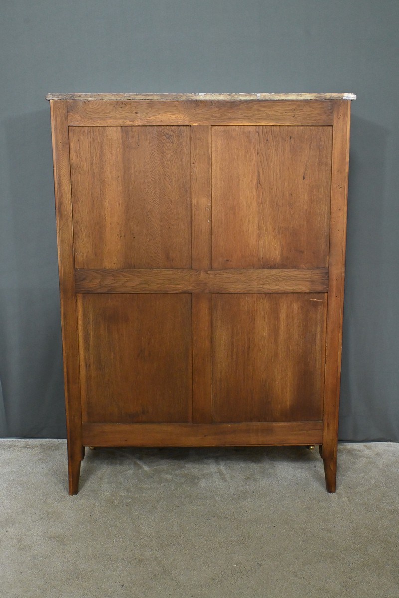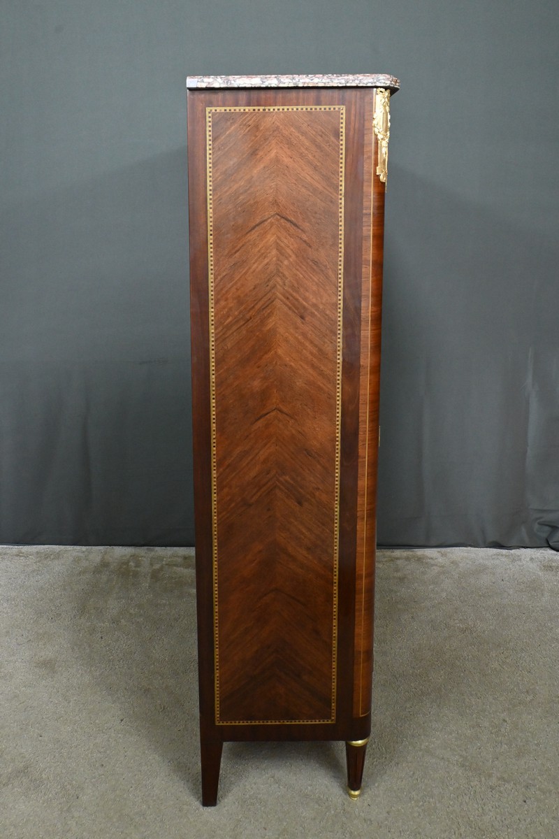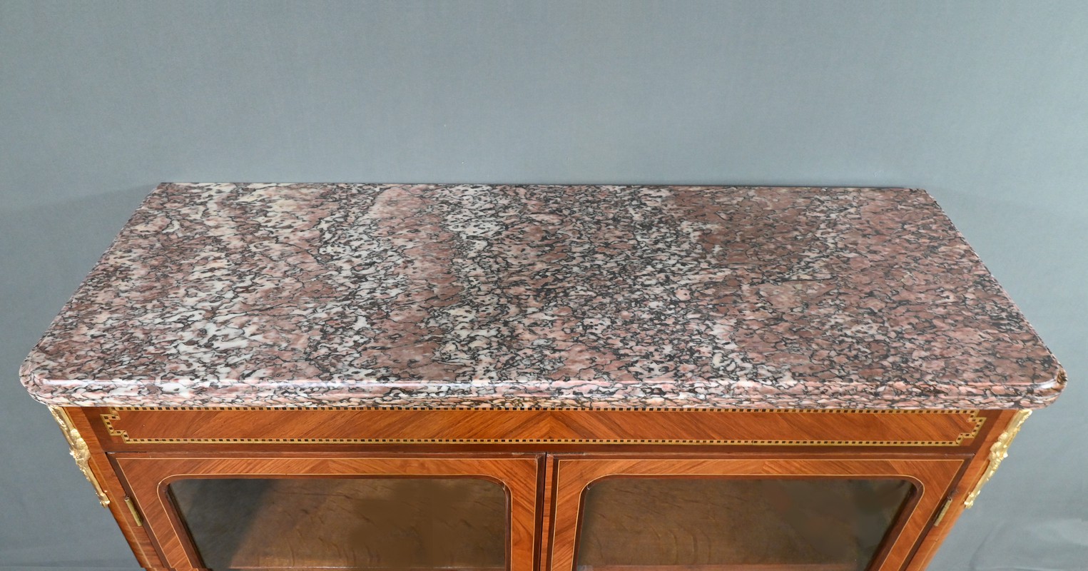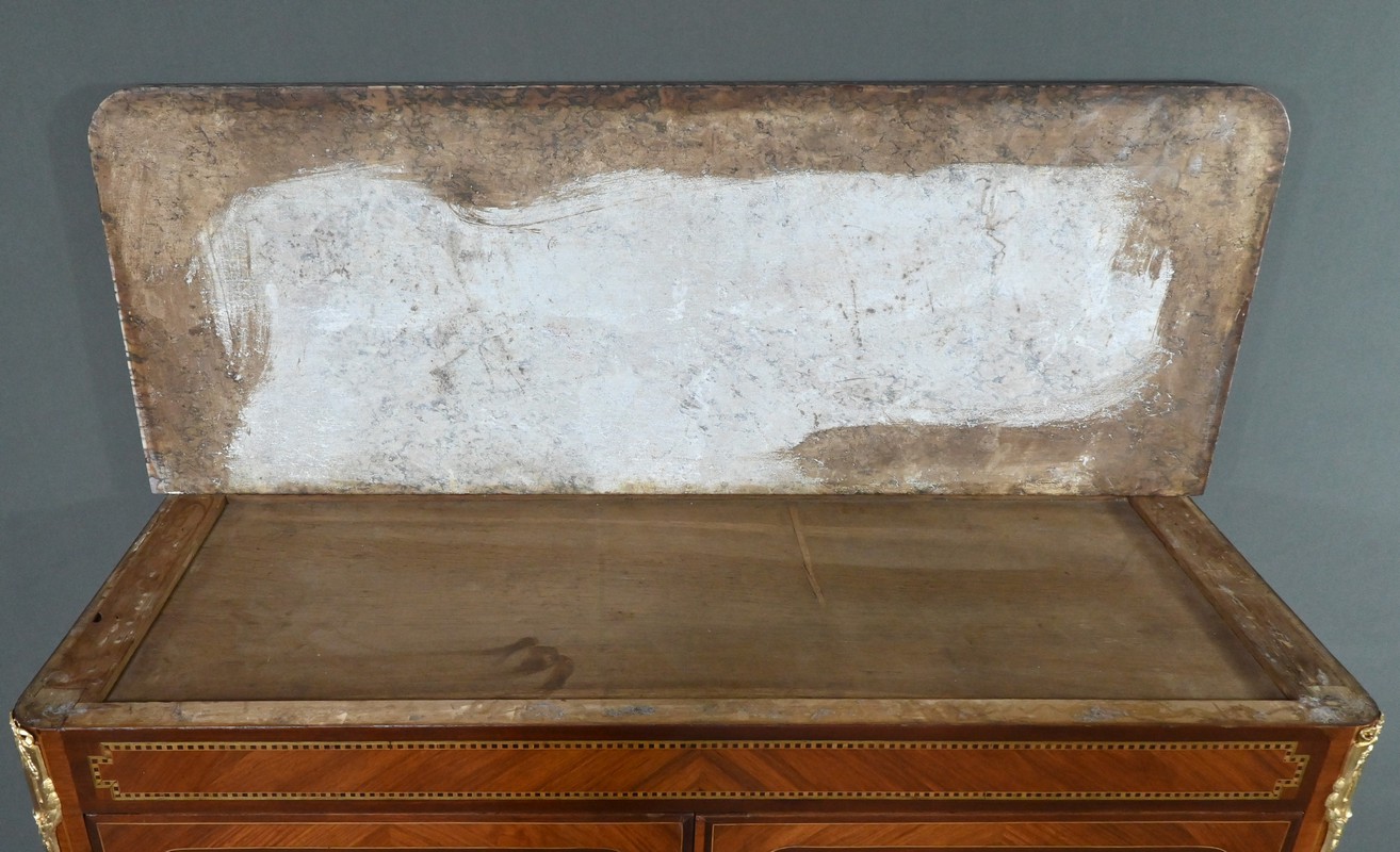 Couronnant cet ouvrage d’art, un marbre brocatelle violette du Jura, somptueux et raffiné, parachève l’ensemble, conférant au meuble une noblesse intemporelle.
