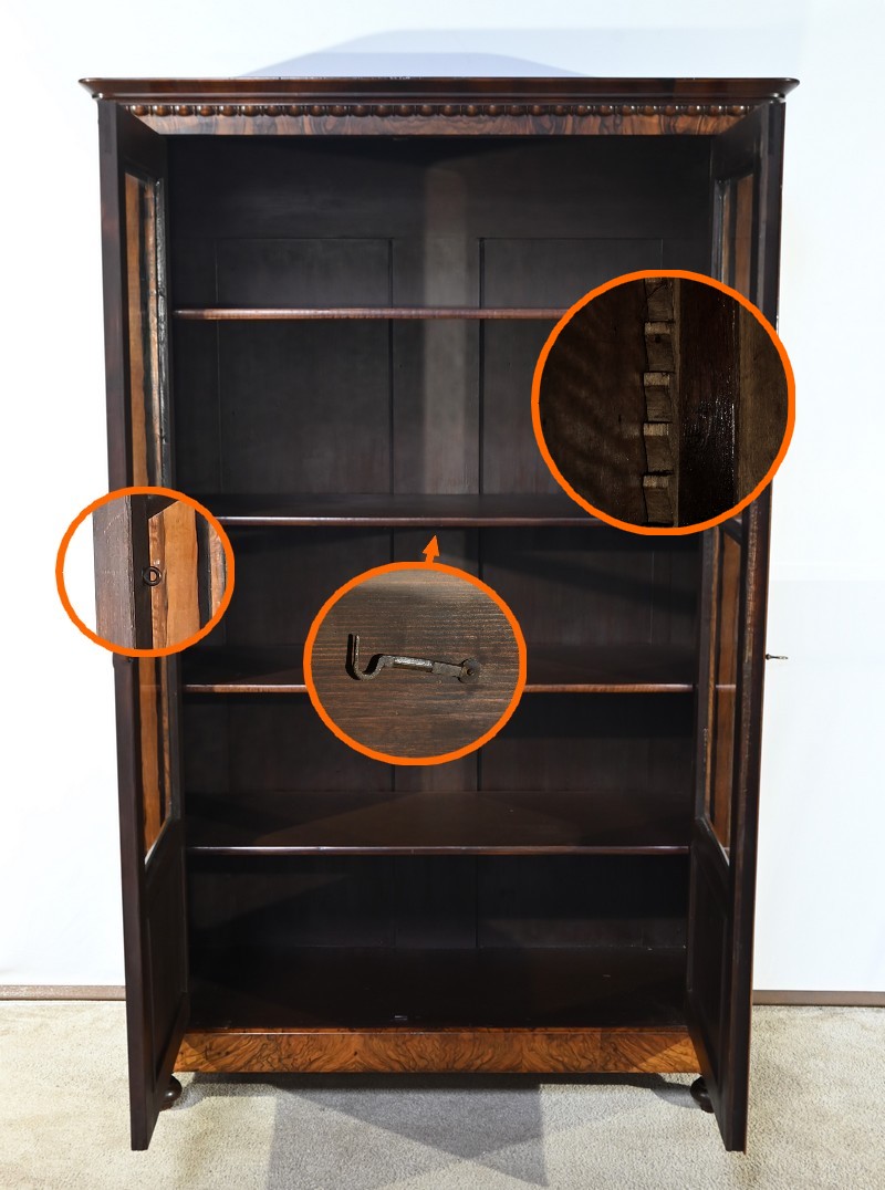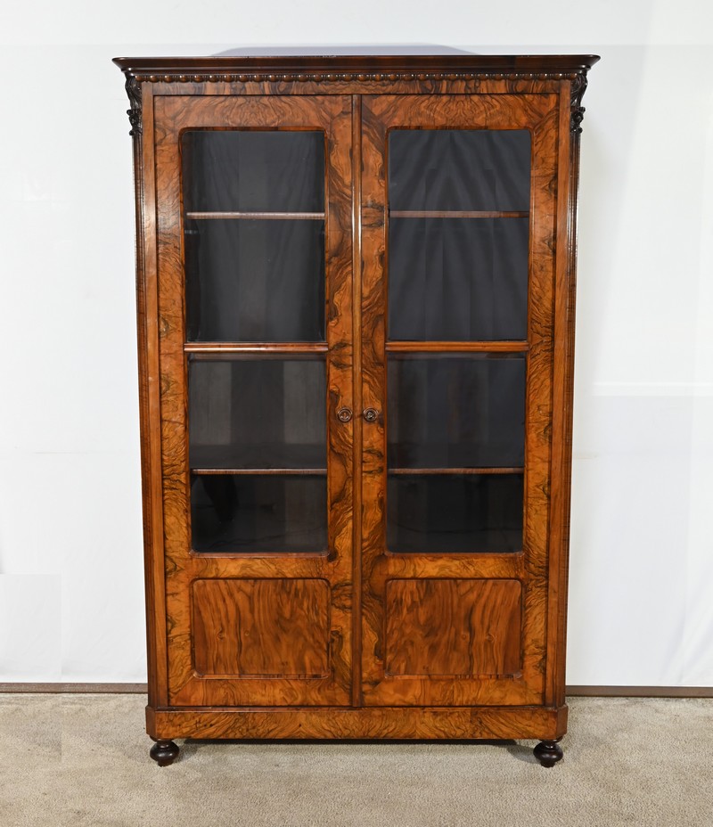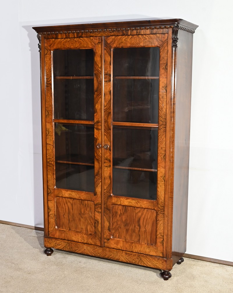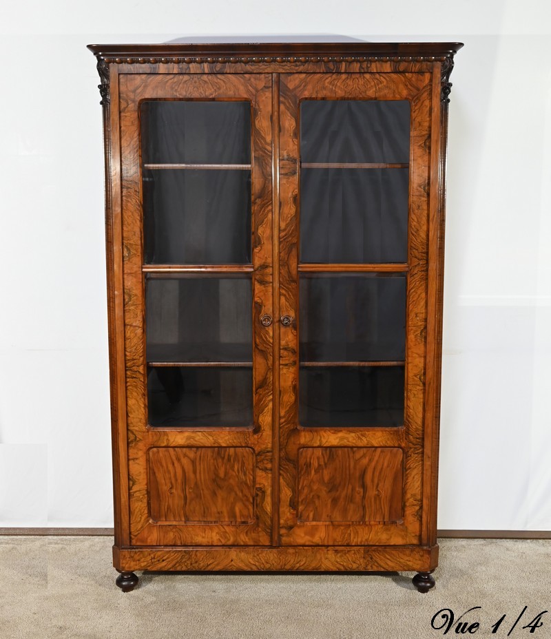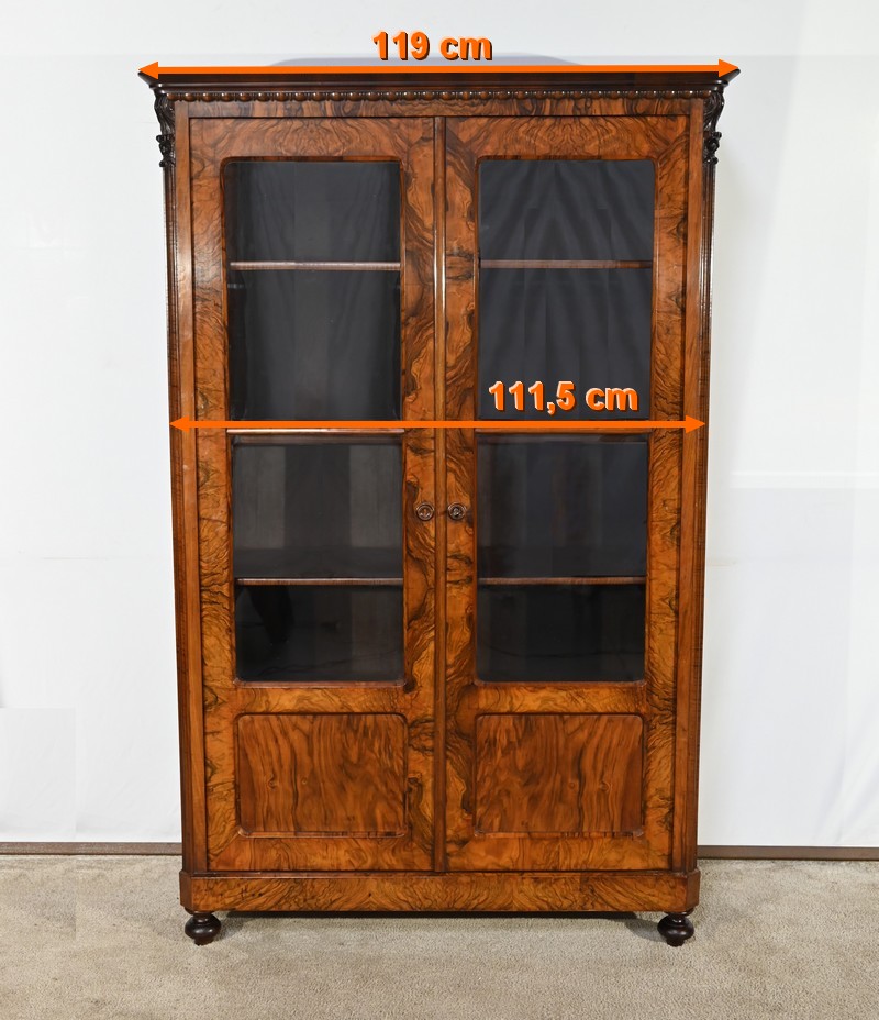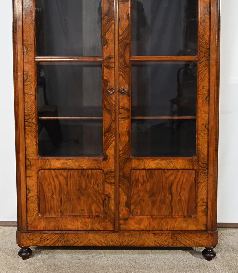 Cette bibliothèque, en ronce de noyer, ouvre par deux portes vitrées aux trois quarts avec barreaudage à double moulure, panneaux en bois vertical en partie basse et pourtour intérieur chanfreiné.