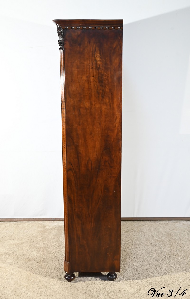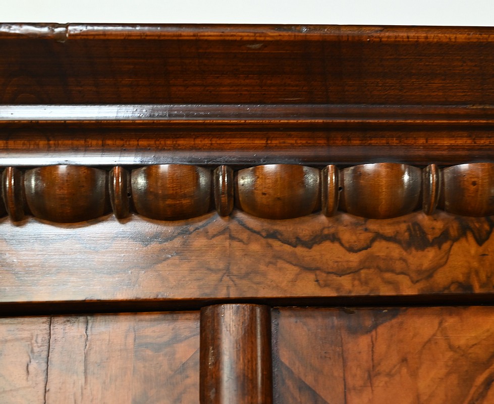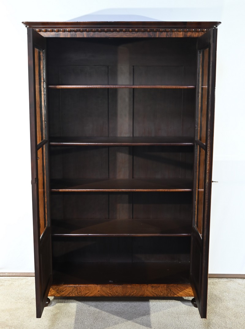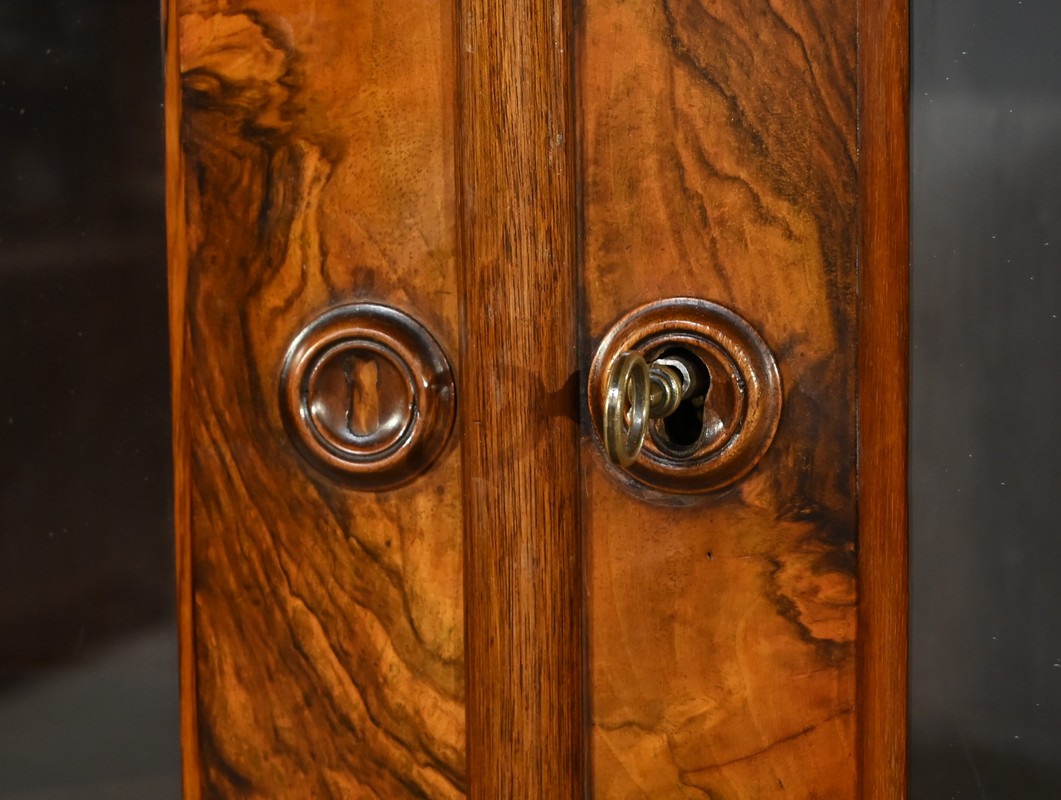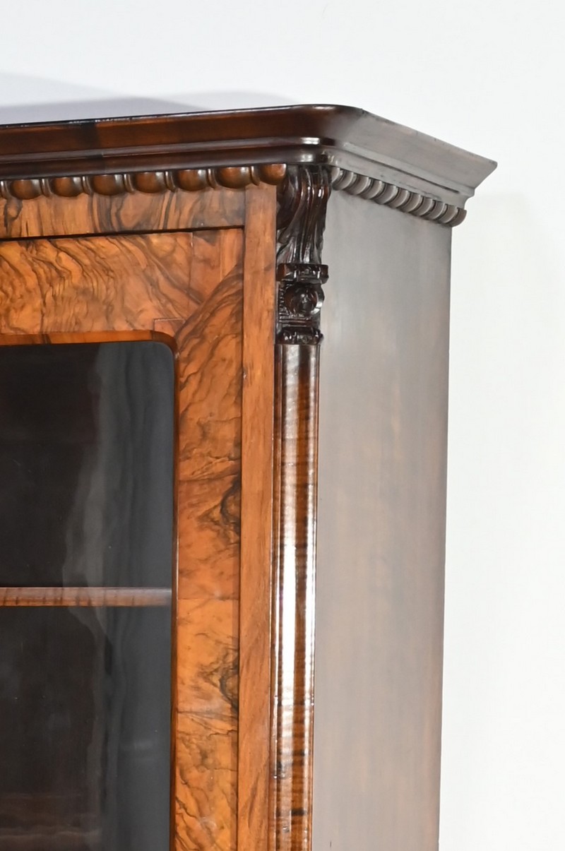 Cette bibliothèque, en ronce de noyer, ouvre par deux portes vitrées aux trois quarts avec barreaudage à double moulure, panneaux en bois vertical en partie basse et pourtour intérieur chanfreiné.