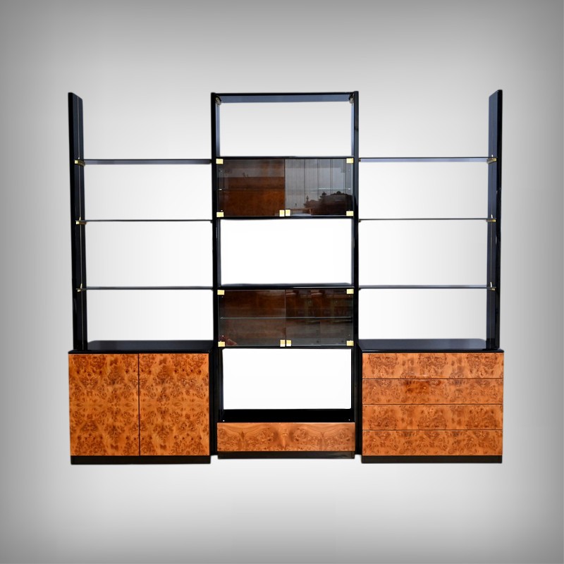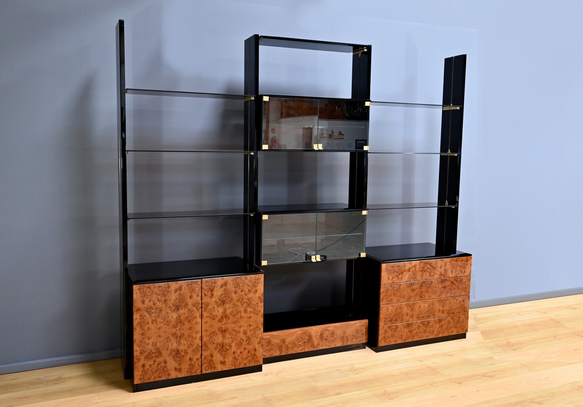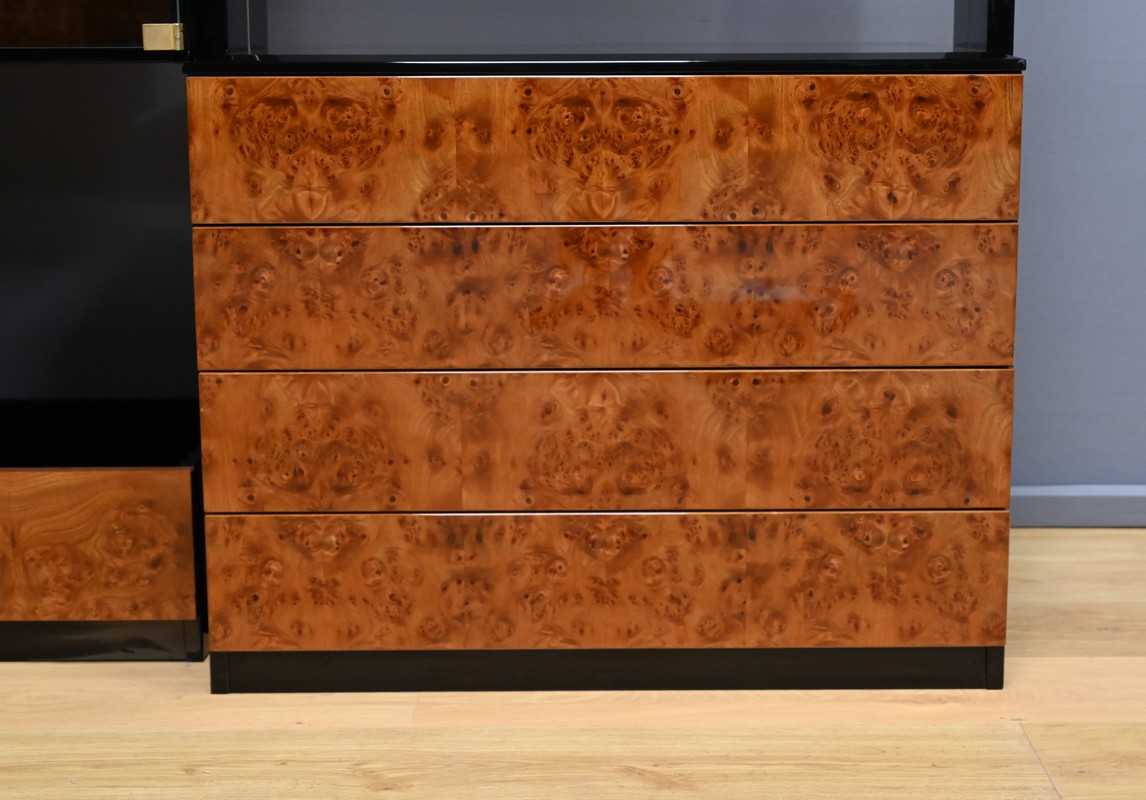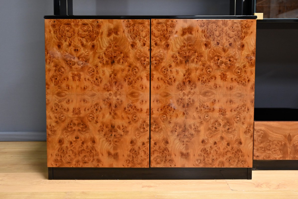 Le meuble bibliothèque en loupe d’orme, réalisé dans les ateliers de Paul Michel à Bressuire dans la 2eme partie du