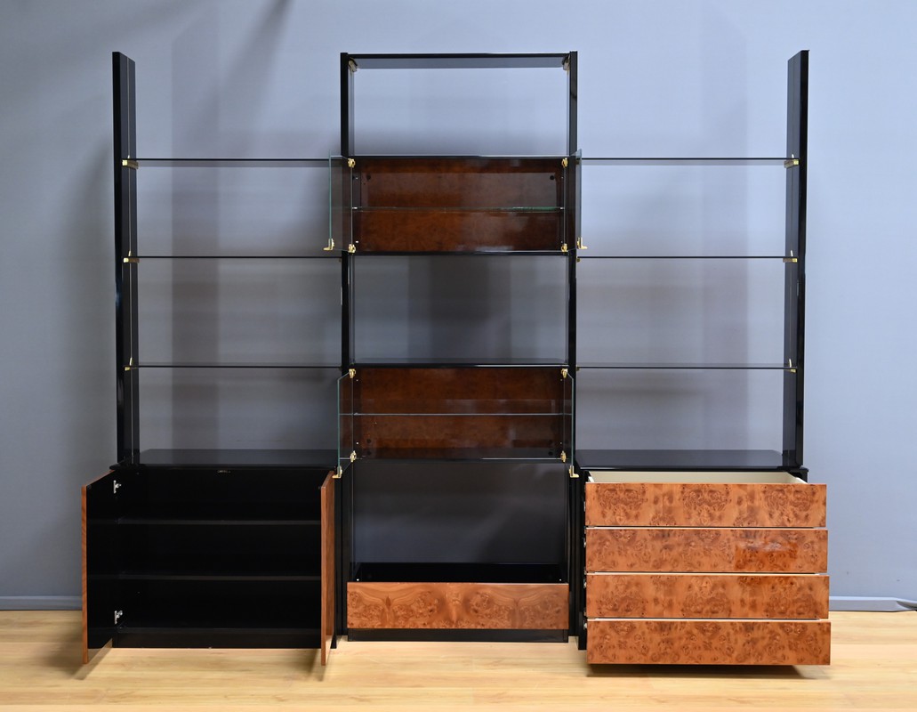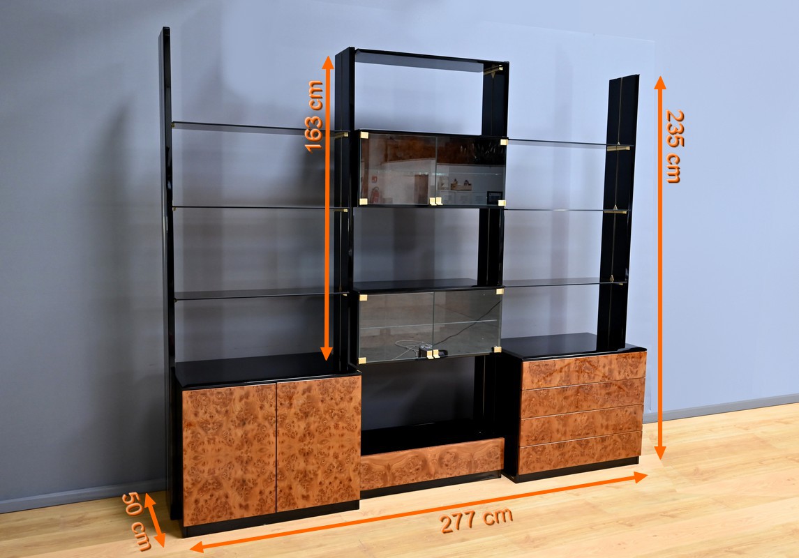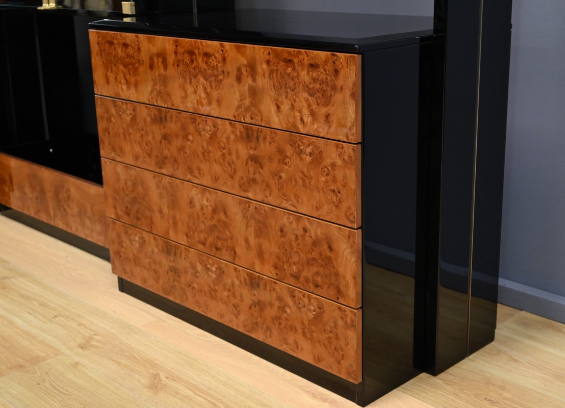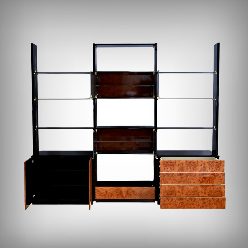 Le meuble bibliothèque en loupe d’orme, réalisé dans les ateliers de Paul Michel à Bressuire dans la 2eme partie du