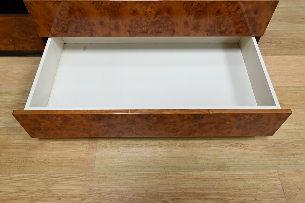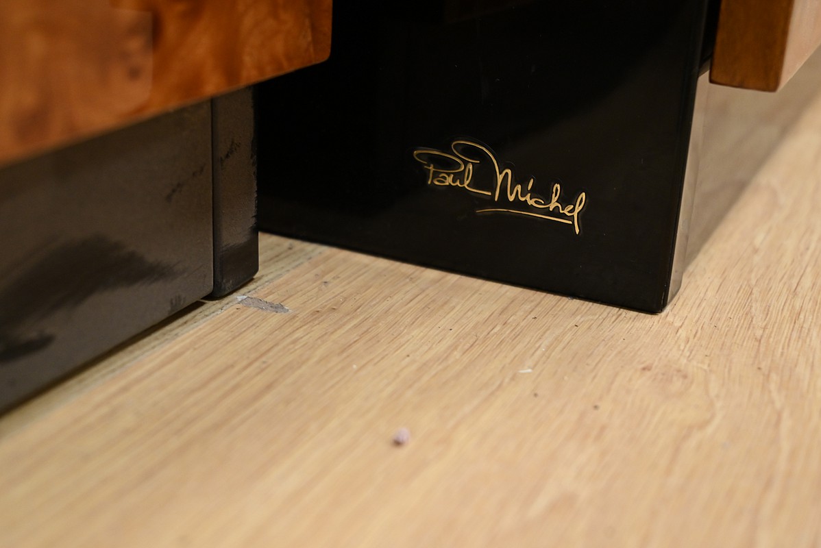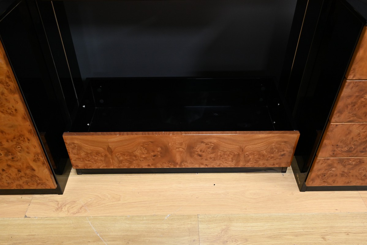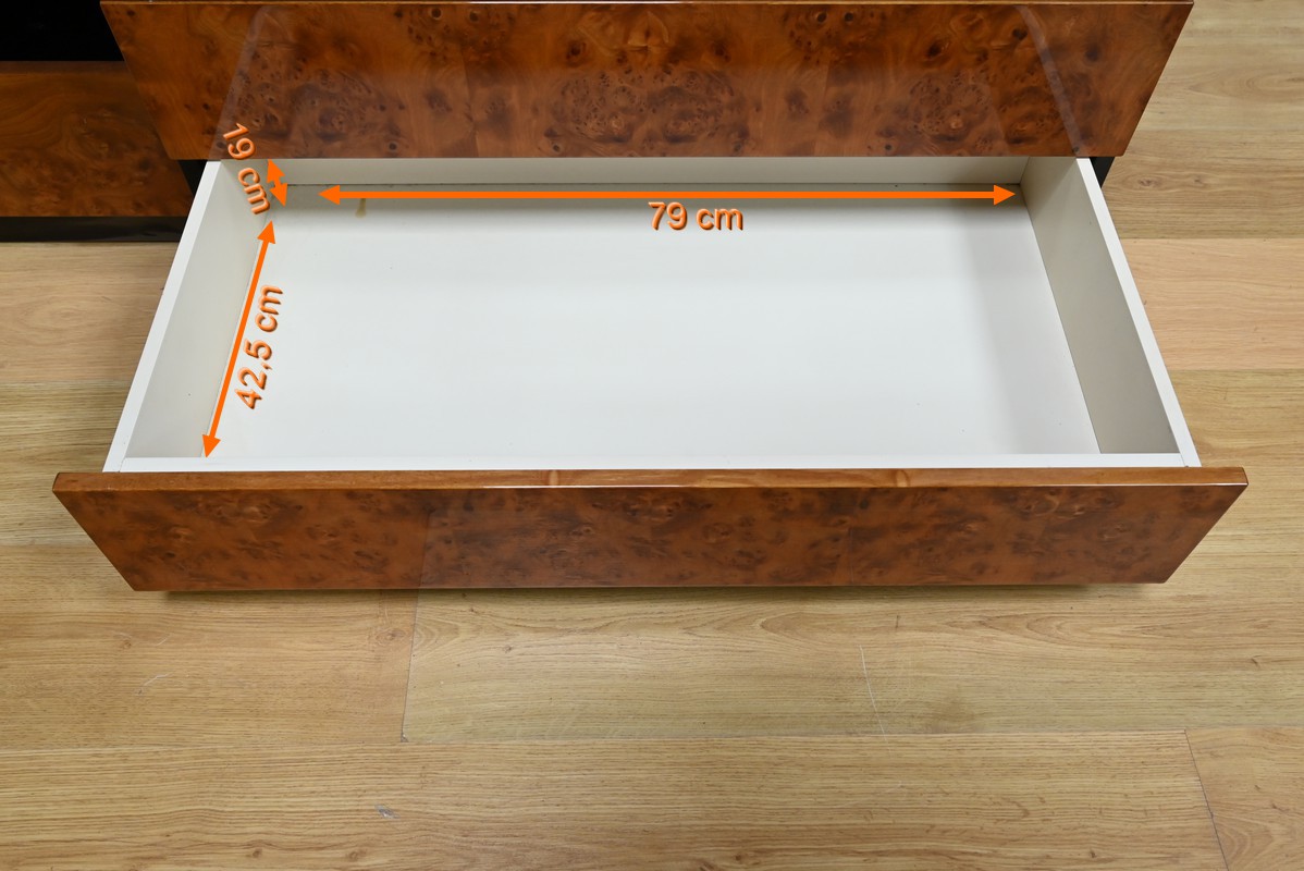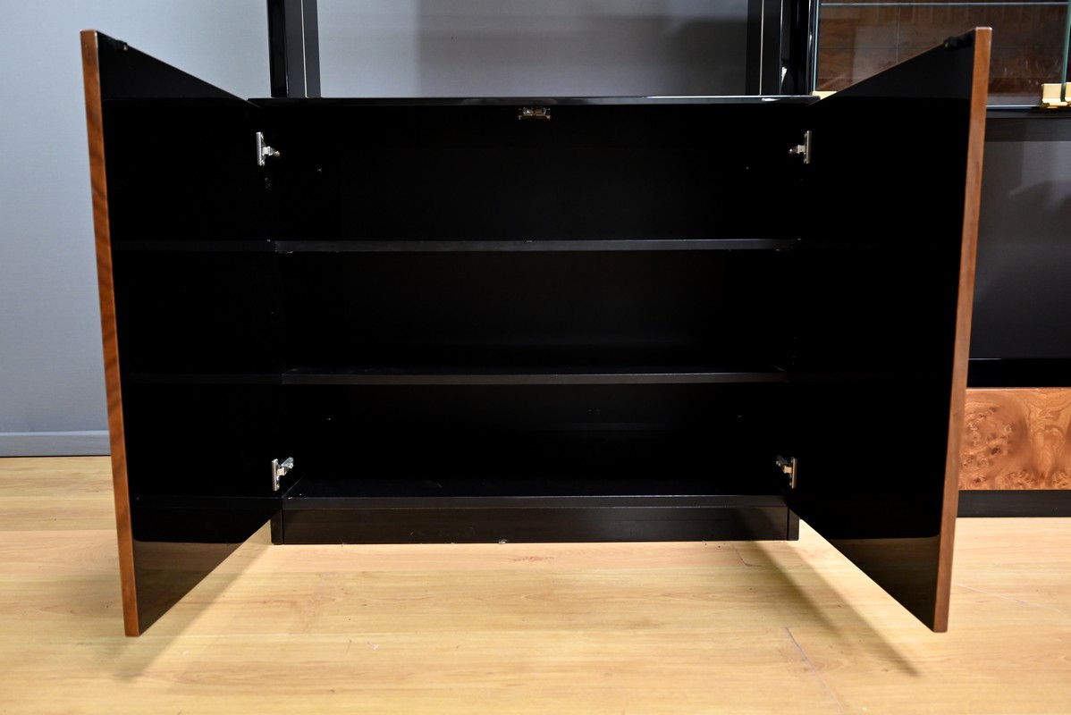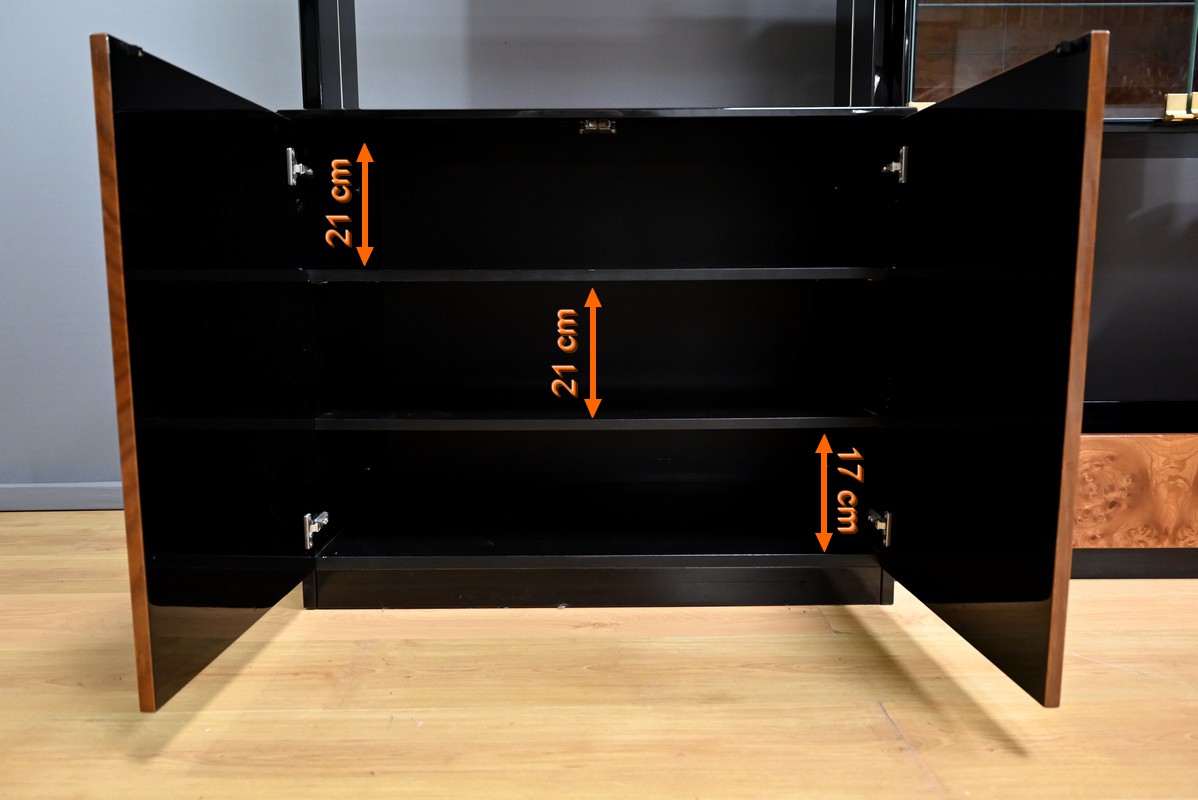 Sa conception soignée met en valeur le raffinement du bois précieux, sublimé par un vernis polyester et une laque noire, qui lui confèrent une finition brillante et sophistiquée.