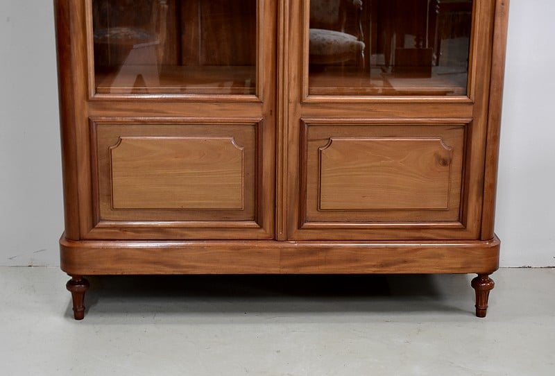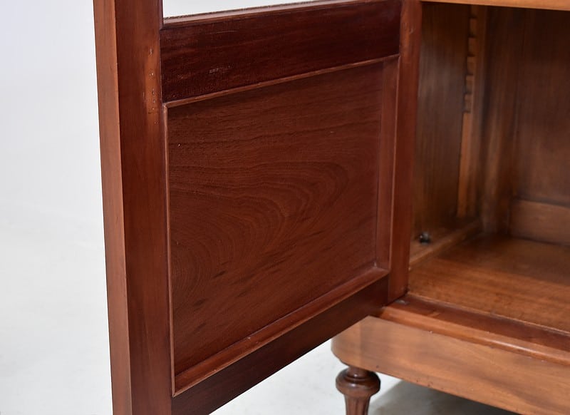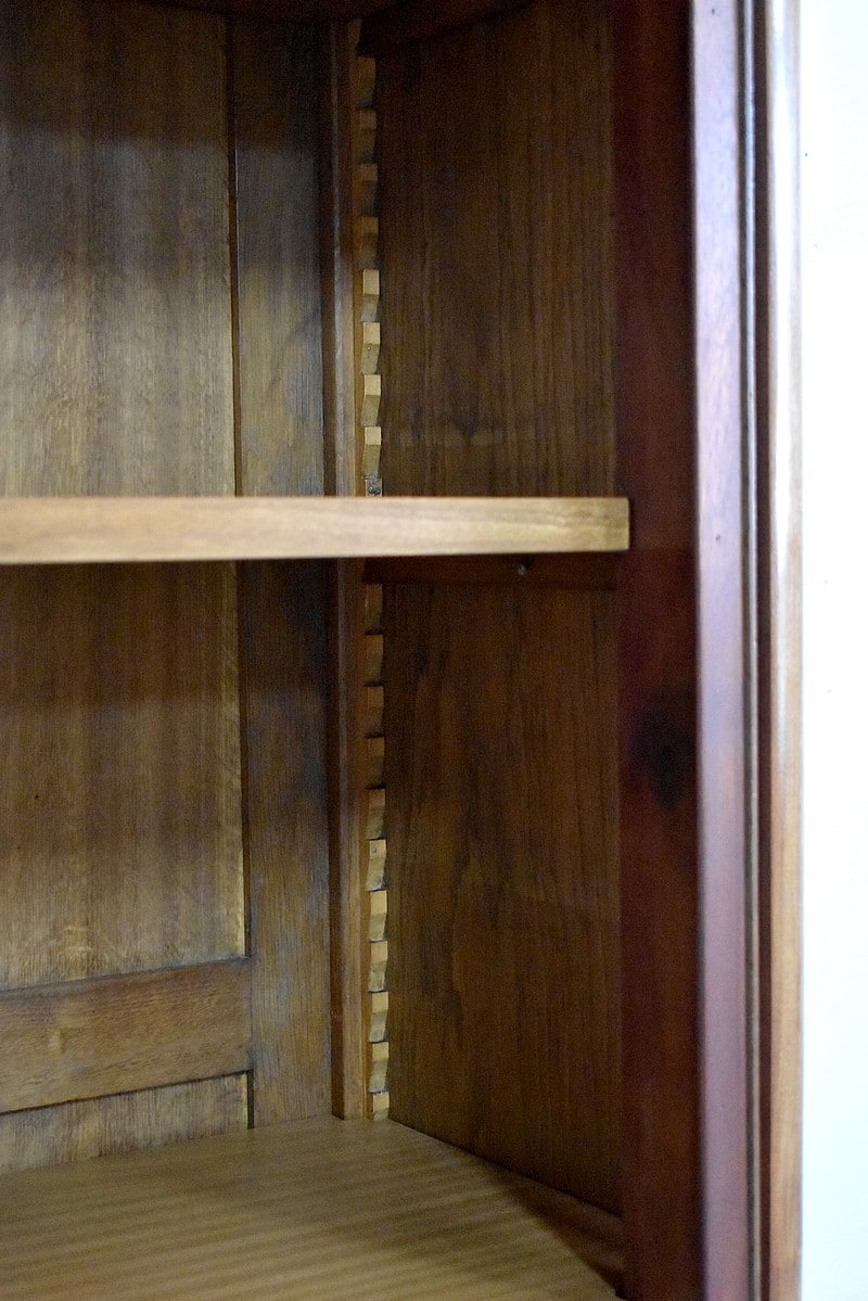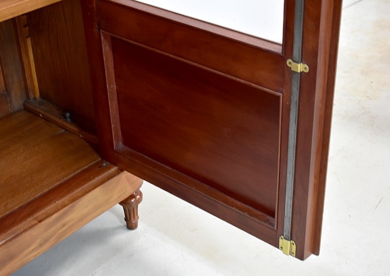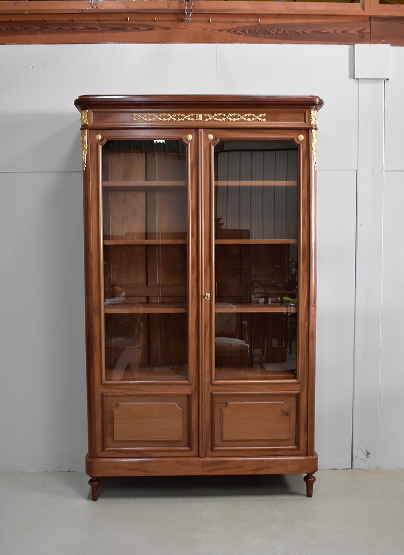Elle ouvre par deux portes vitrées avec fermeture à serrure haut et bas donnant sur 4 étagères en acajou massif d’une épaisseur de 2,5 cm. Ces dernières amovibles sont posées sur crémaillères permettant le choix de leur répartition. La partie basse des portes est à larges plates-bandes à reliefs moulurés.