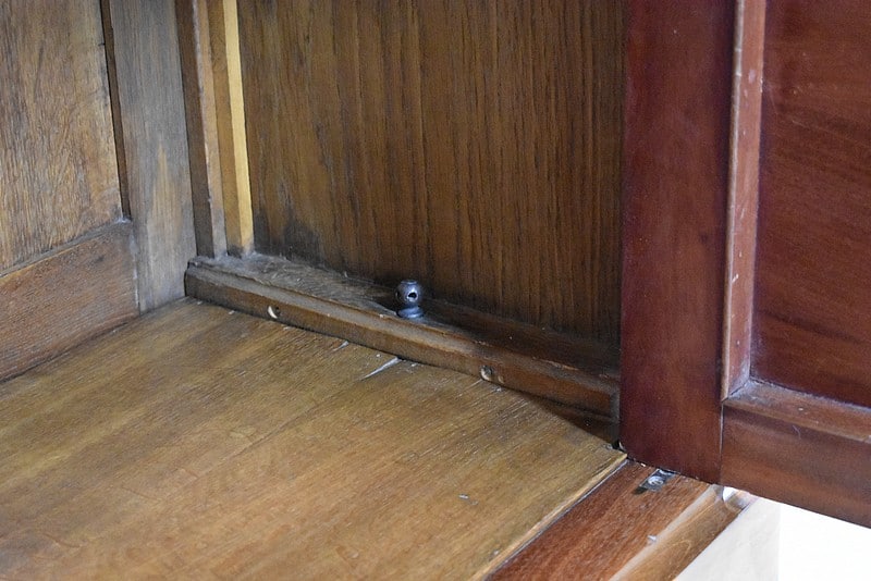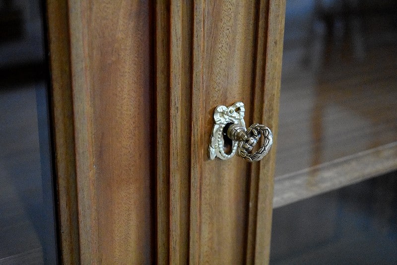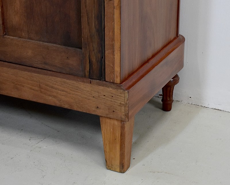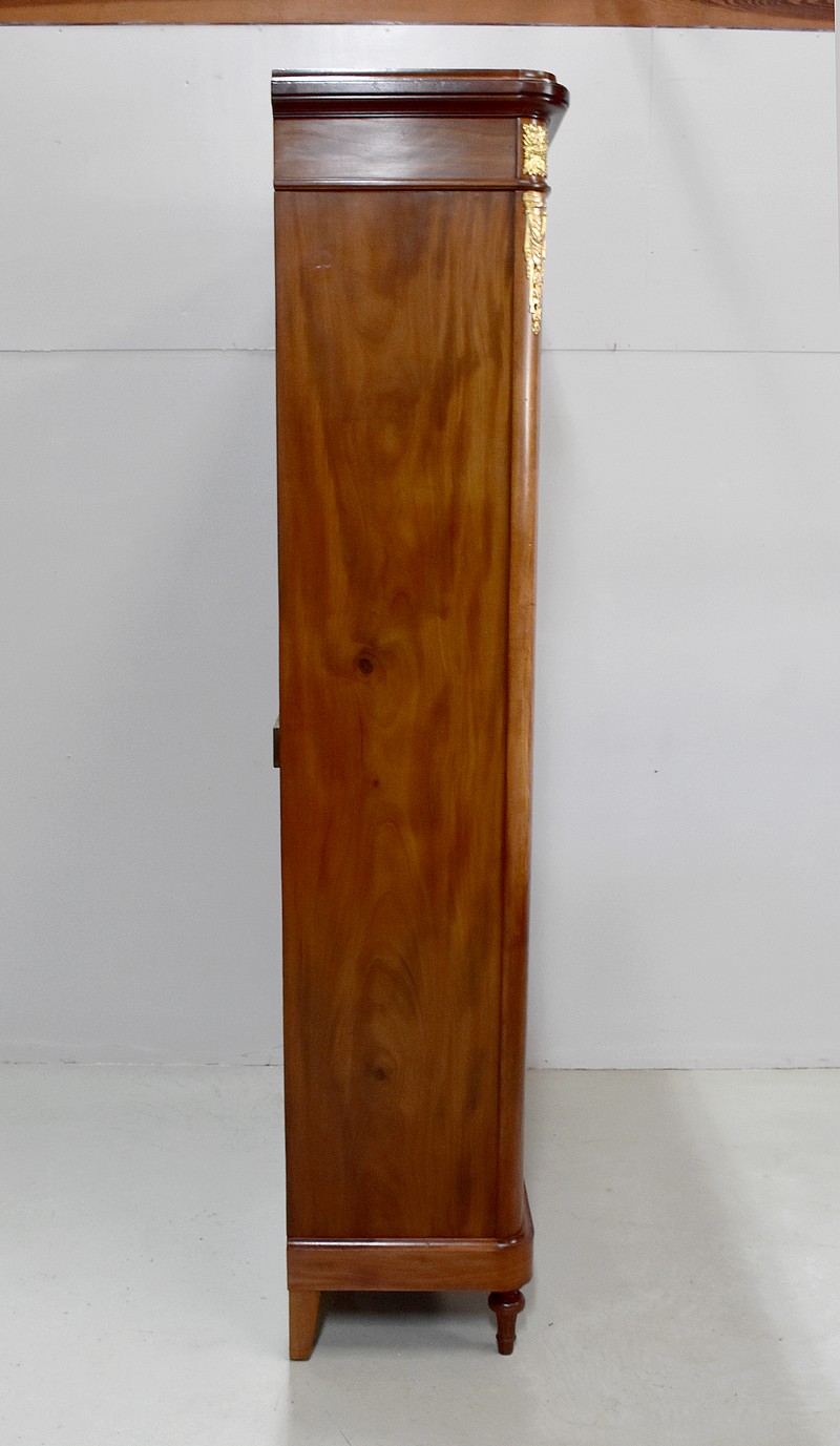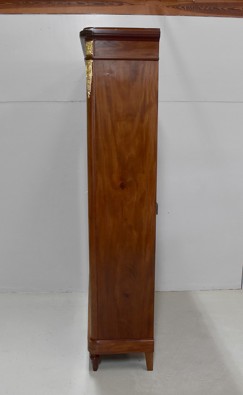 Elle ouvre par deux portes vitrées avec fermeture à serrure haut et bas donnant sur 4 étagères en acajou massif d’une épaisseur de 2,5 cm. Ces dernières amovibles sont posées sur crémaillères permettant le choix de leur répartition. La partie basse des portes est à larges plates-bandes à reliefs moulurés.